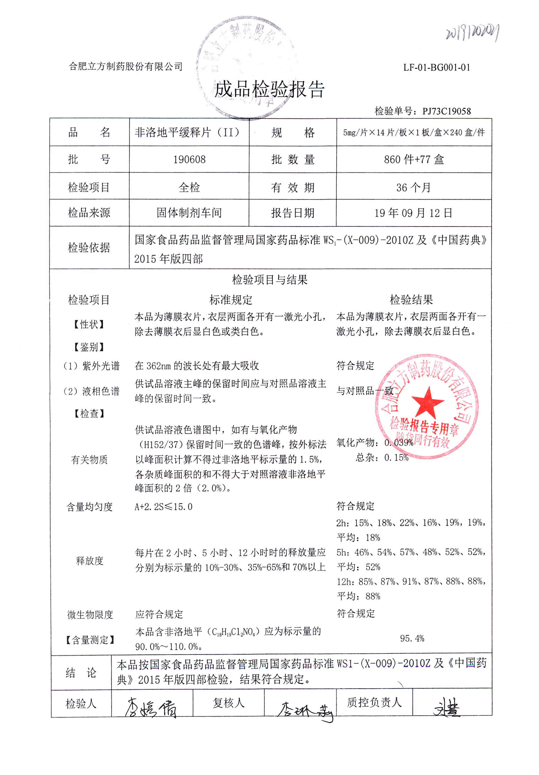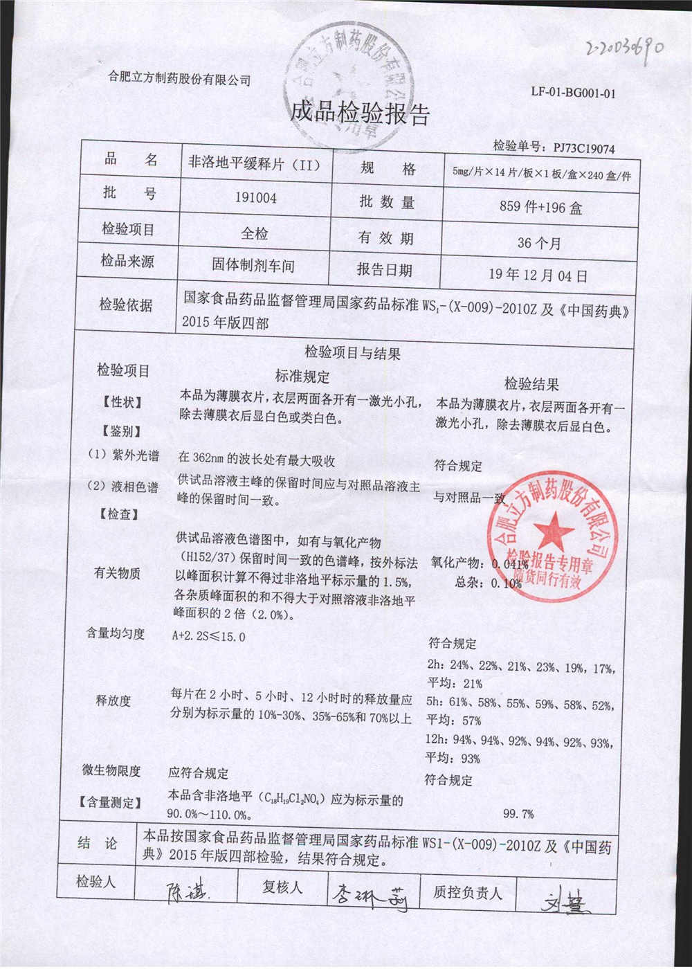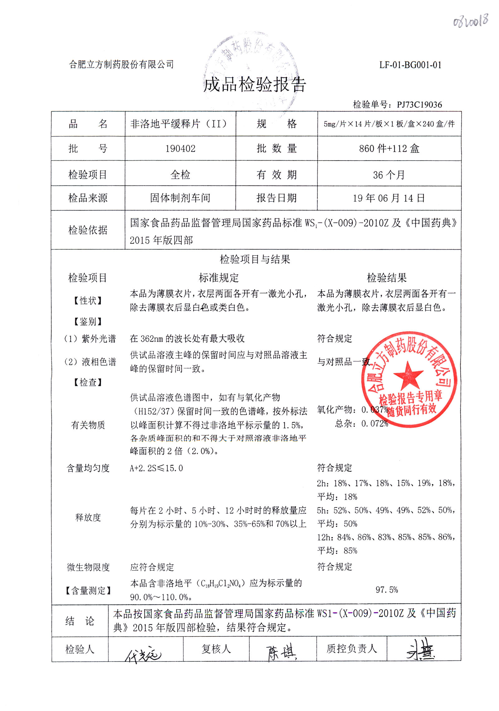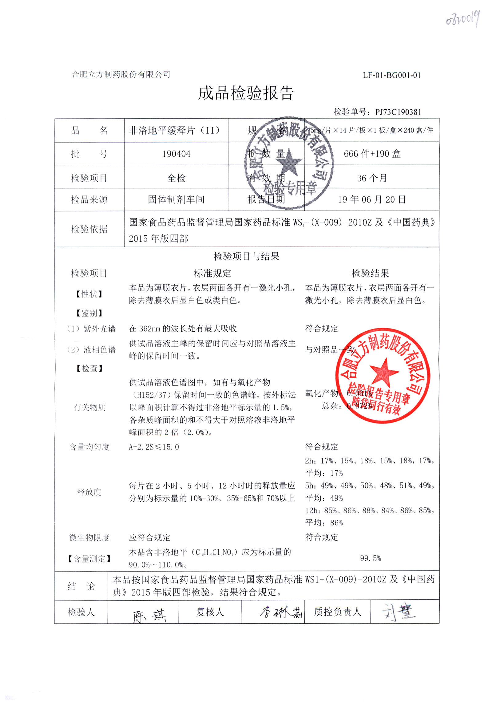 | 非洛地平緩釋片 | 5mg*14s | 190607 | 查看詳情 |