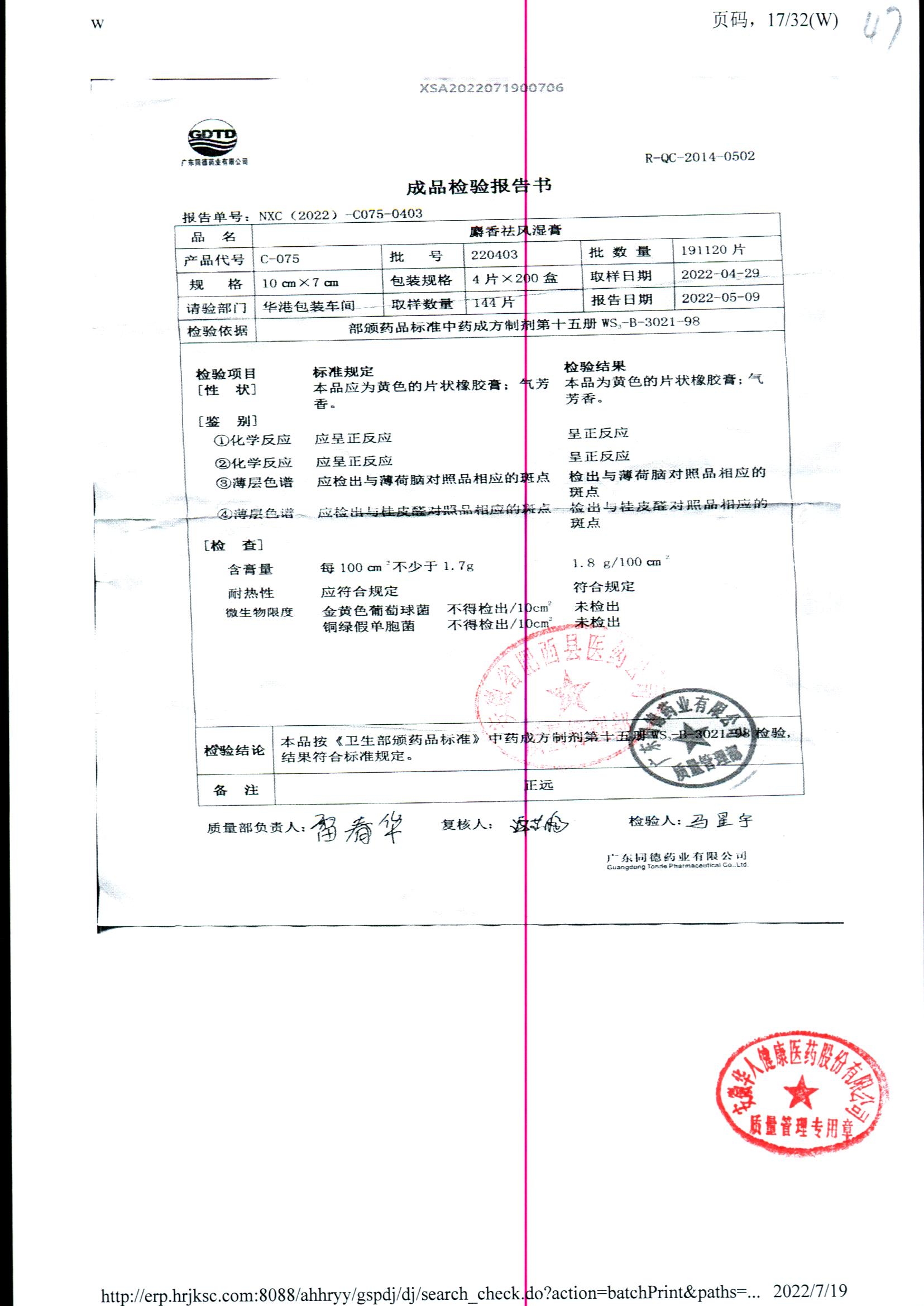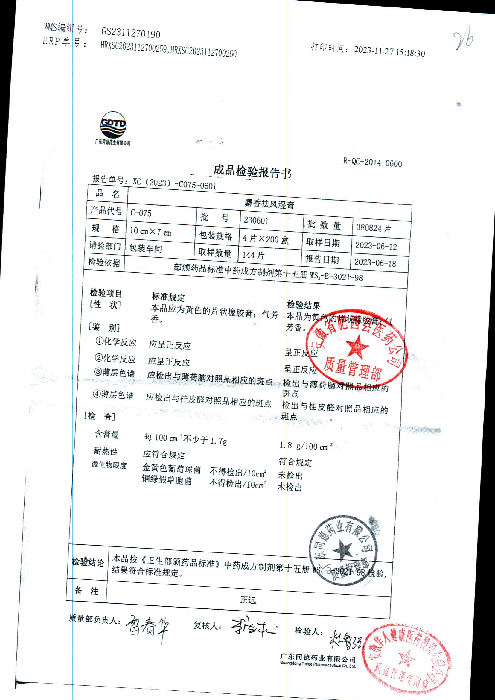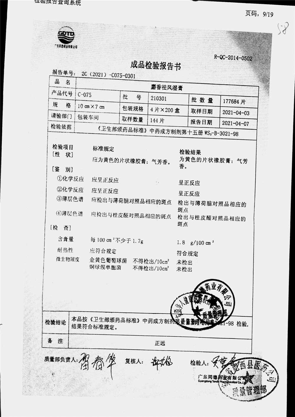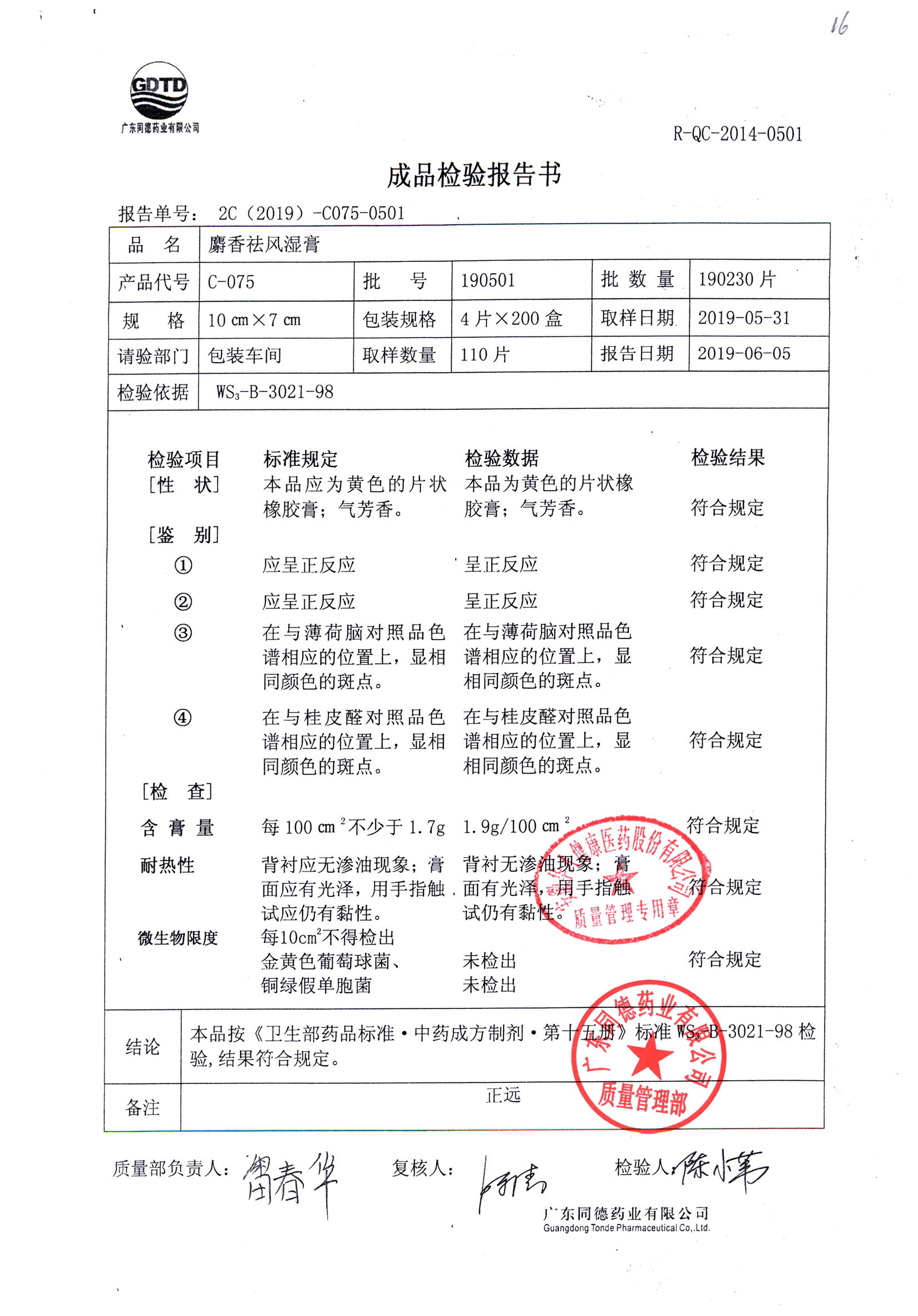 | 麝香祛風(fēng)濕膏 | 10cm*7cm*4片 | 20181001 | 查看詳情 |