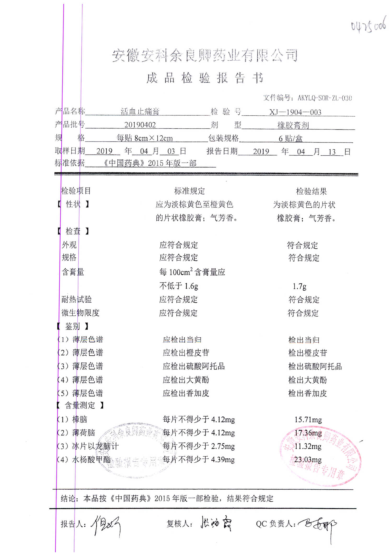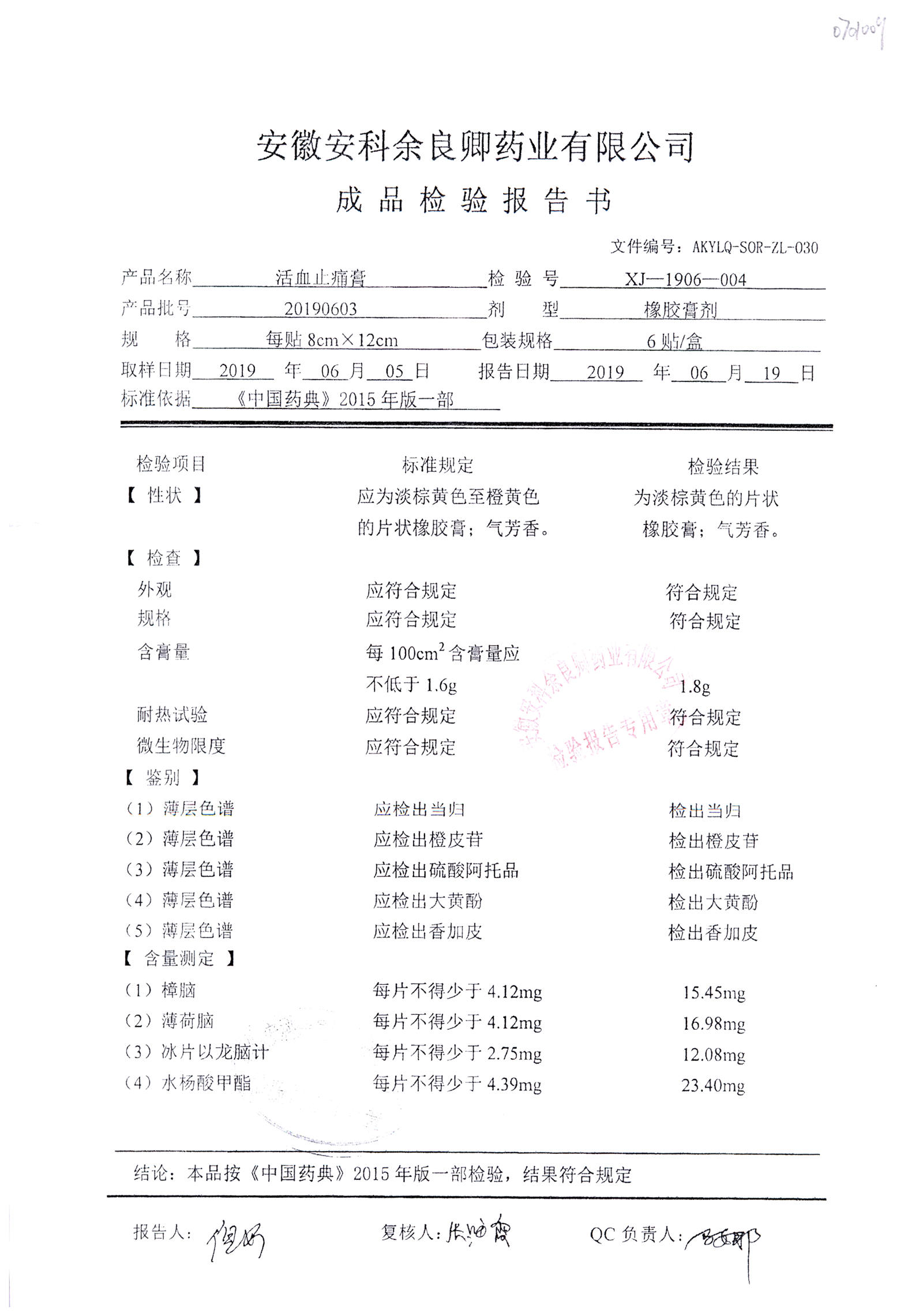 | 活血止痛膏 | 8cm*12cm*6貼 | 20190603 | 查看詳情 |