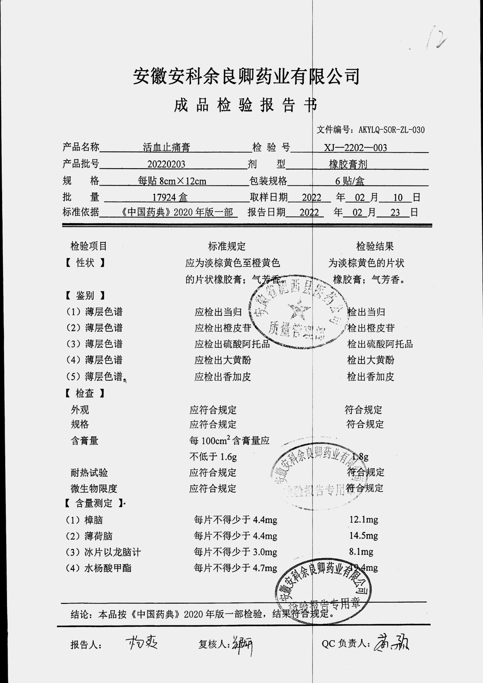 | 活血止痛膏 | 8cm*12cm*6貼 | 20220203 | 查看詳情 |