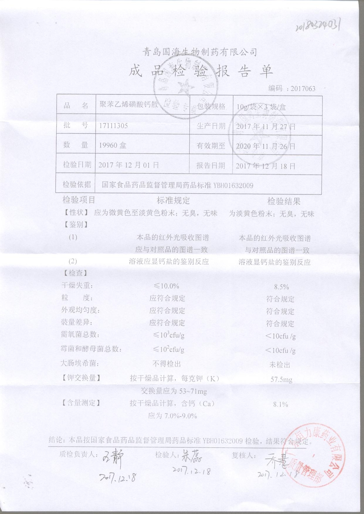聚苯乙烯磺酸鈣散 10g*3袋 17121301 查看詳情