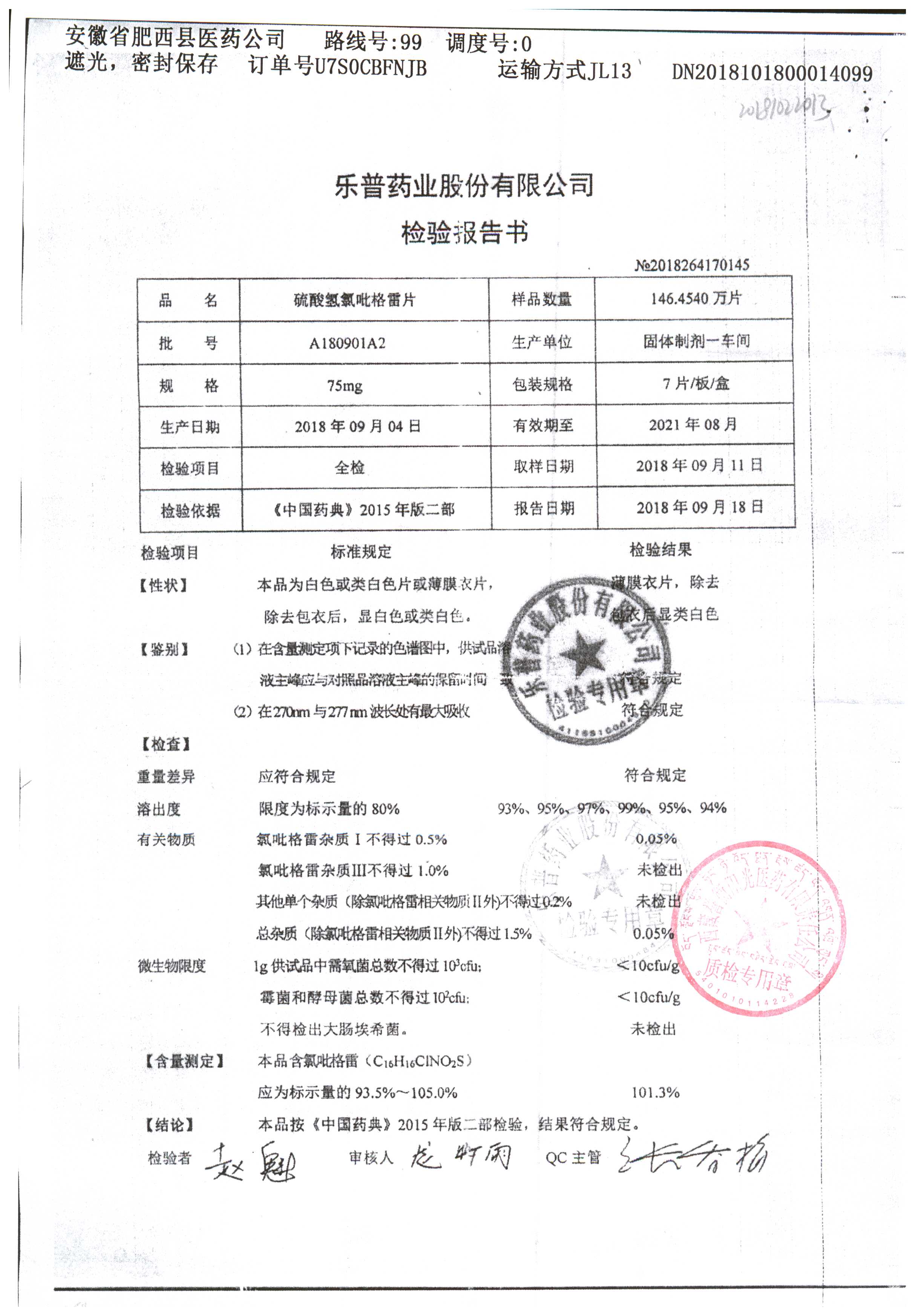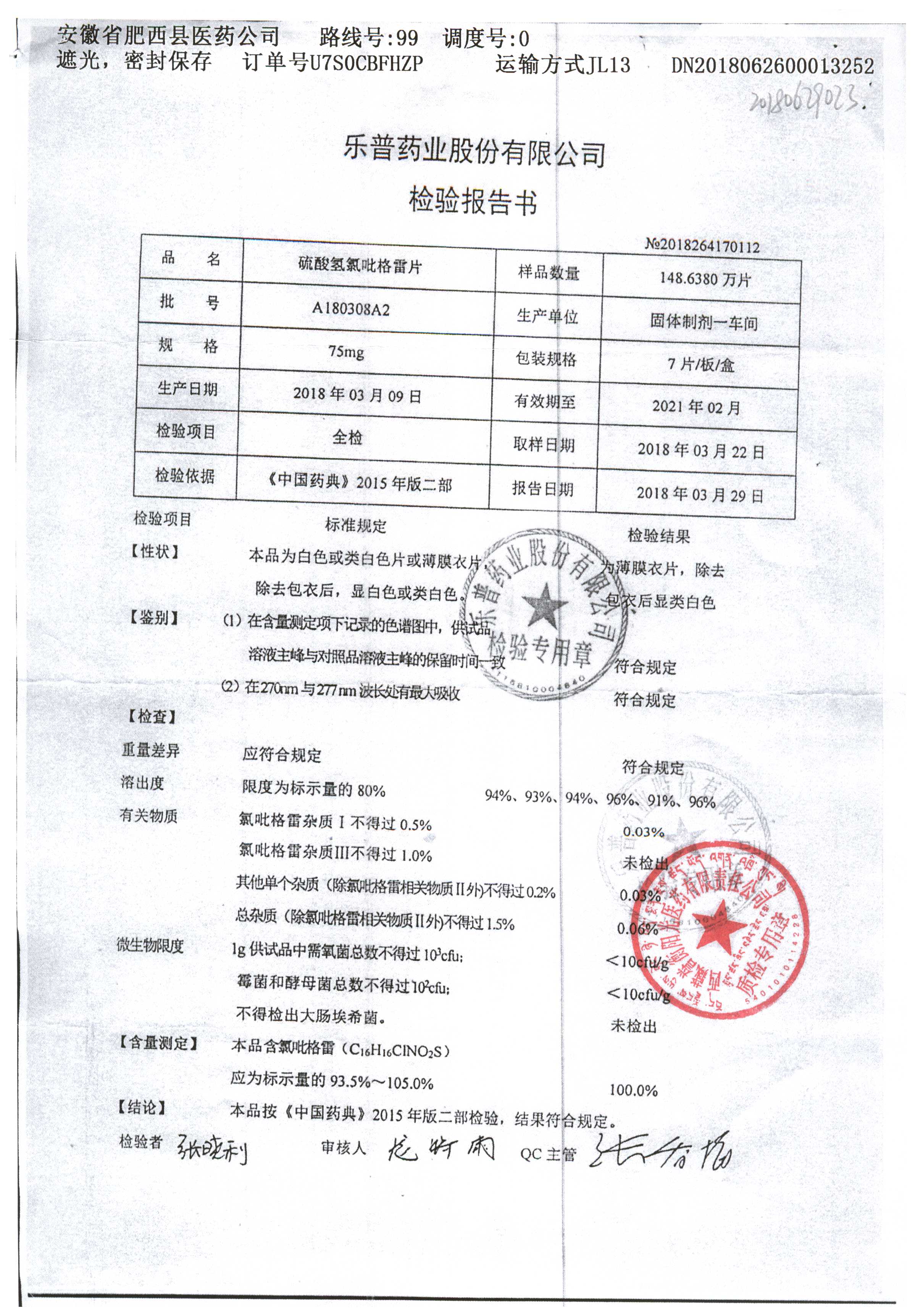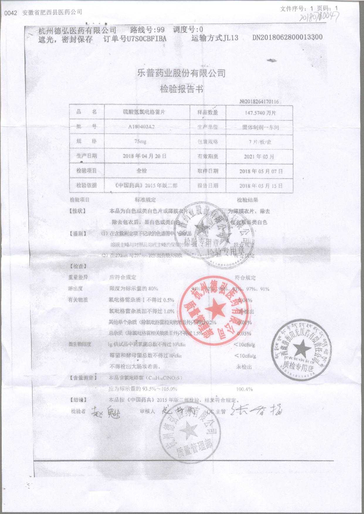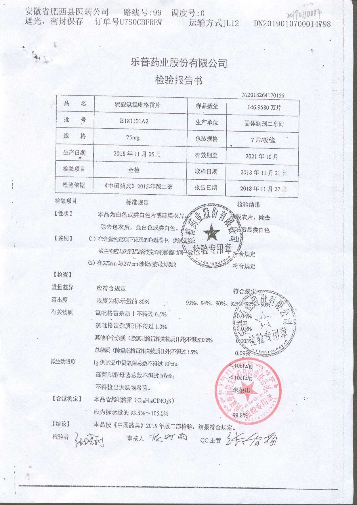 | 硫酸氫氯吡格雷片 | 75mg*7片 | A180901A2 | 查看詳情 |