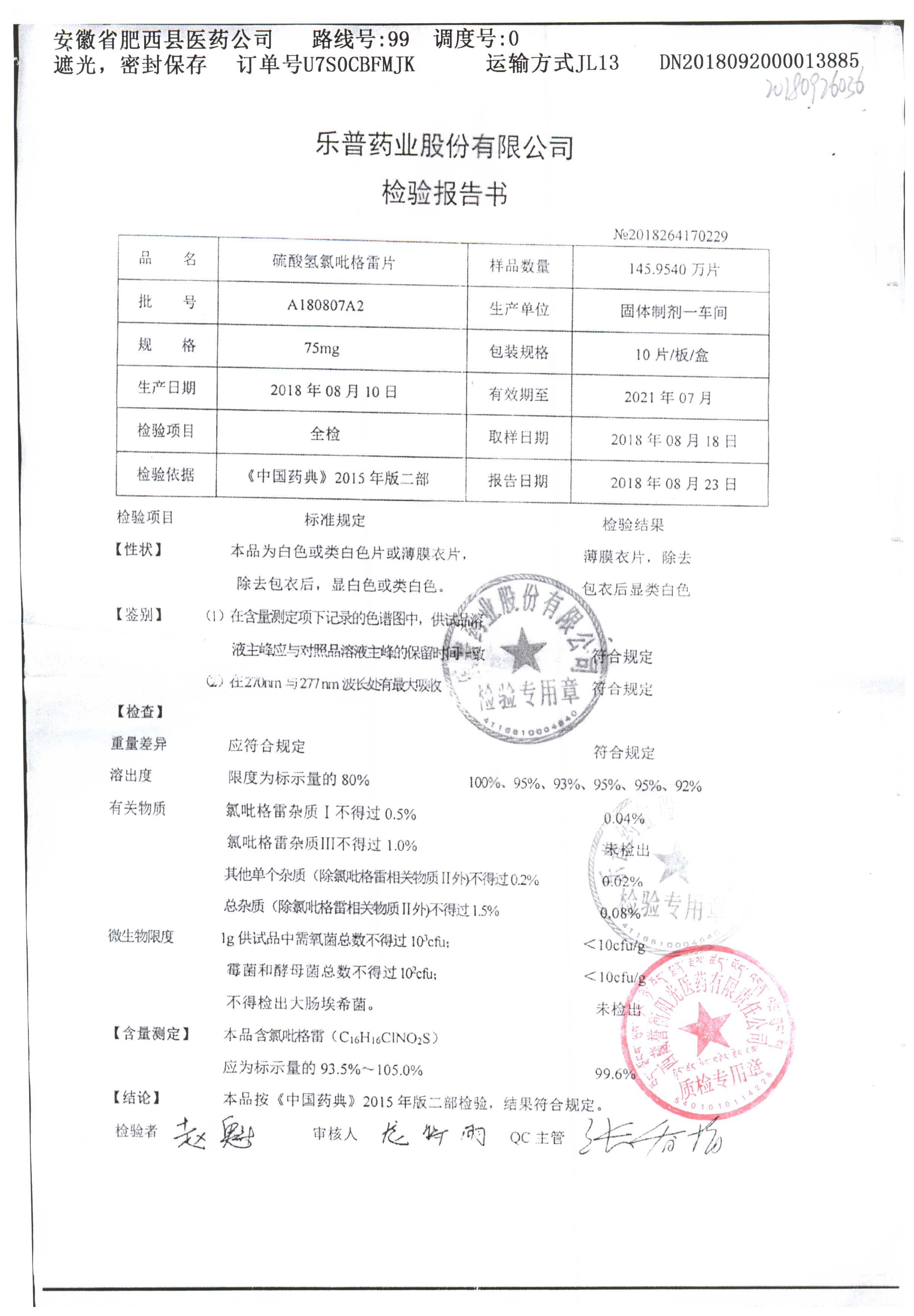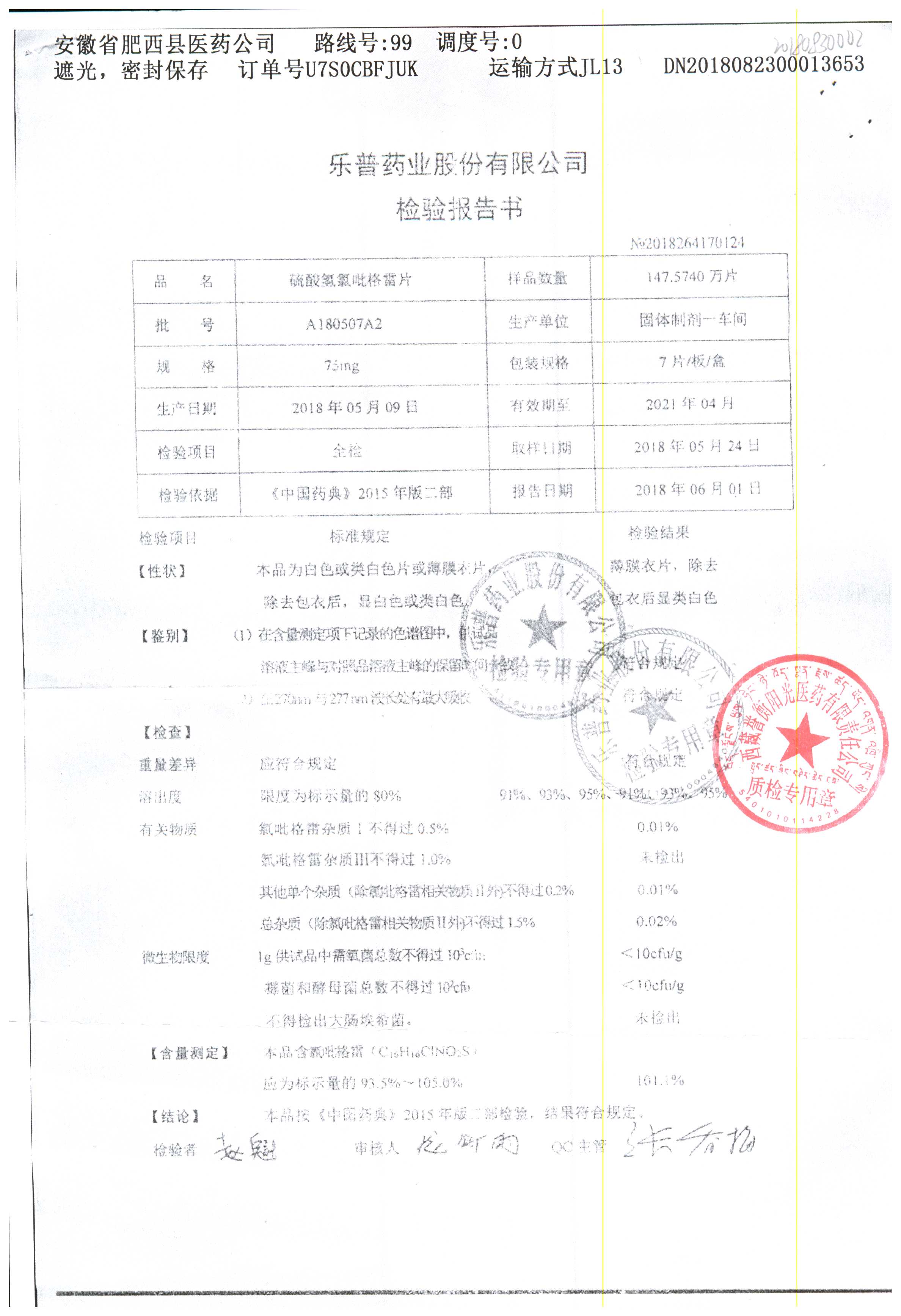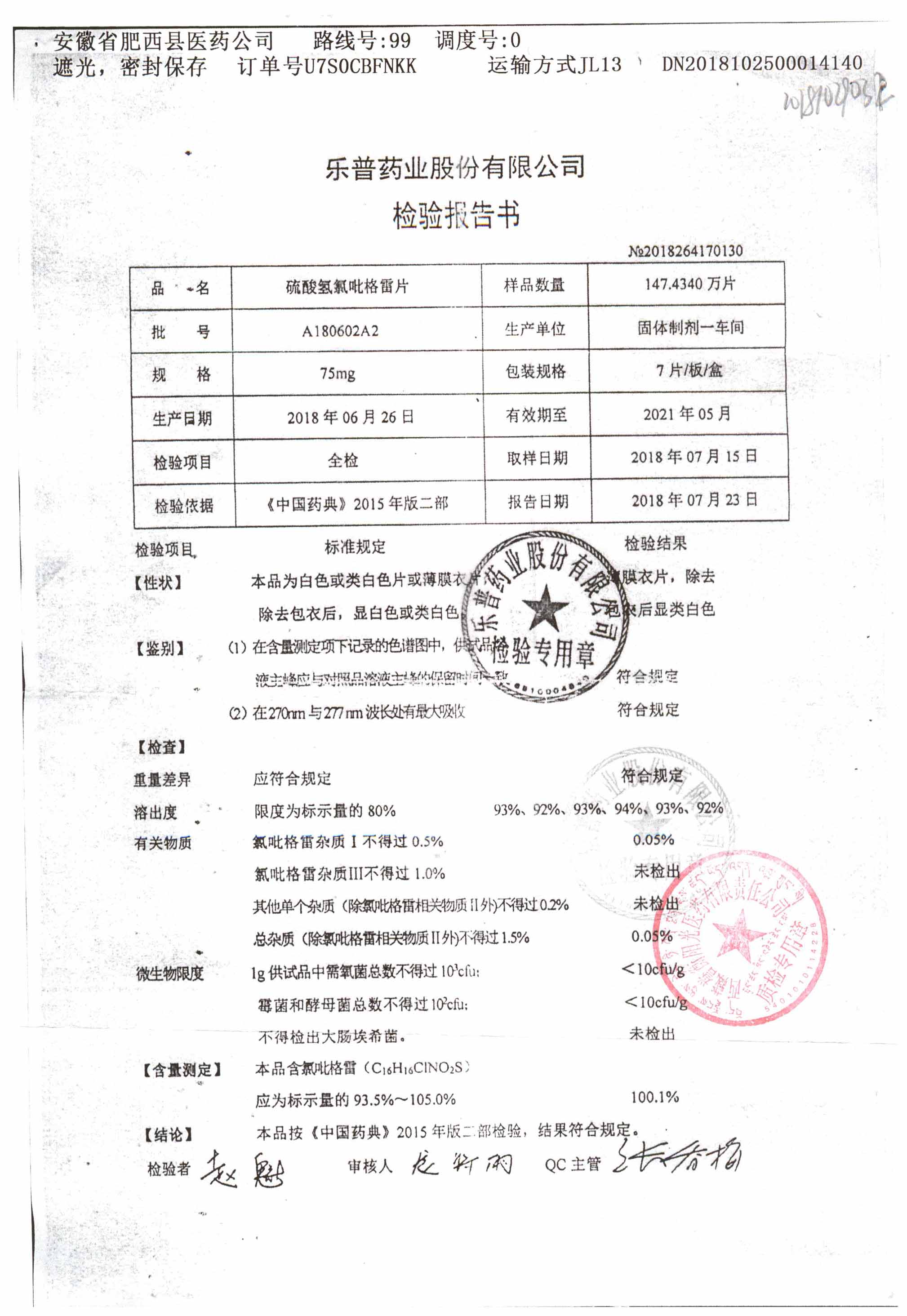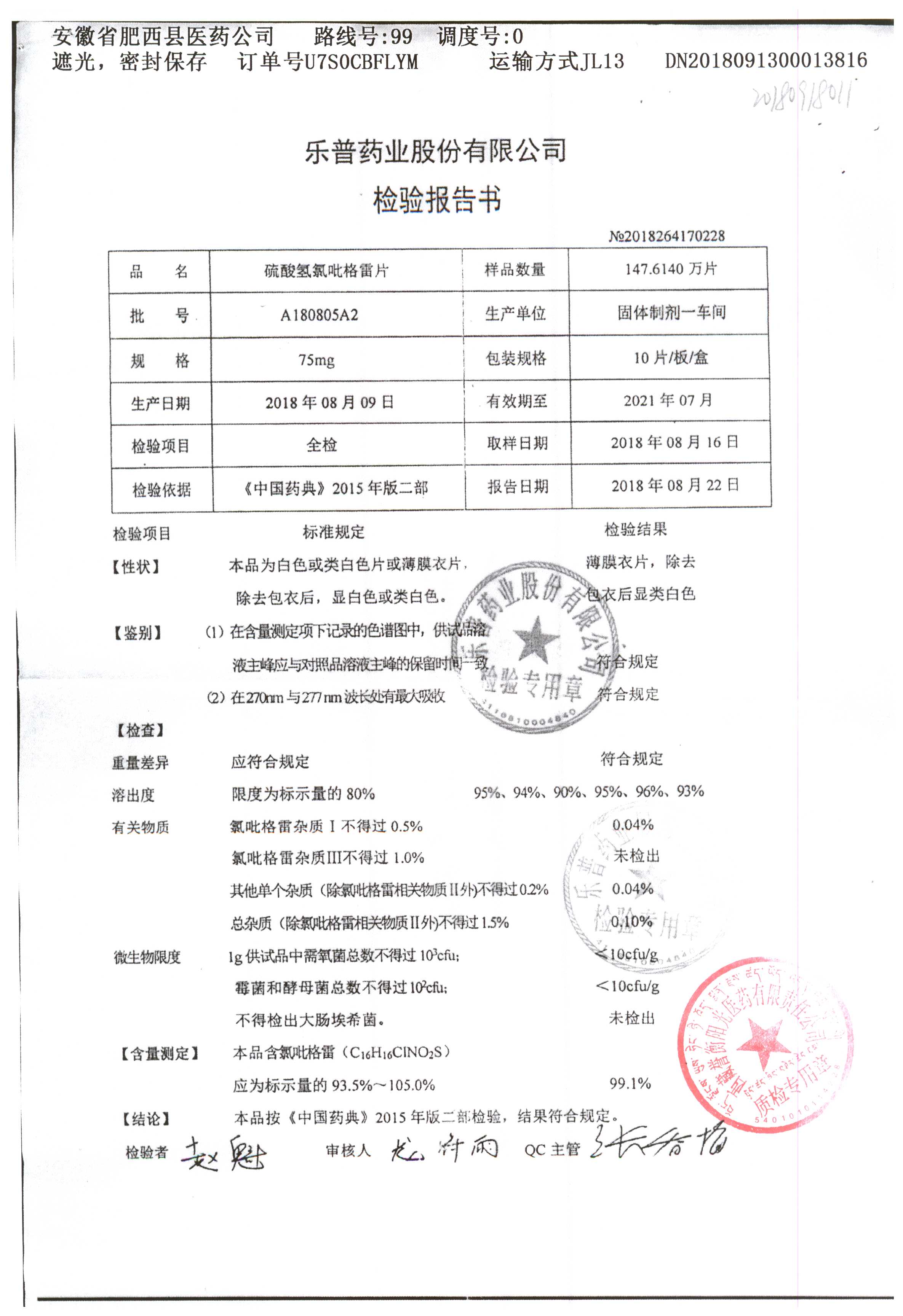 | 硫酸氫氯吡格雷片 | 75mg*7片 | A180901A2 | 查看詳情 |