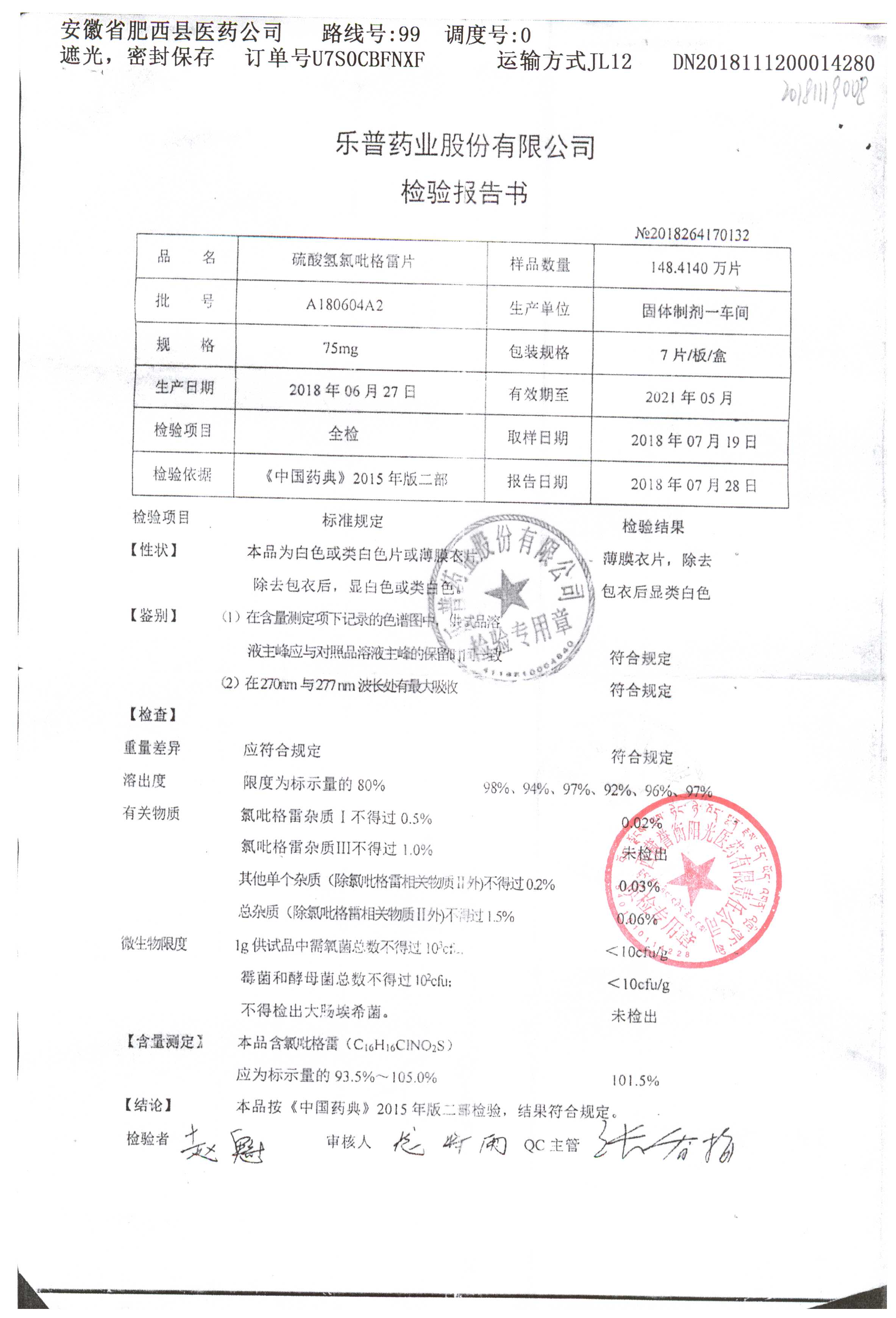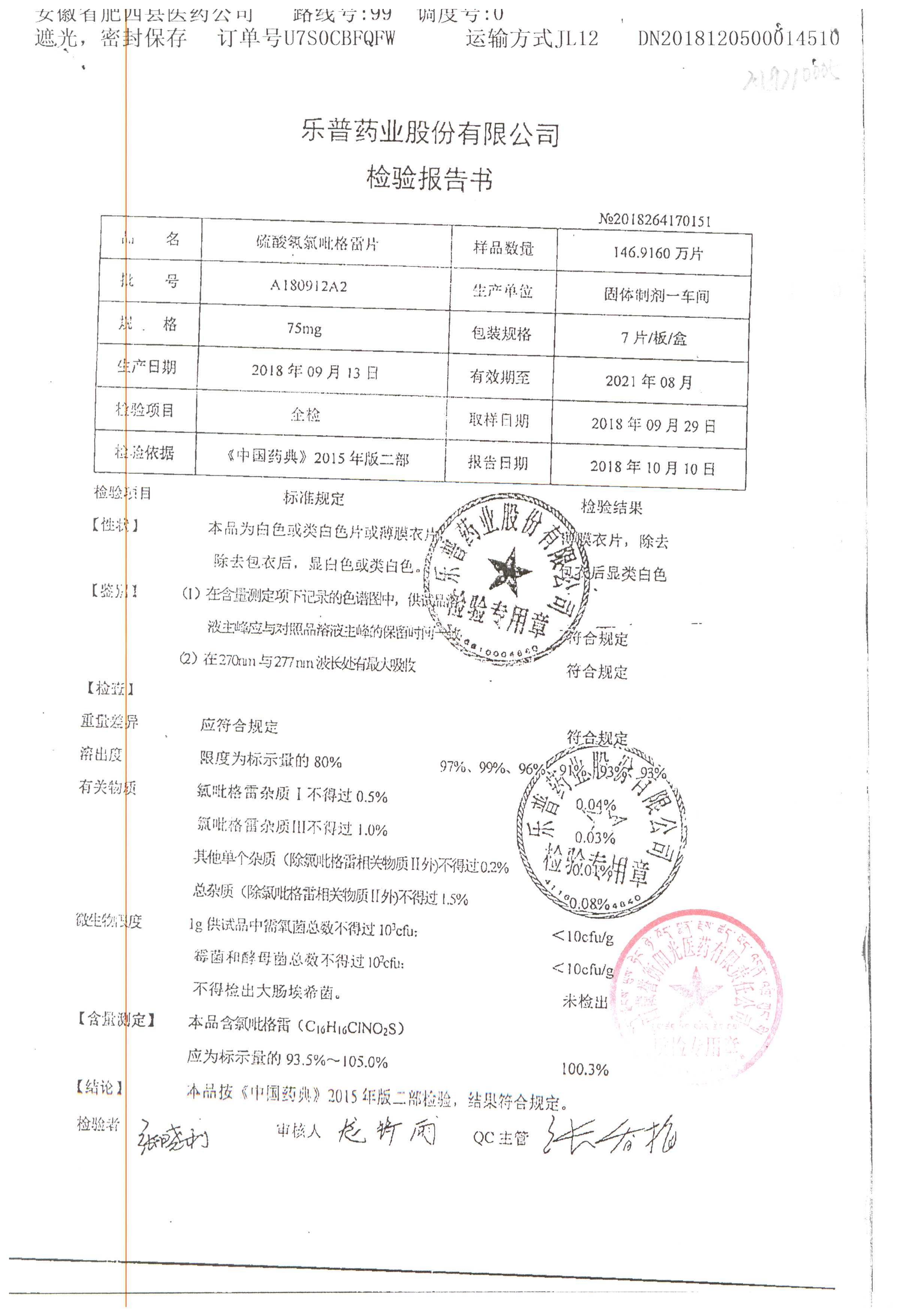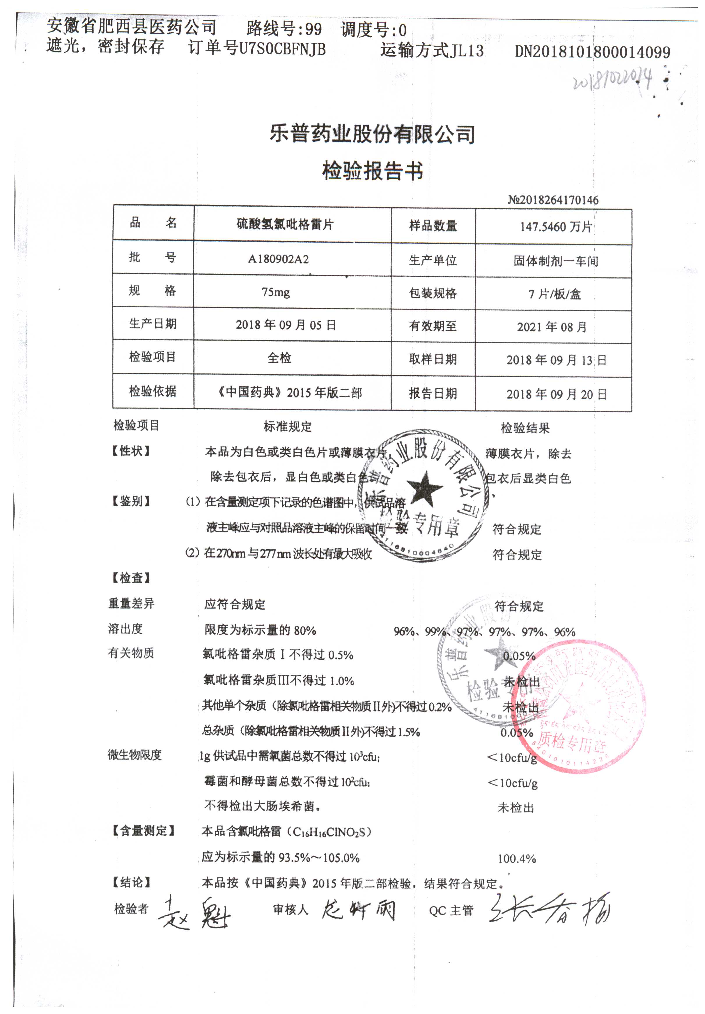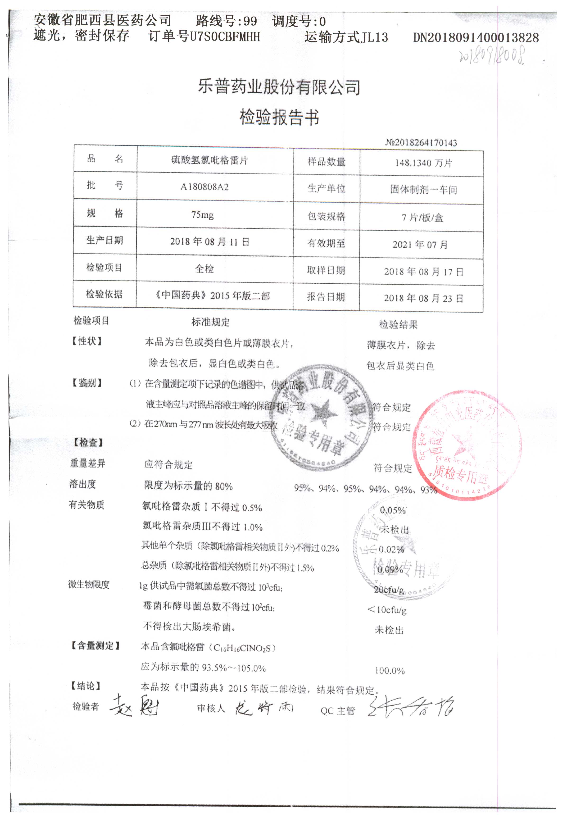 | 硫酸氫氯吡格雷片 | 75mg*7片 | A180901A2 | 查看詳情 |