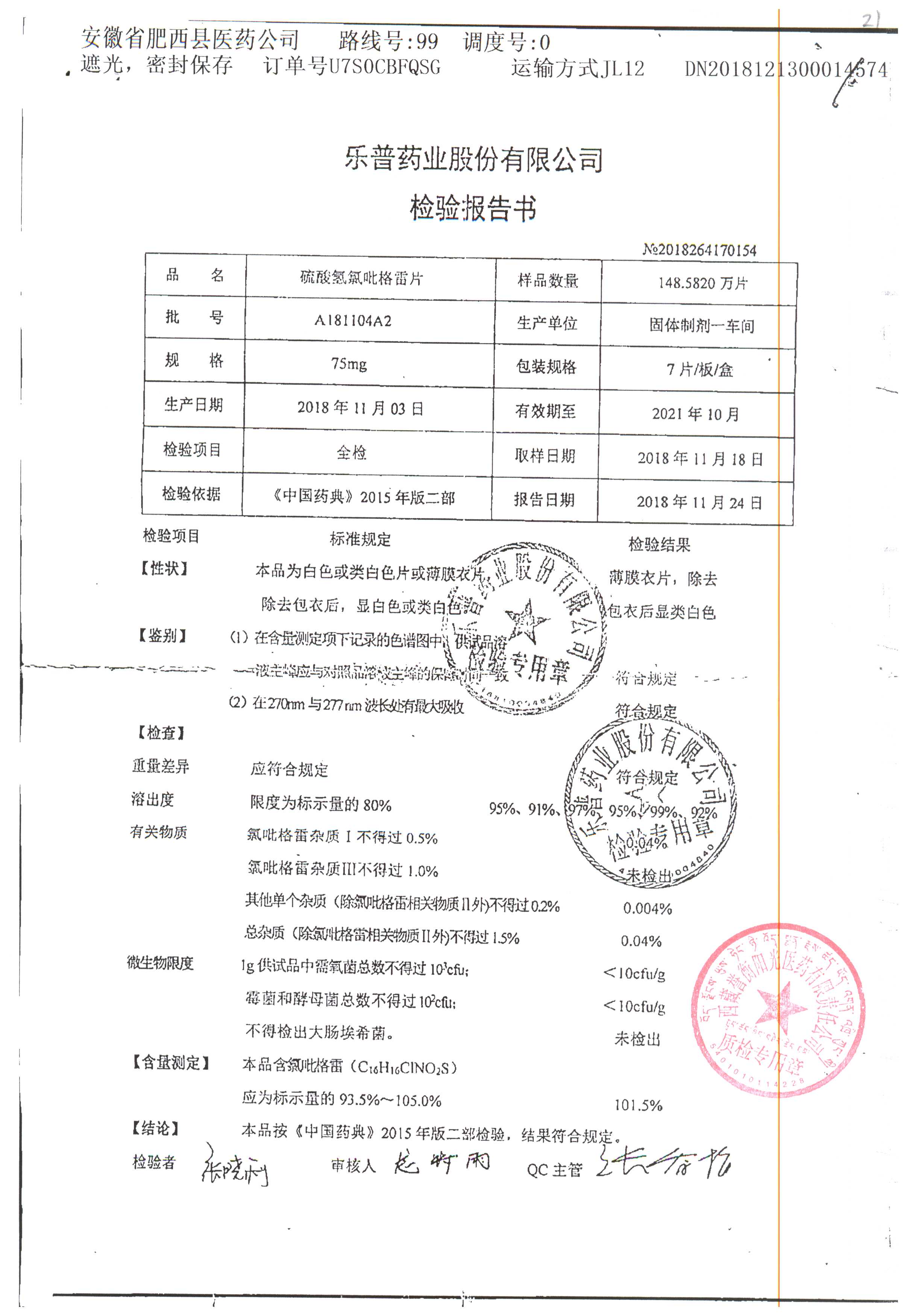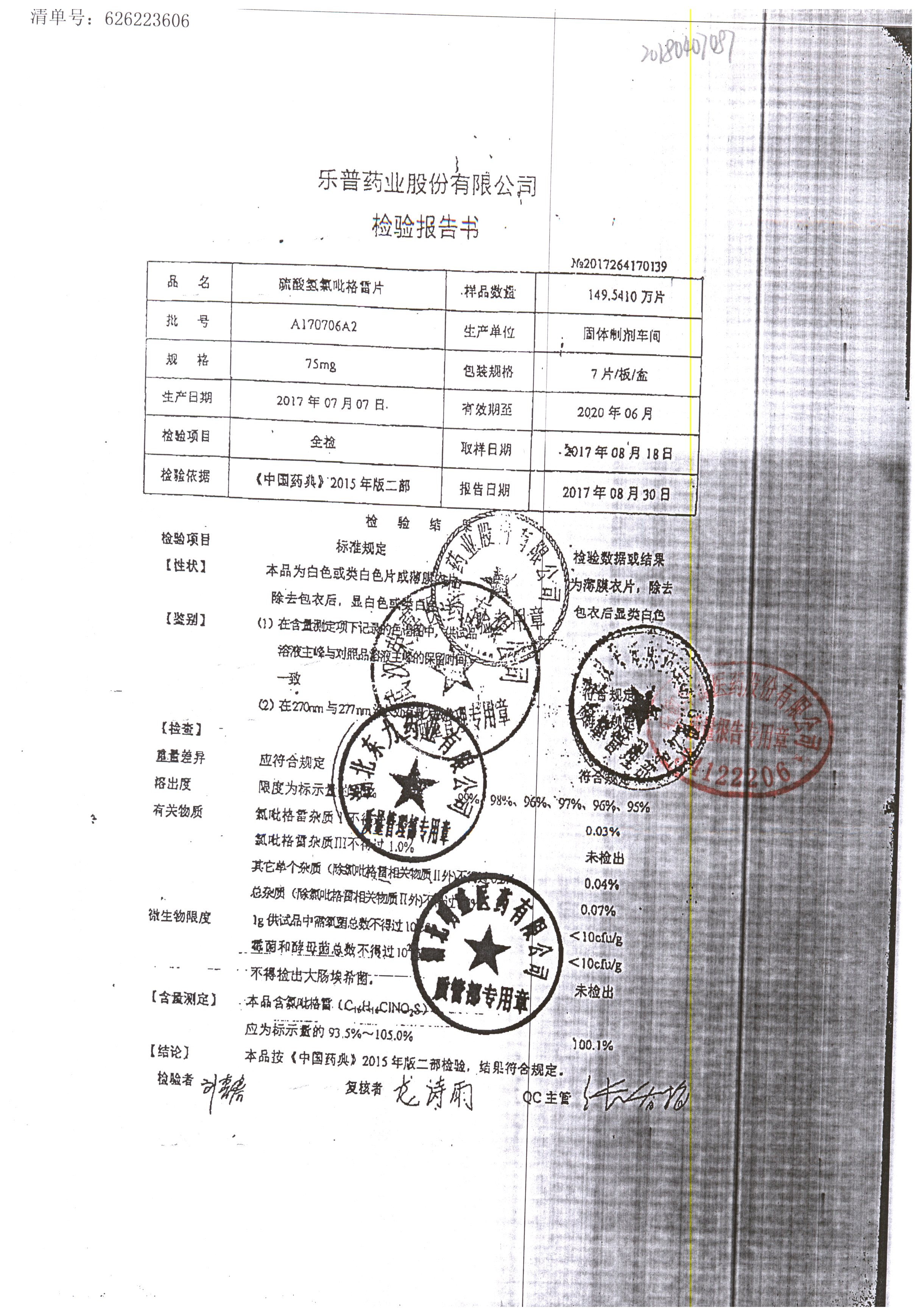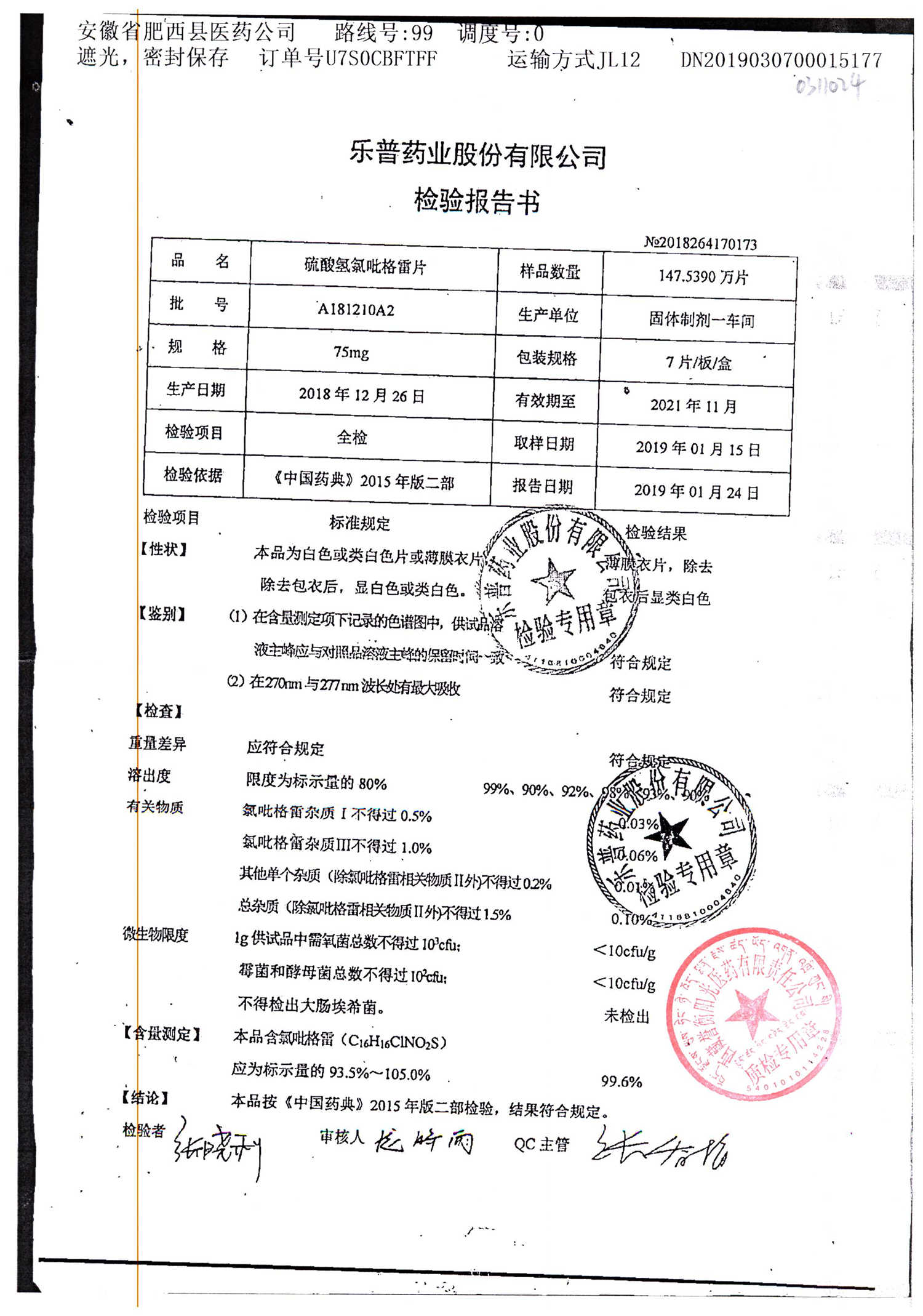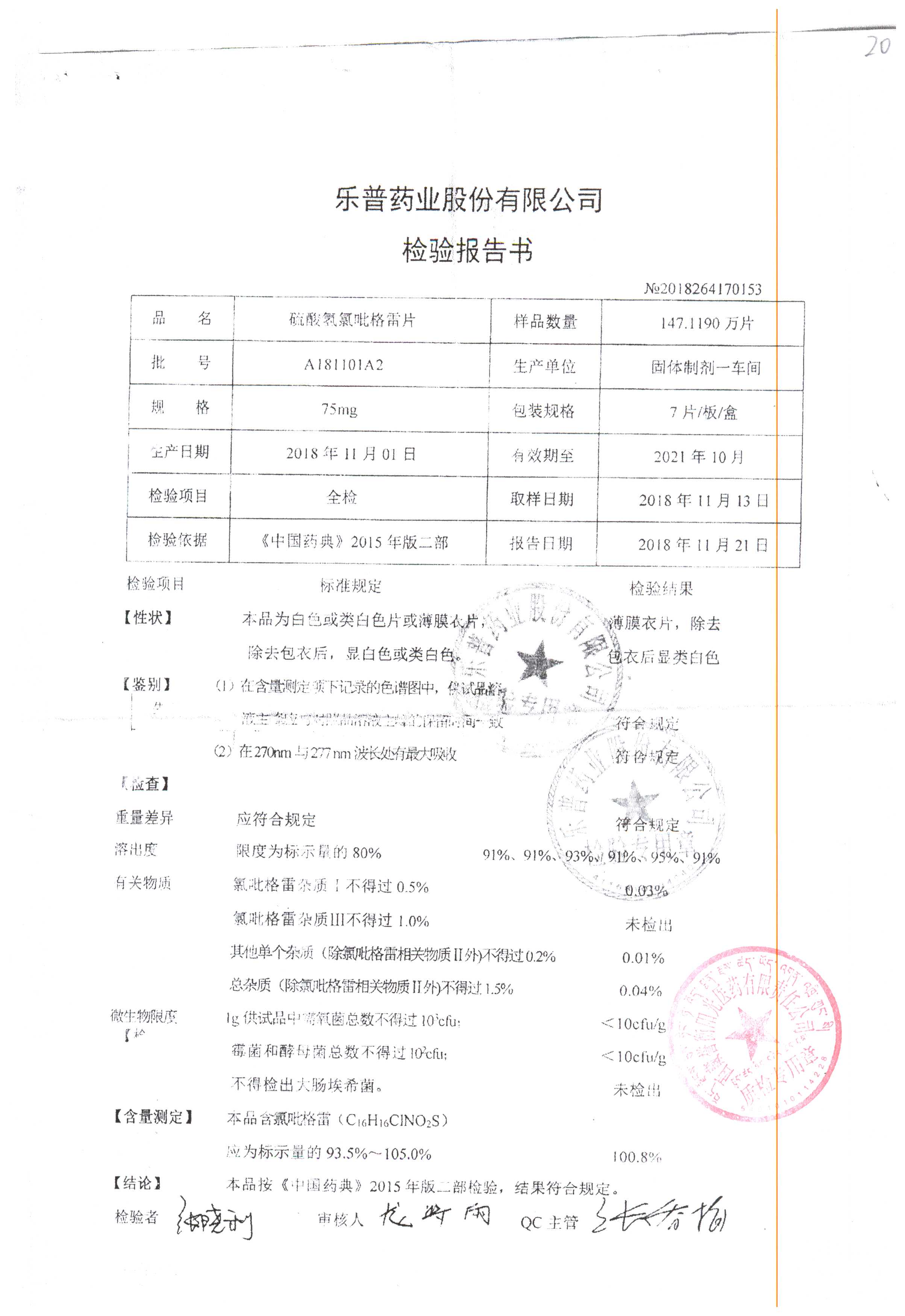 | 硫酸氫氯吡格雷片 | 75mg*7片 | A180901A2 | 查看詳情 |