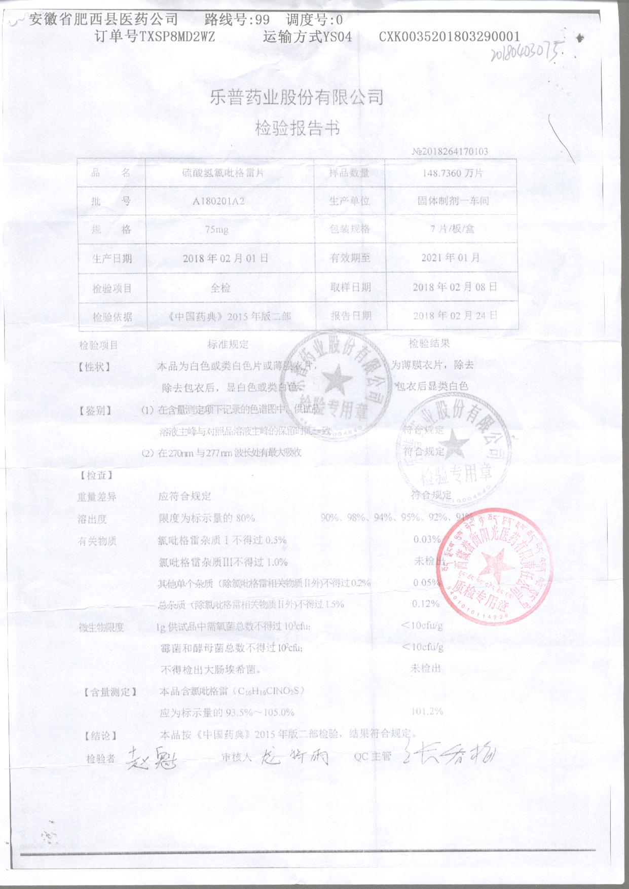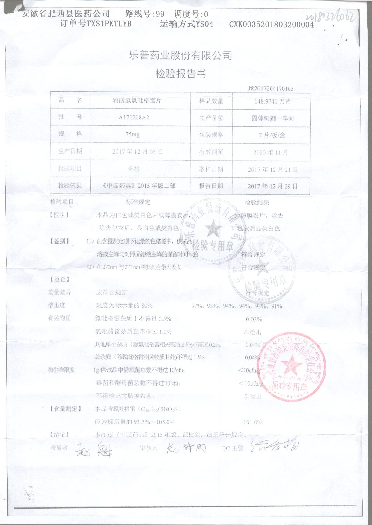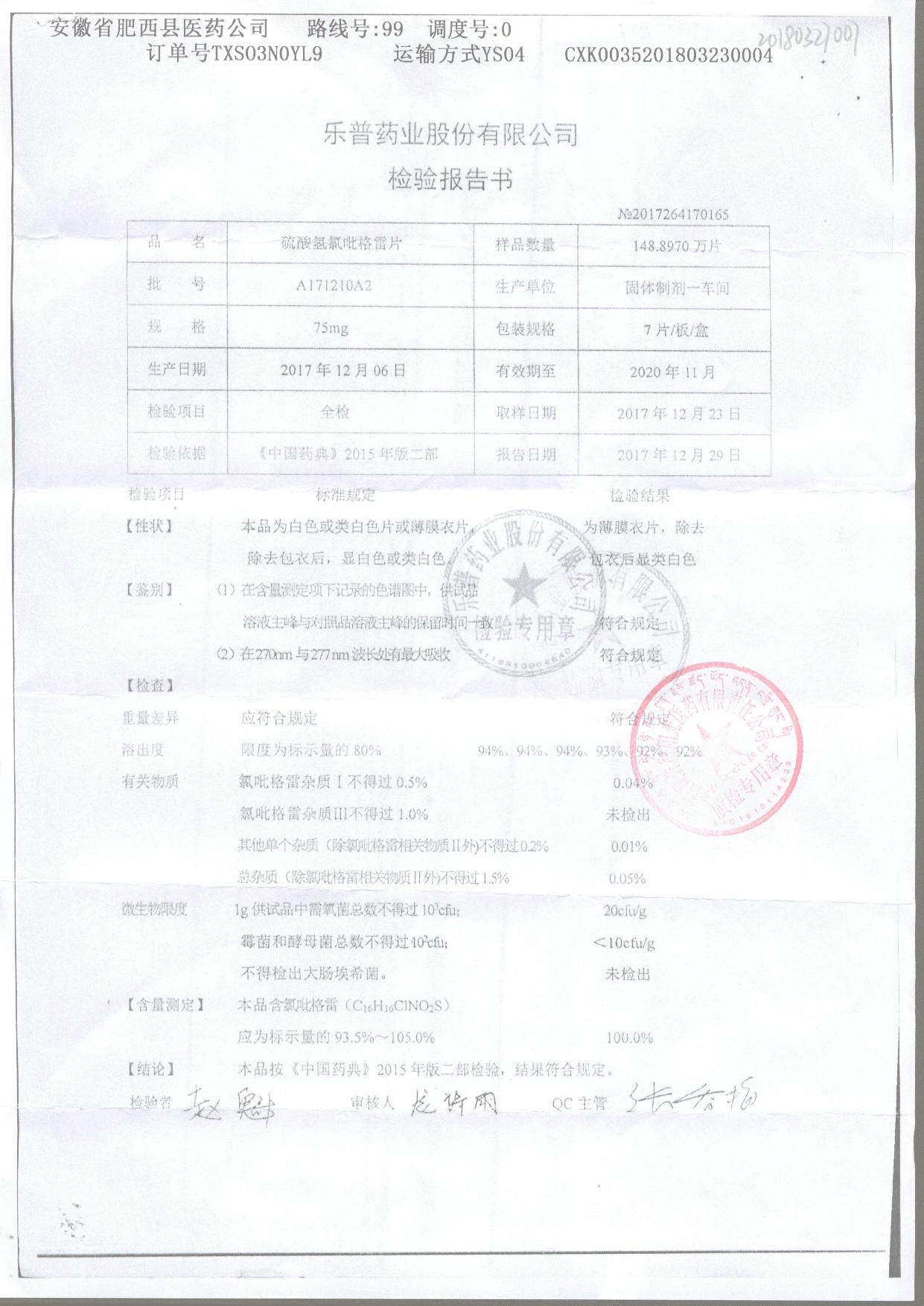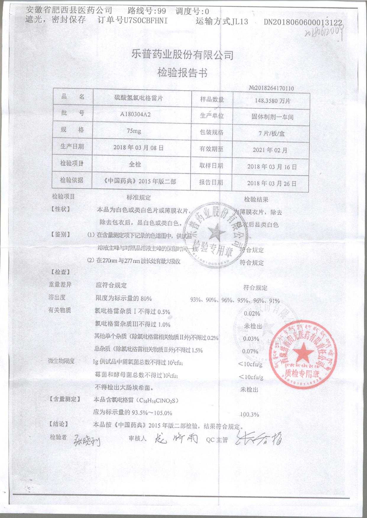 | 硫酸氫氯吡格雷片 | 75mg*7片 | A180304A2 | 查看詳情 |