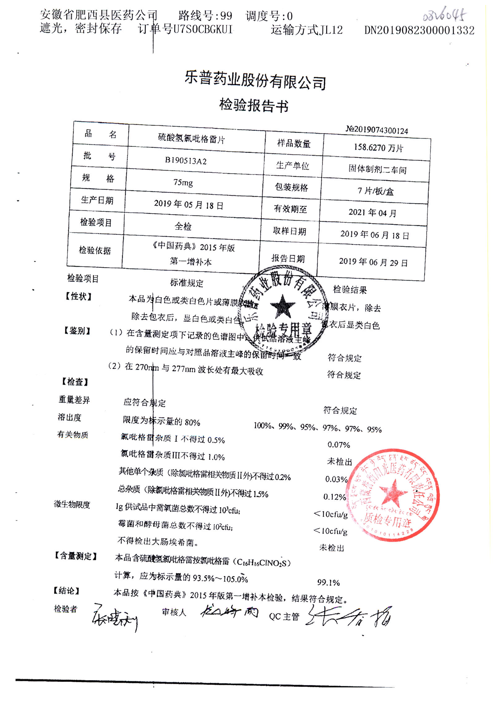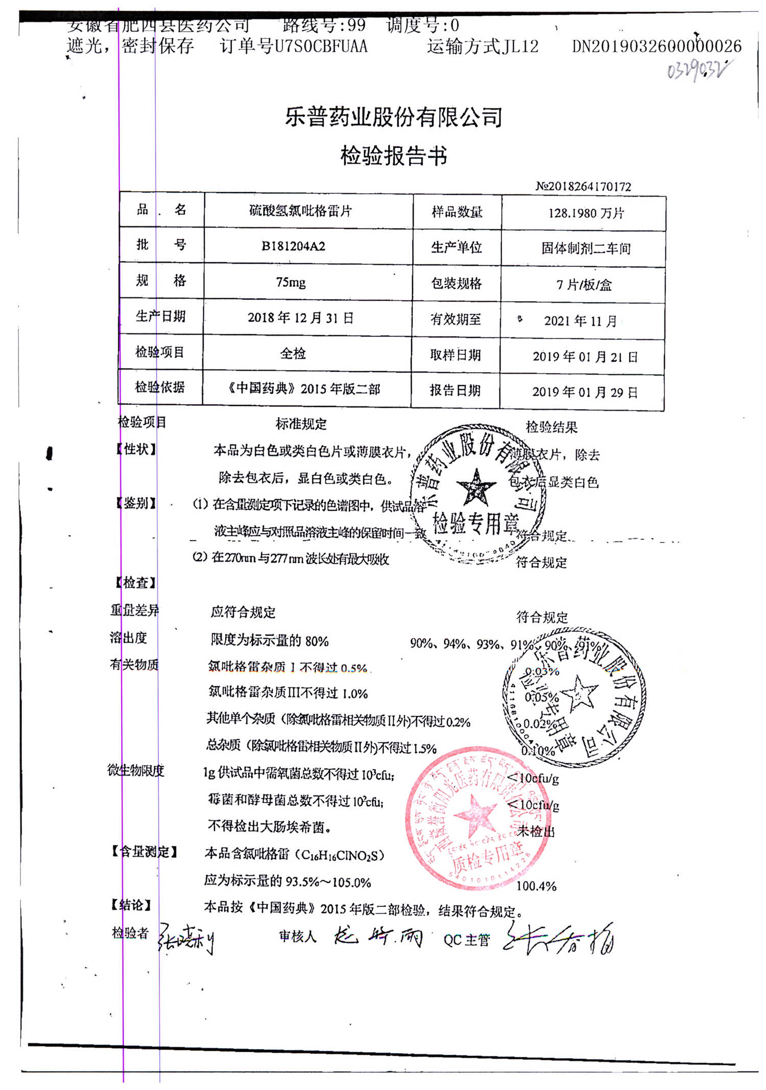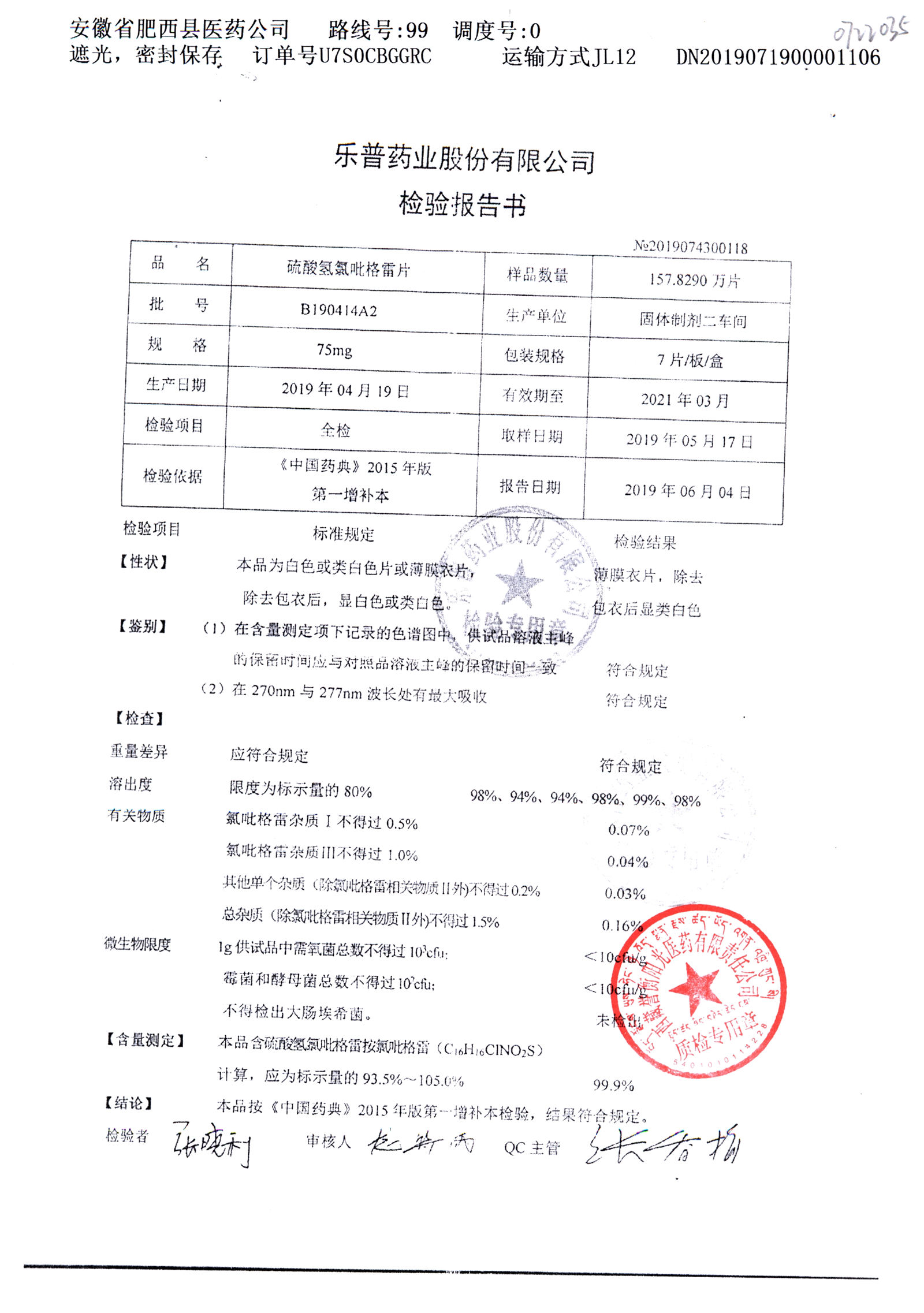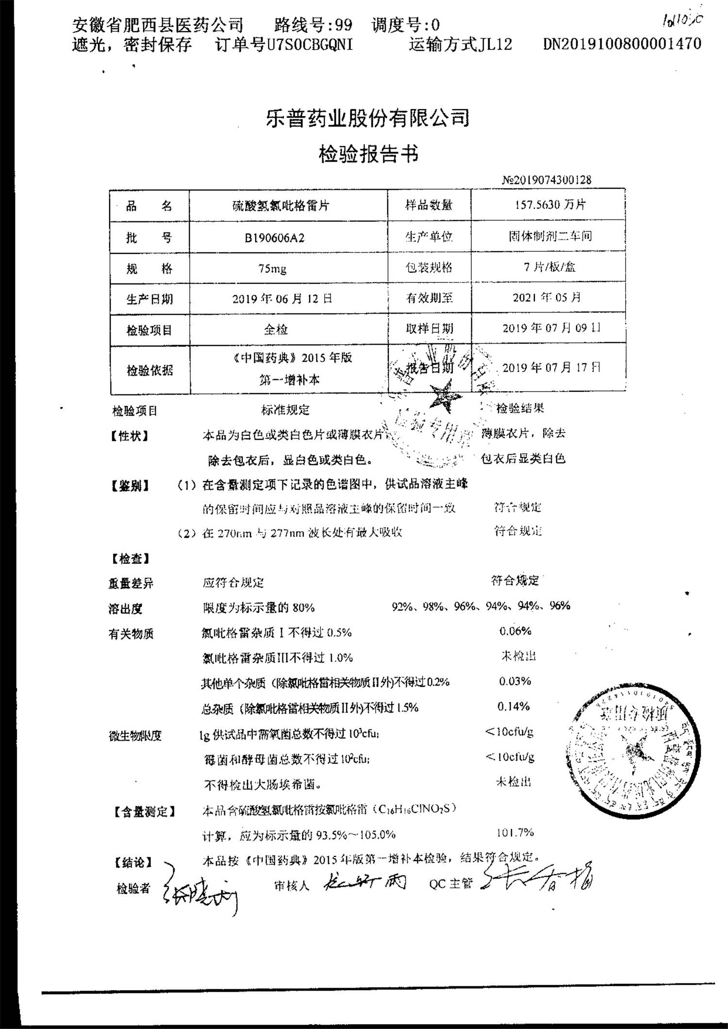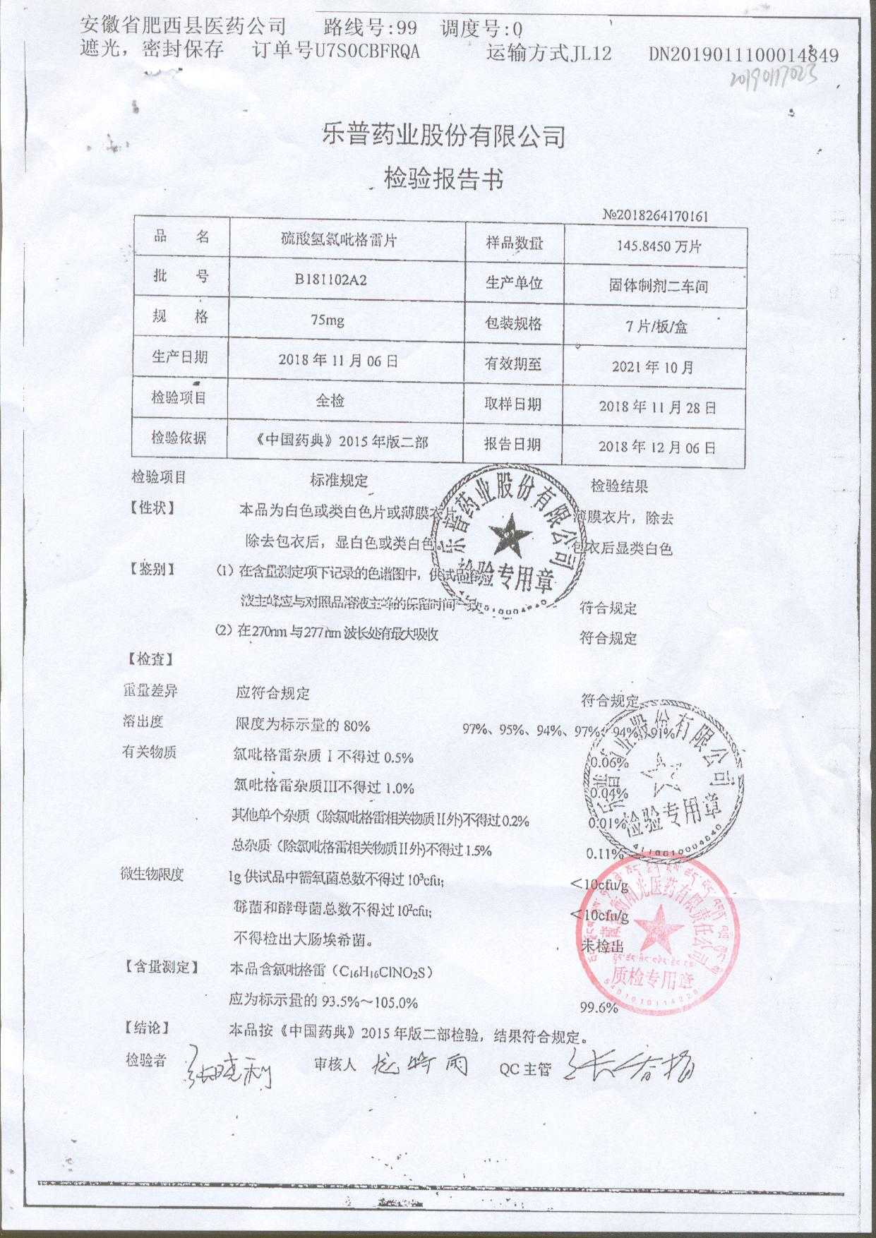 | 硫酸氫氯吡格雷片 | 75mg*7片 | A190407A2 | 查看詳情 |