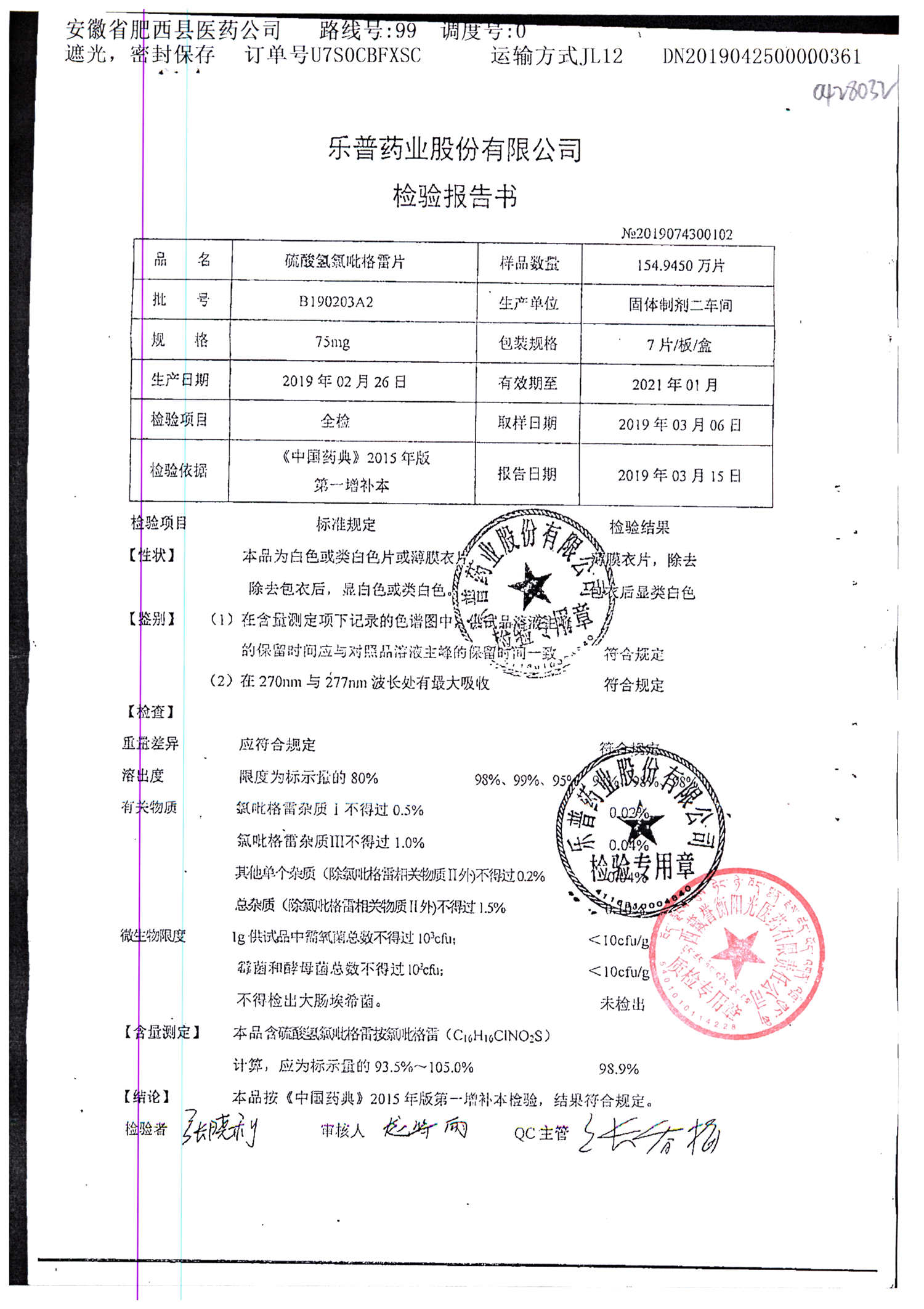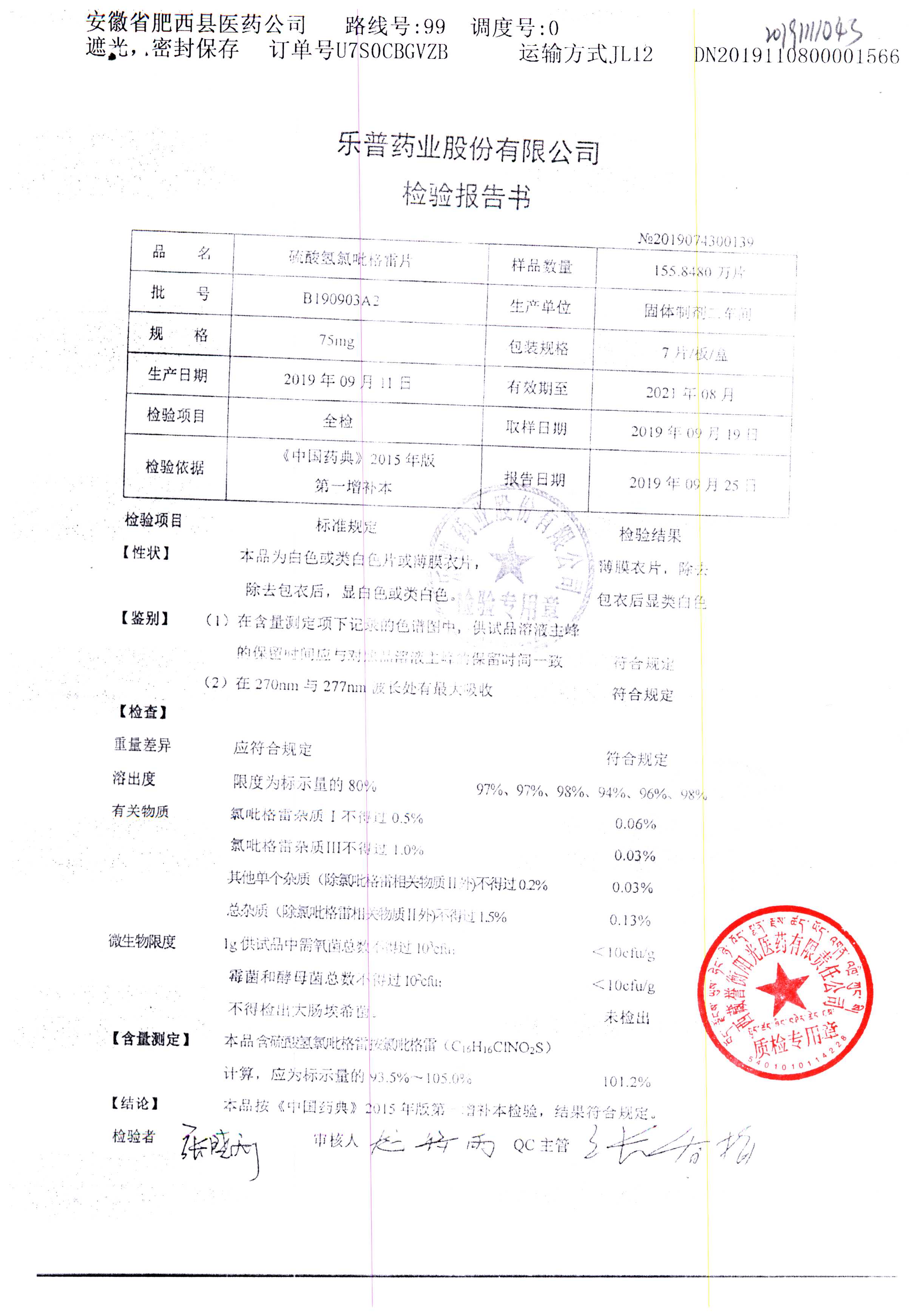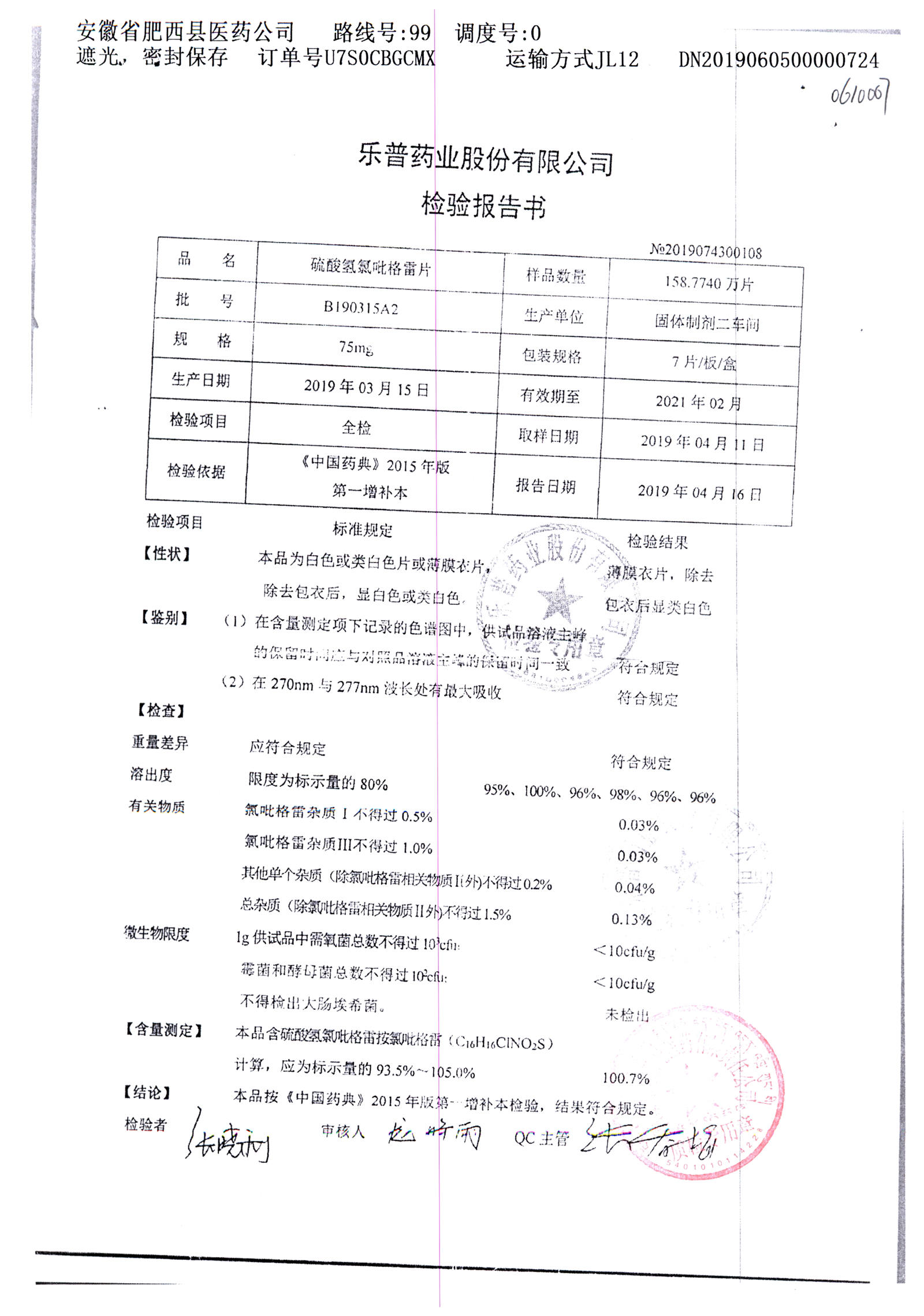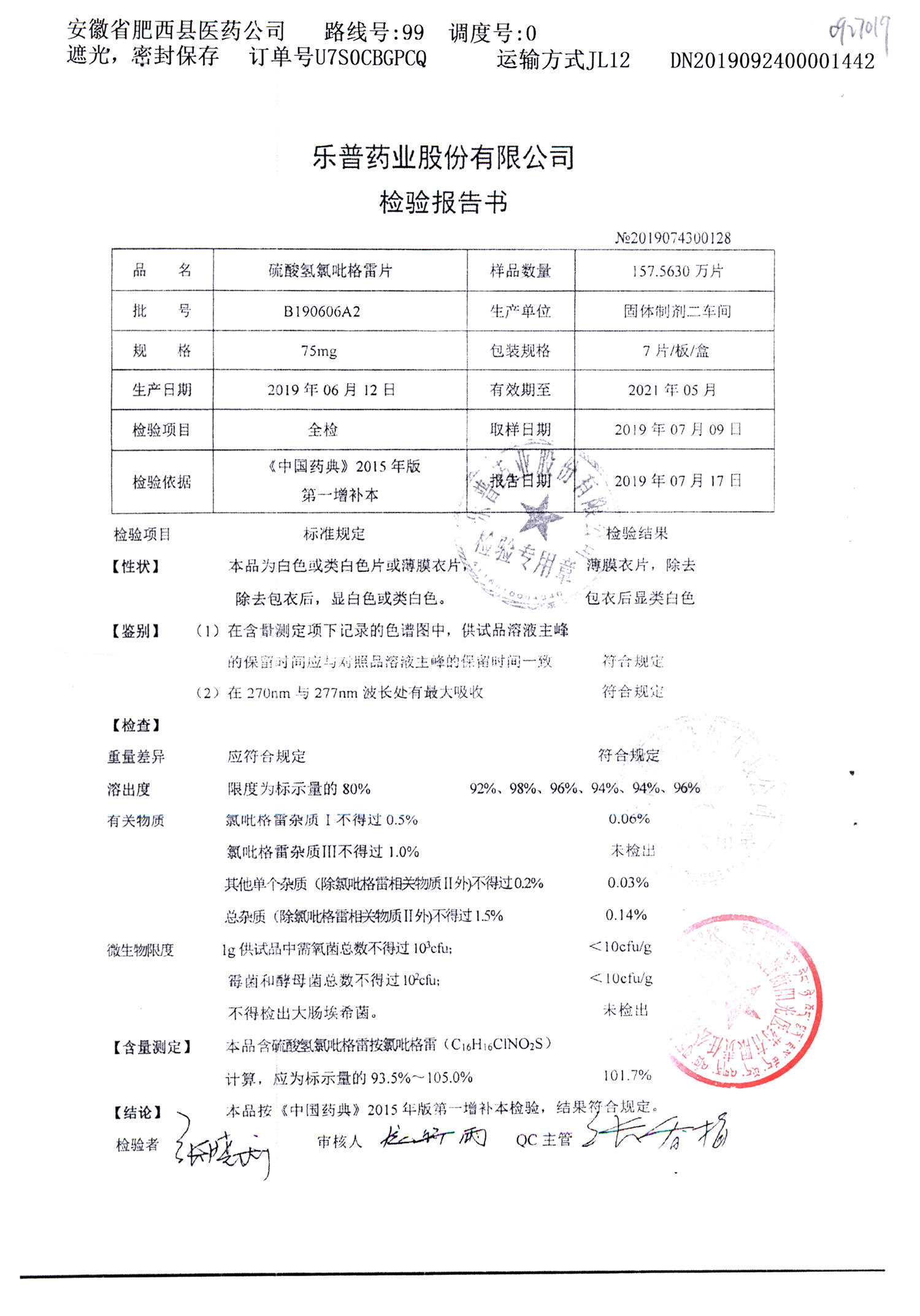 | 硫酸氫氯吡格雷片 | 75mg*7片 | A190407A2 | 查看詳情 |