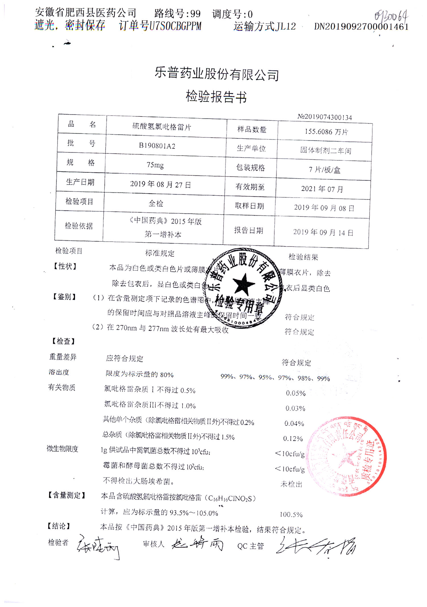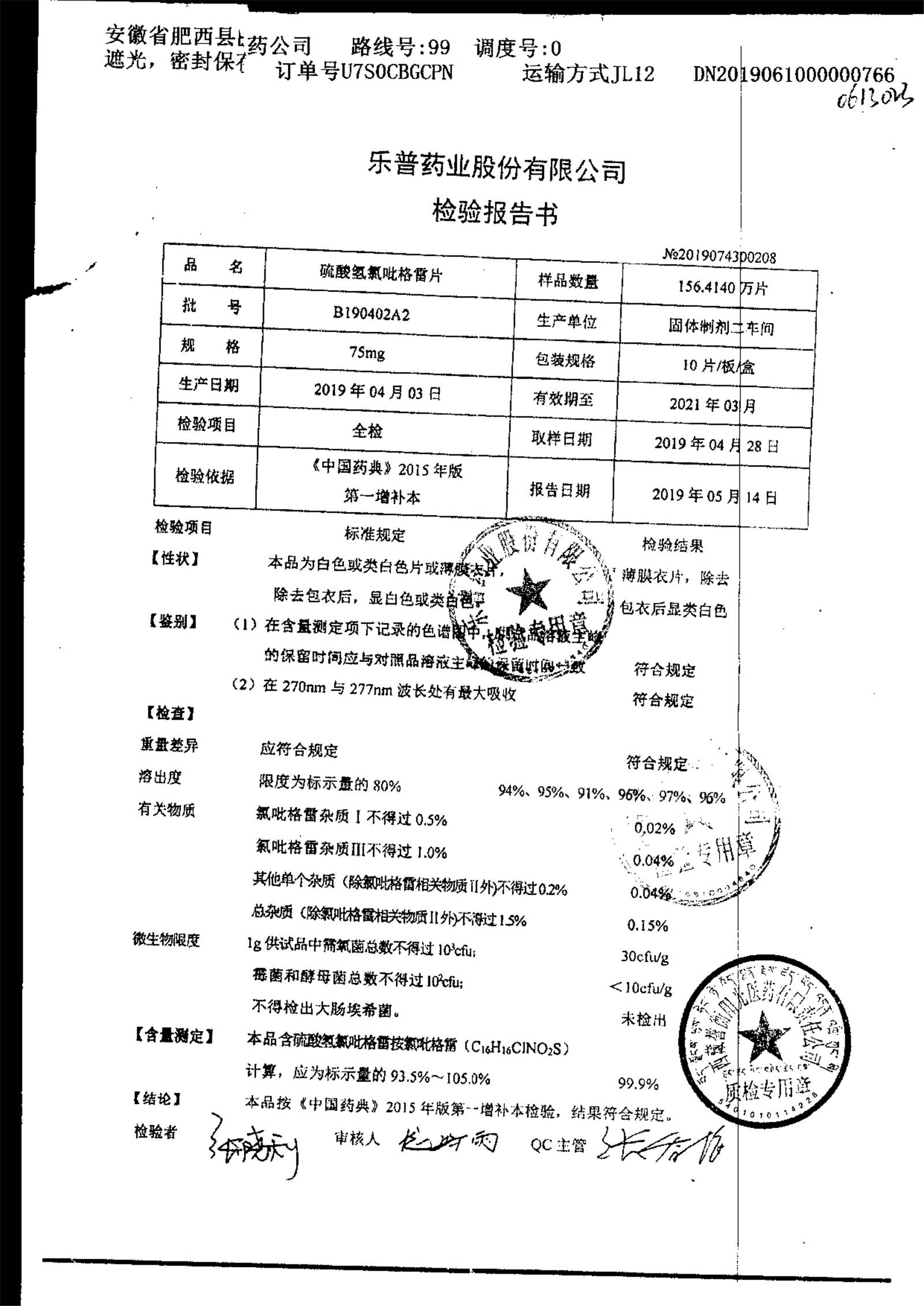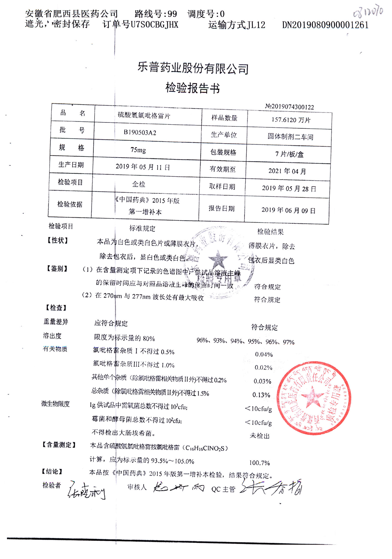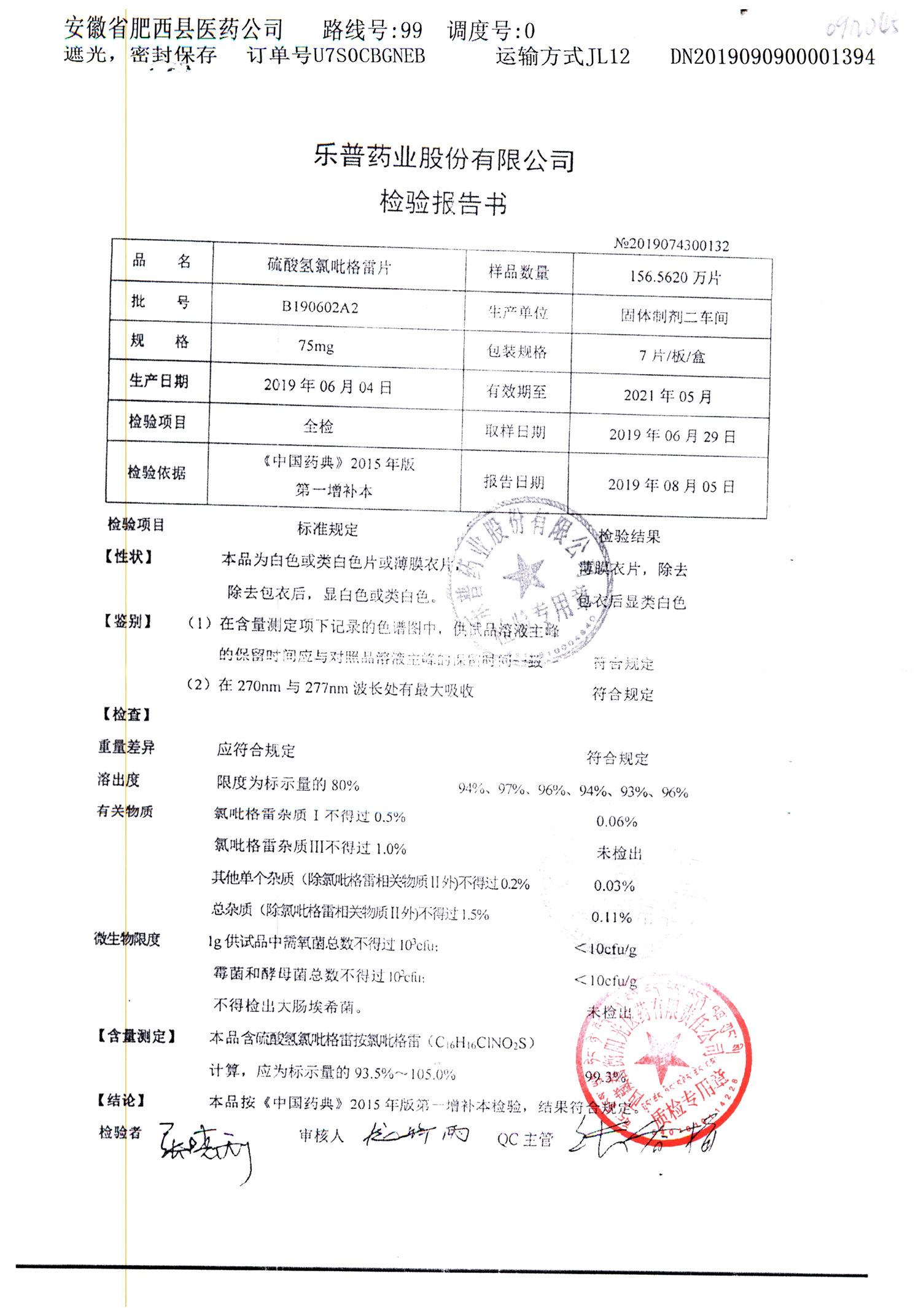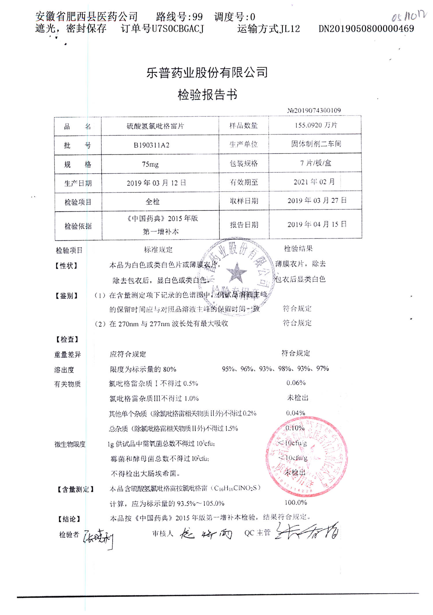 | 硫酸氫氯吡格雷片 | 75mg*7片 | A190407A2 | 查看詳情 |