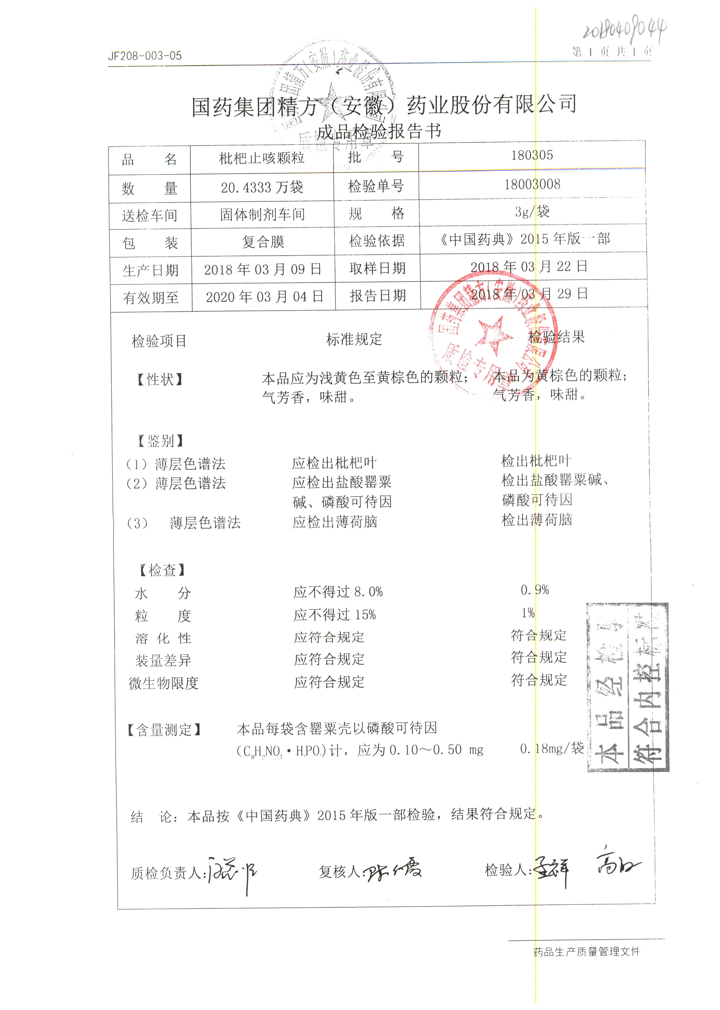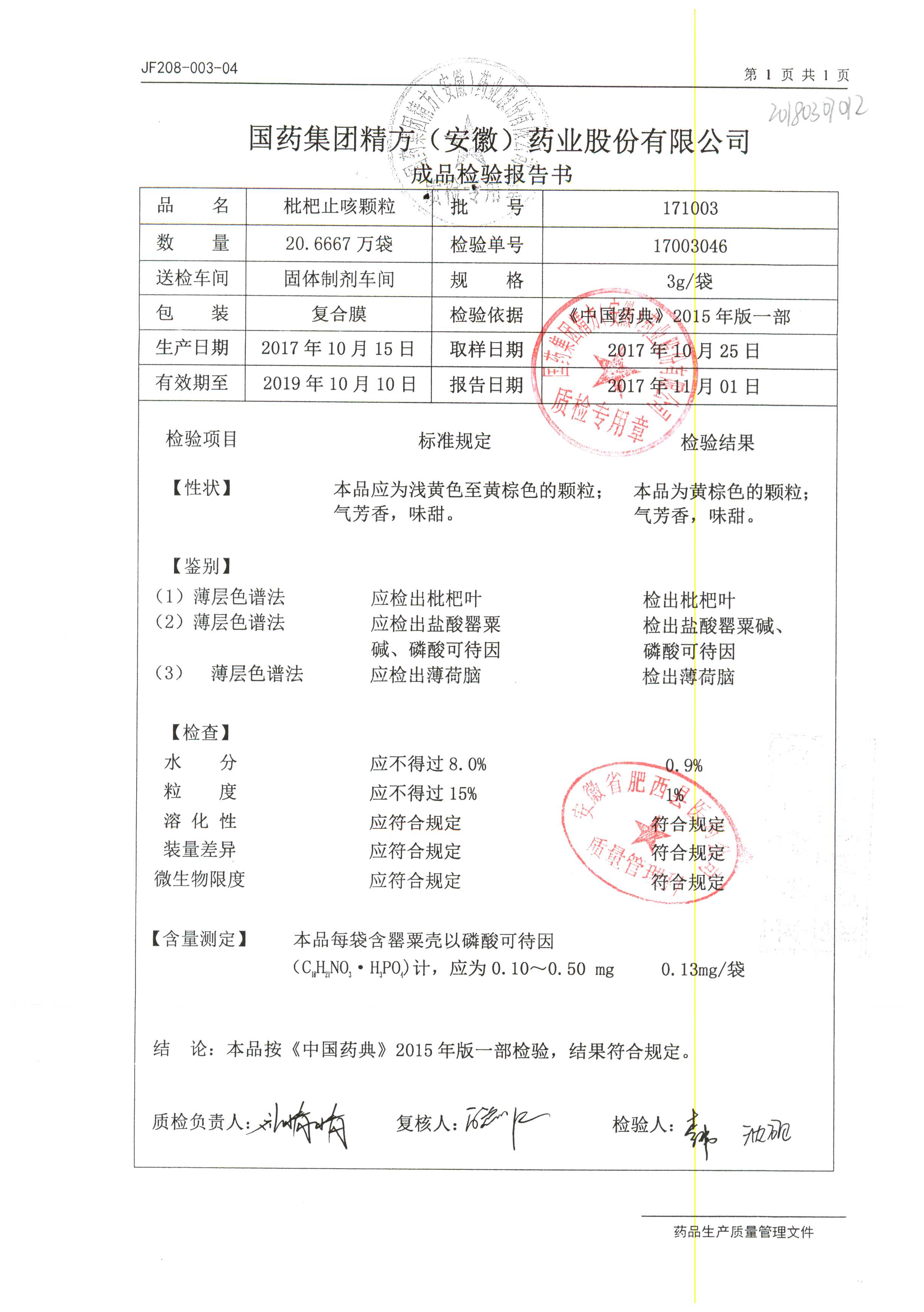 | 枇杷止咳顆粒 | 3g | 180305 | 查看詳情 |