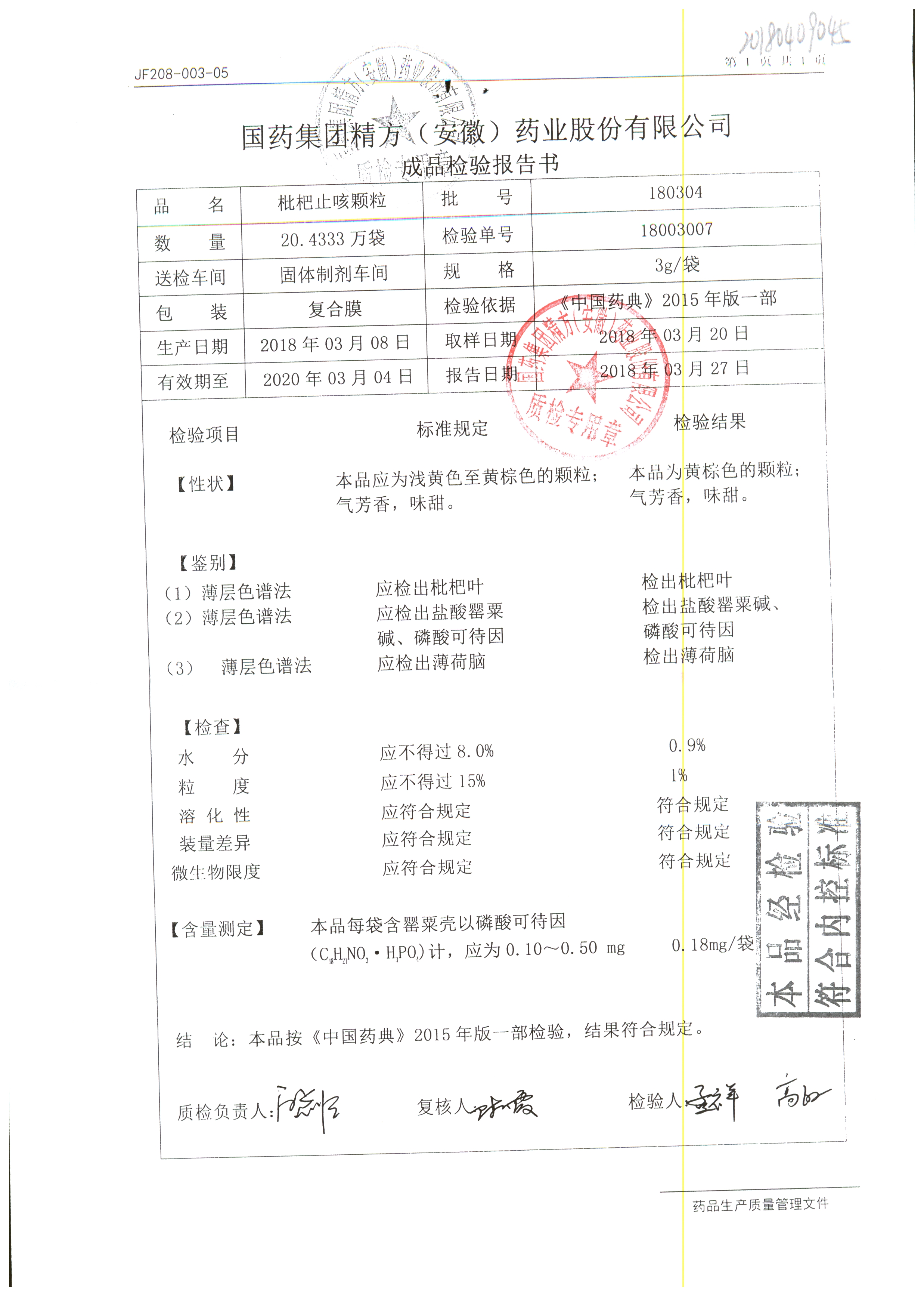 | 枇杷止咳顆粒 | 3g | 180304 | 查看詳情 |