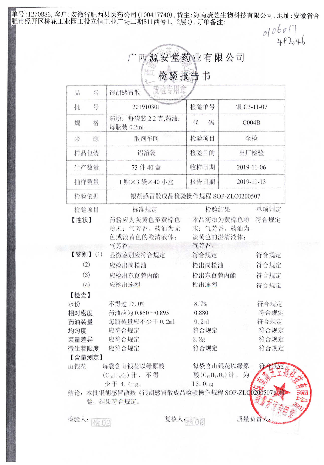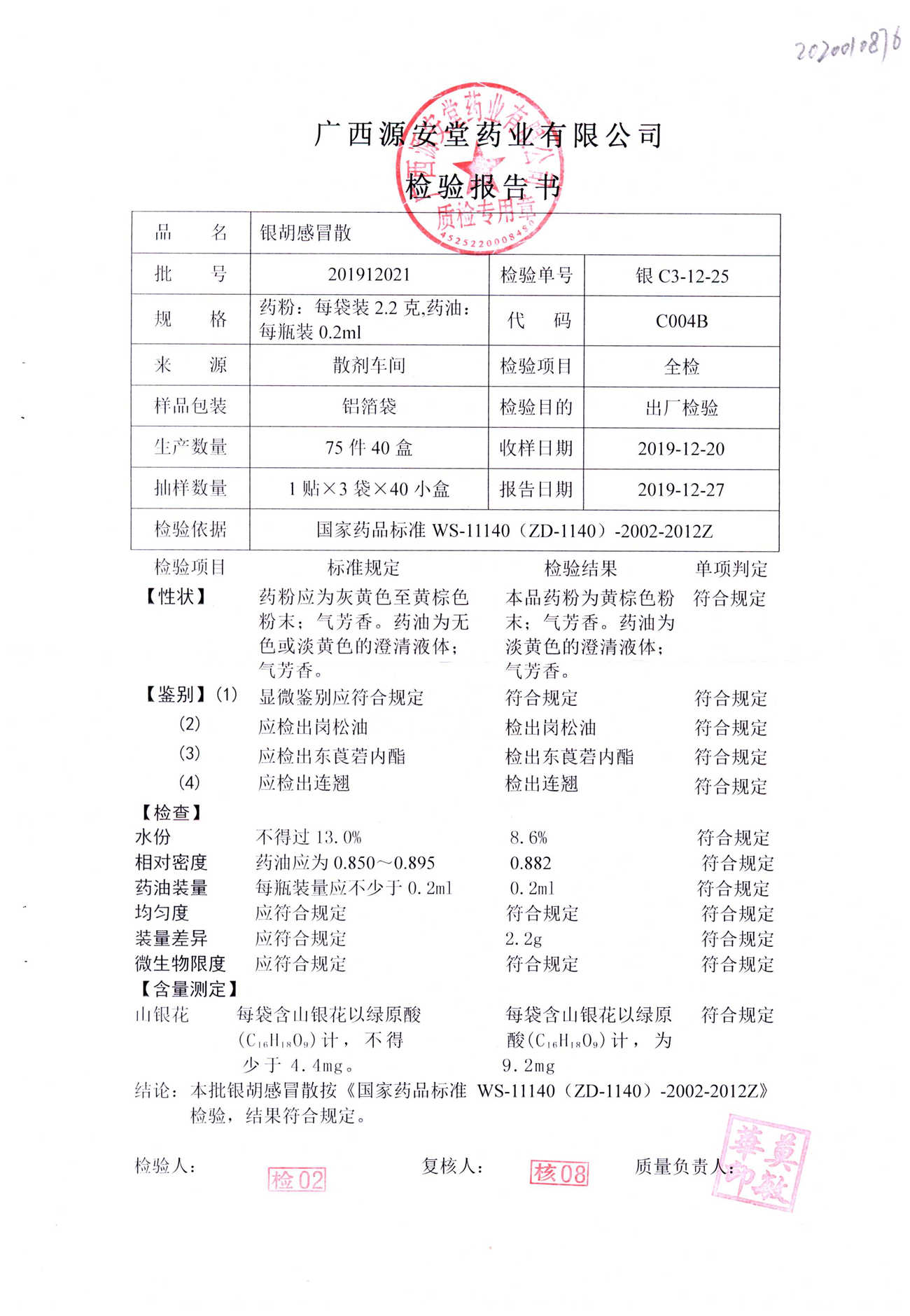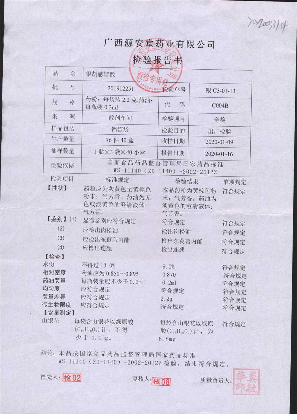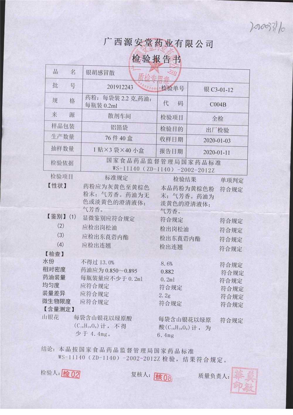 | 銀胡感冒散 | 3袋 | 201912022 | 查看詳情 |