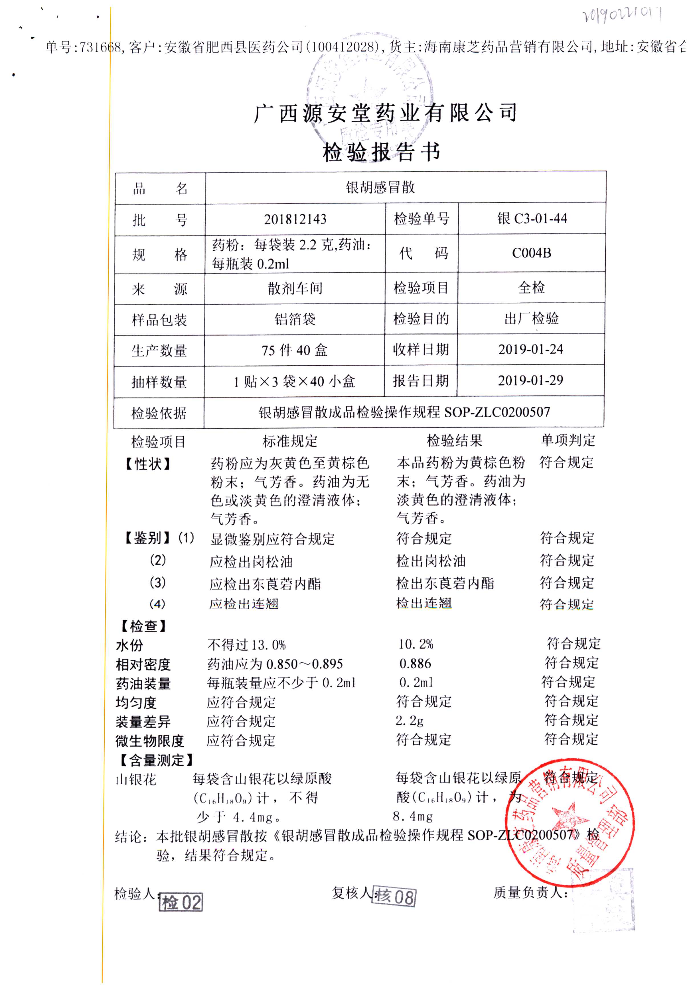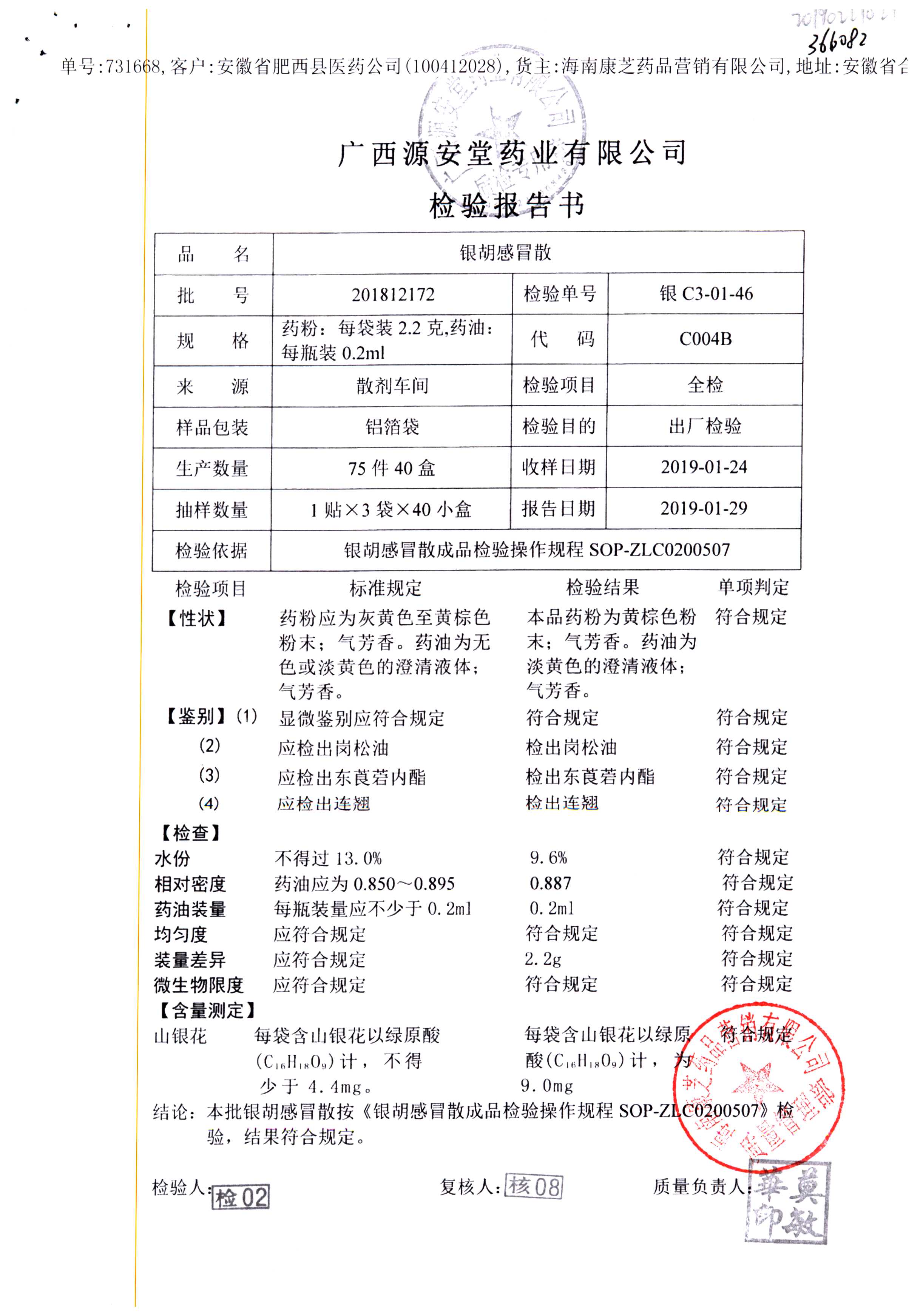 | 銀胡感冒散 | 3袋 | 201903111 | 查看詳情 |