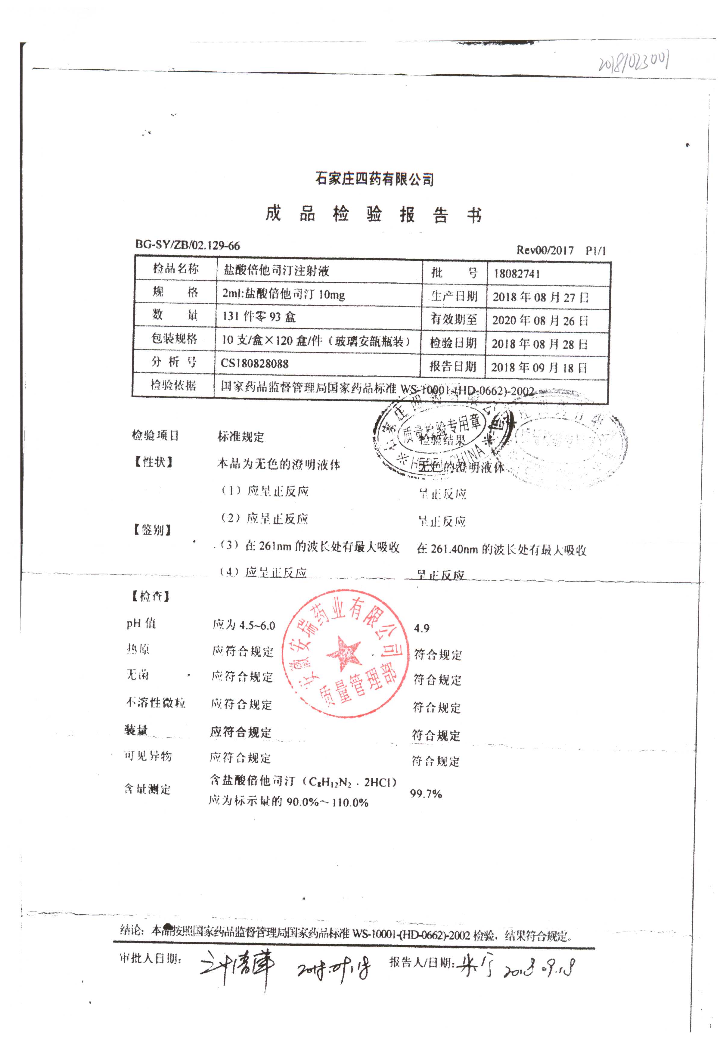 | 鹽酸倍他司汀注射液 | 2ml:10mg | 18082741 | 查看詳情 |