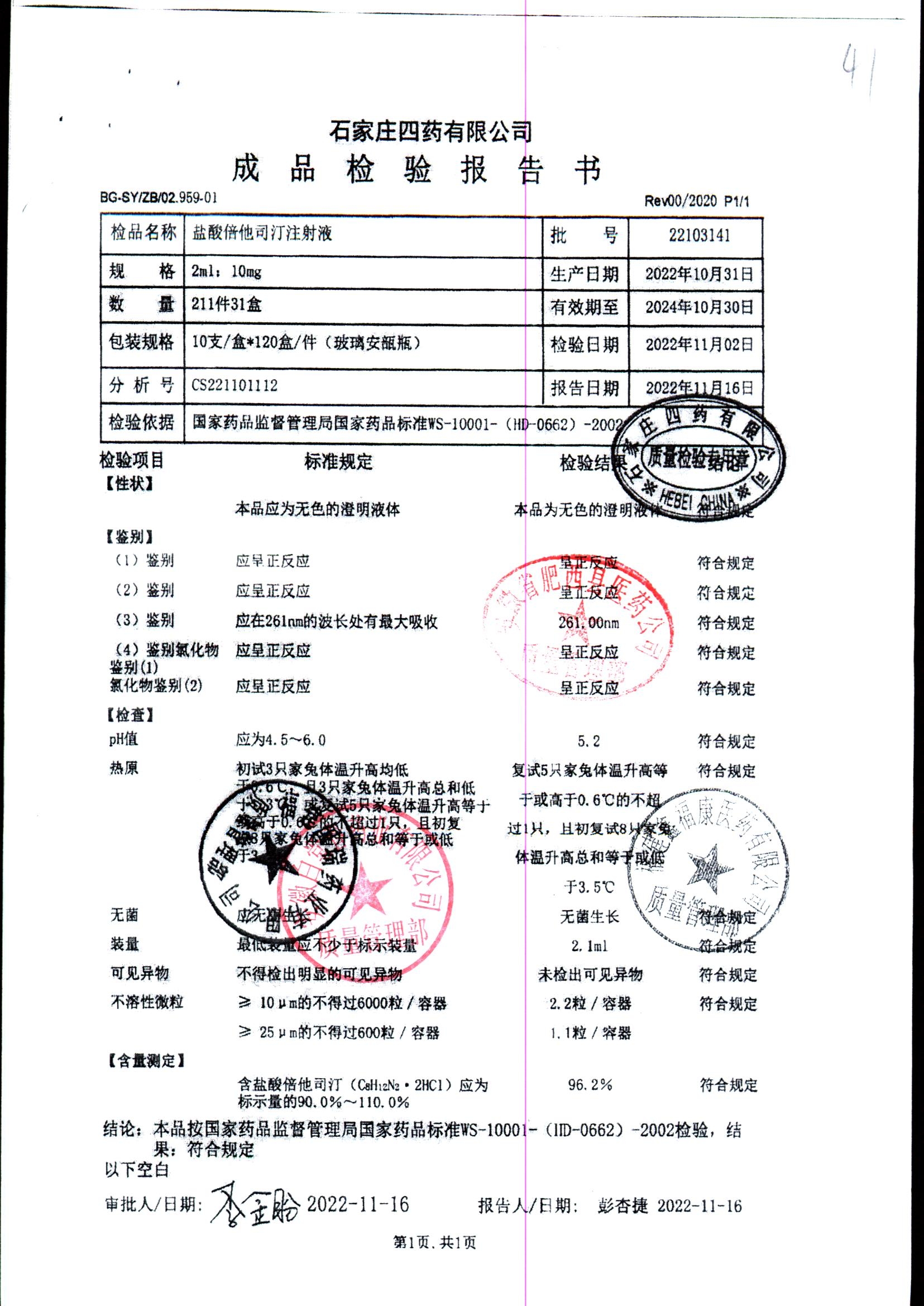 | 鹽酸倍他司汀注射液 | 2ml:10mg | 23080441 | 查看詳情 |