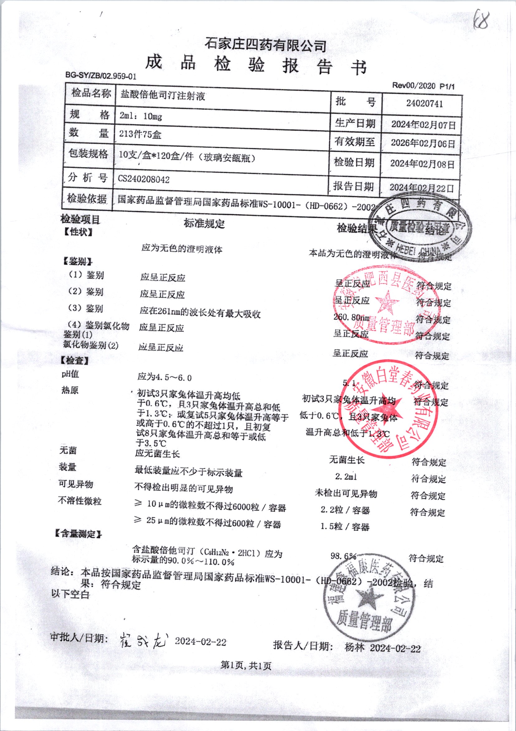 | 鹽酸倍他司汀注射液 | 2ml:10mg | 24021641 | 查看詳情 |