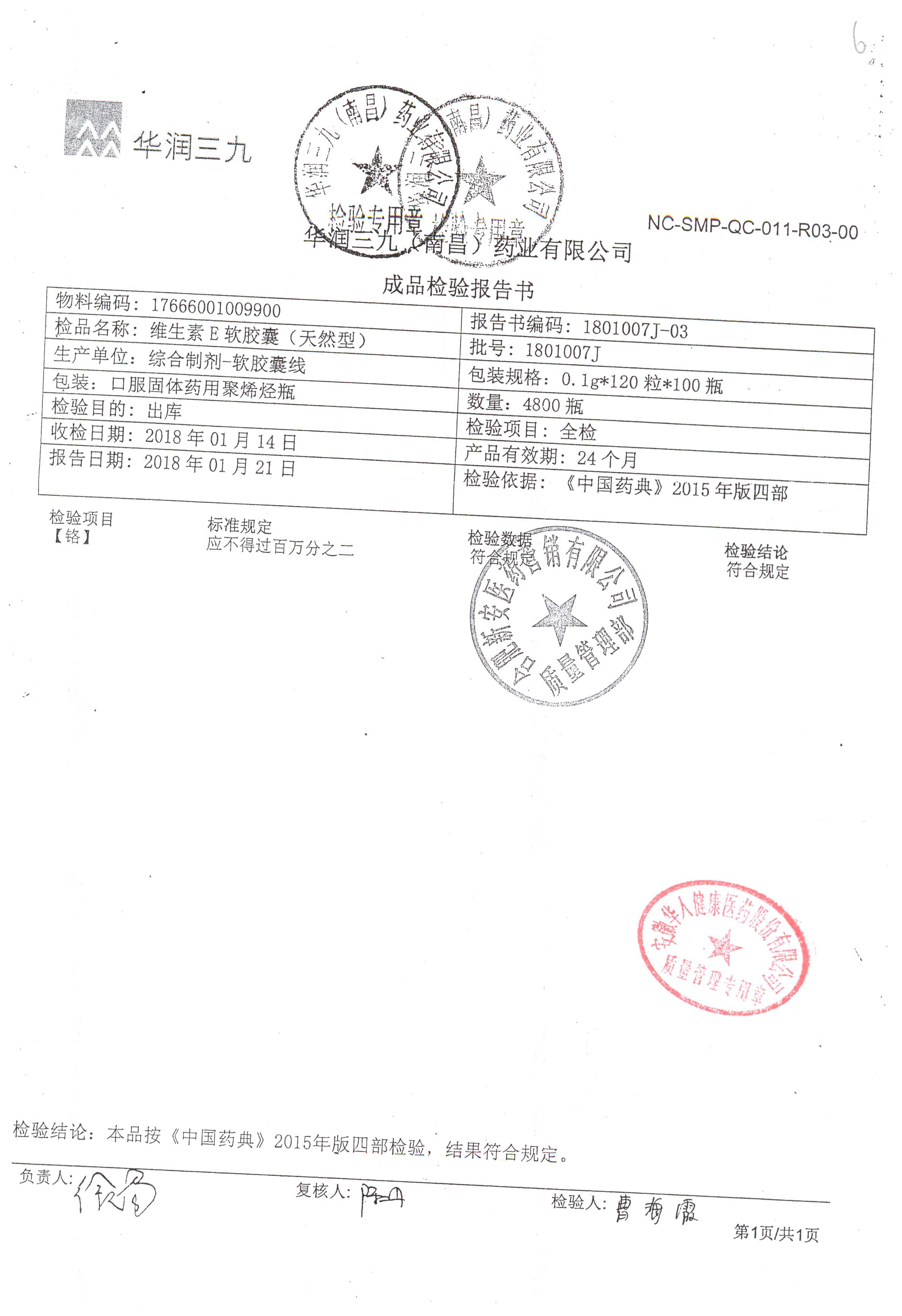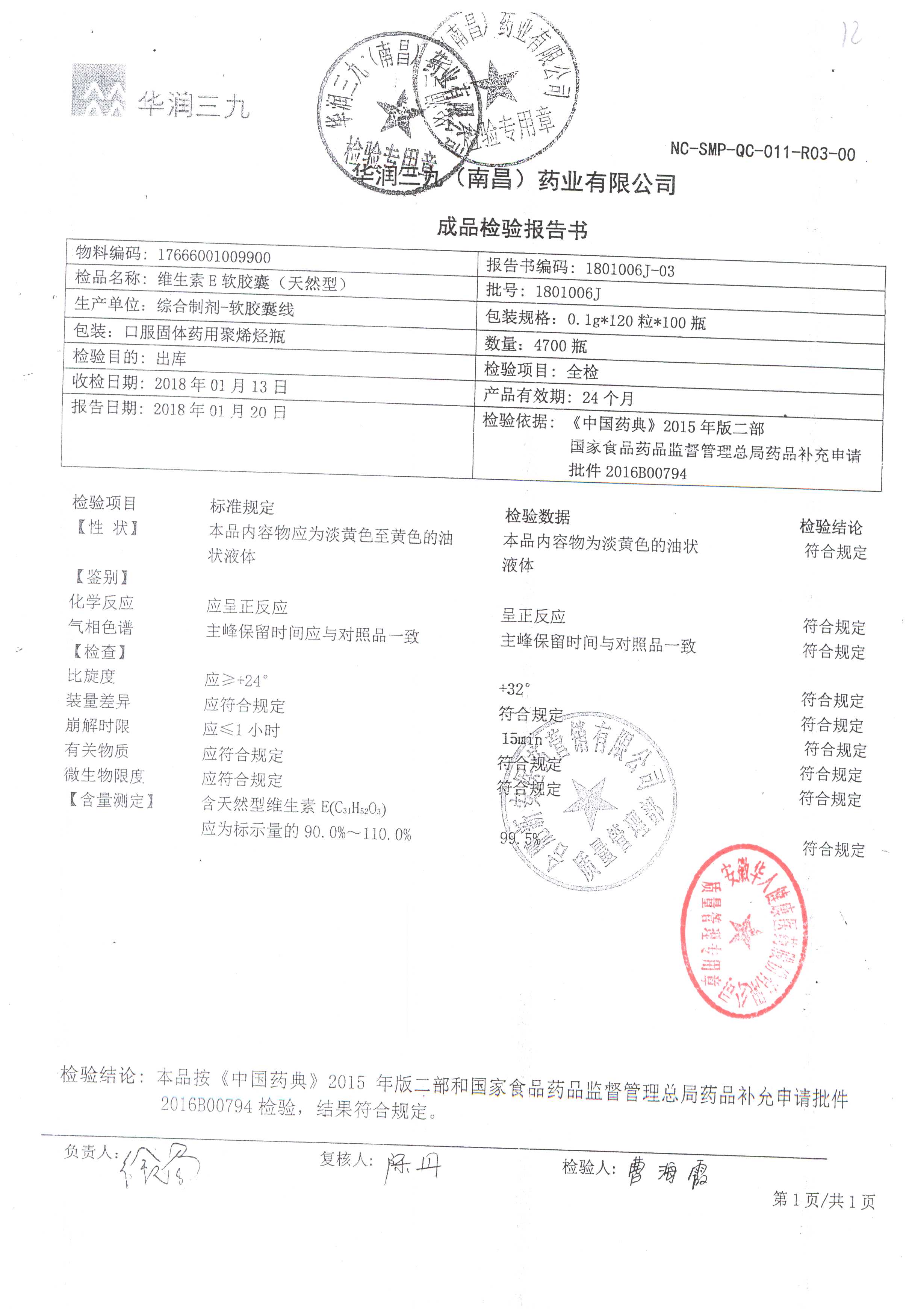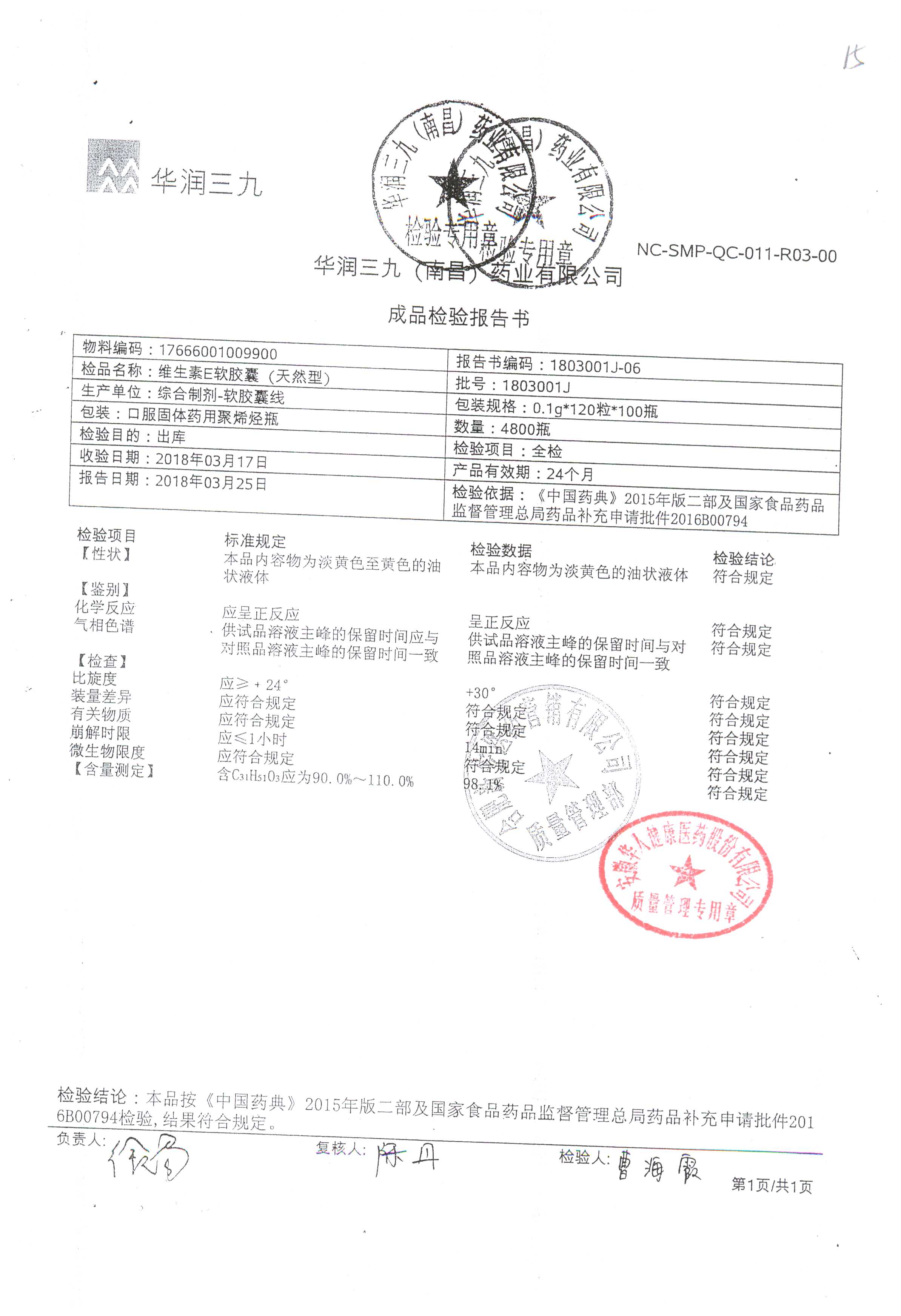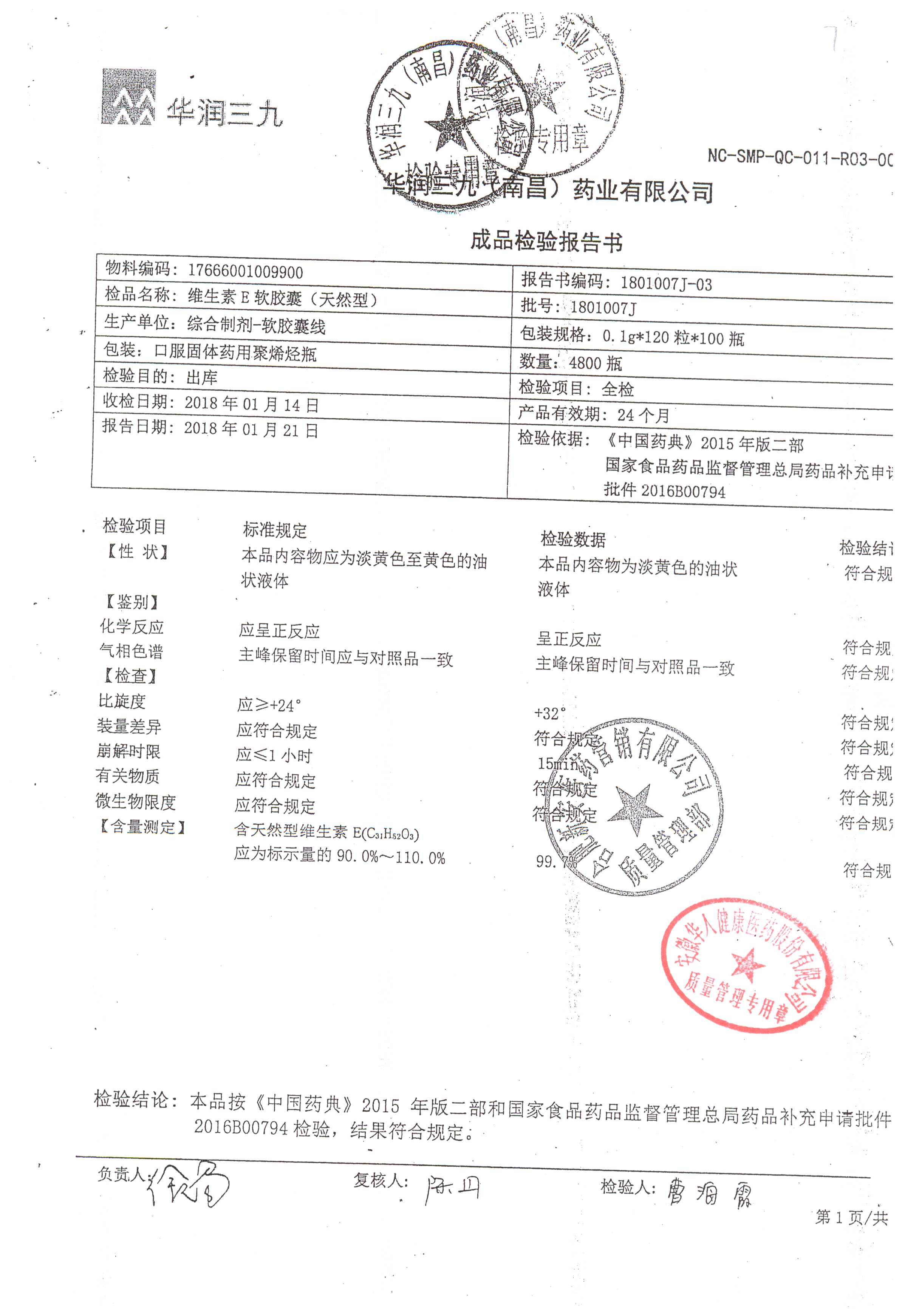 | 維生素E軟膠囊 | 0.1g*120粒 | 1803001J(2/2) | 查看詳情 |