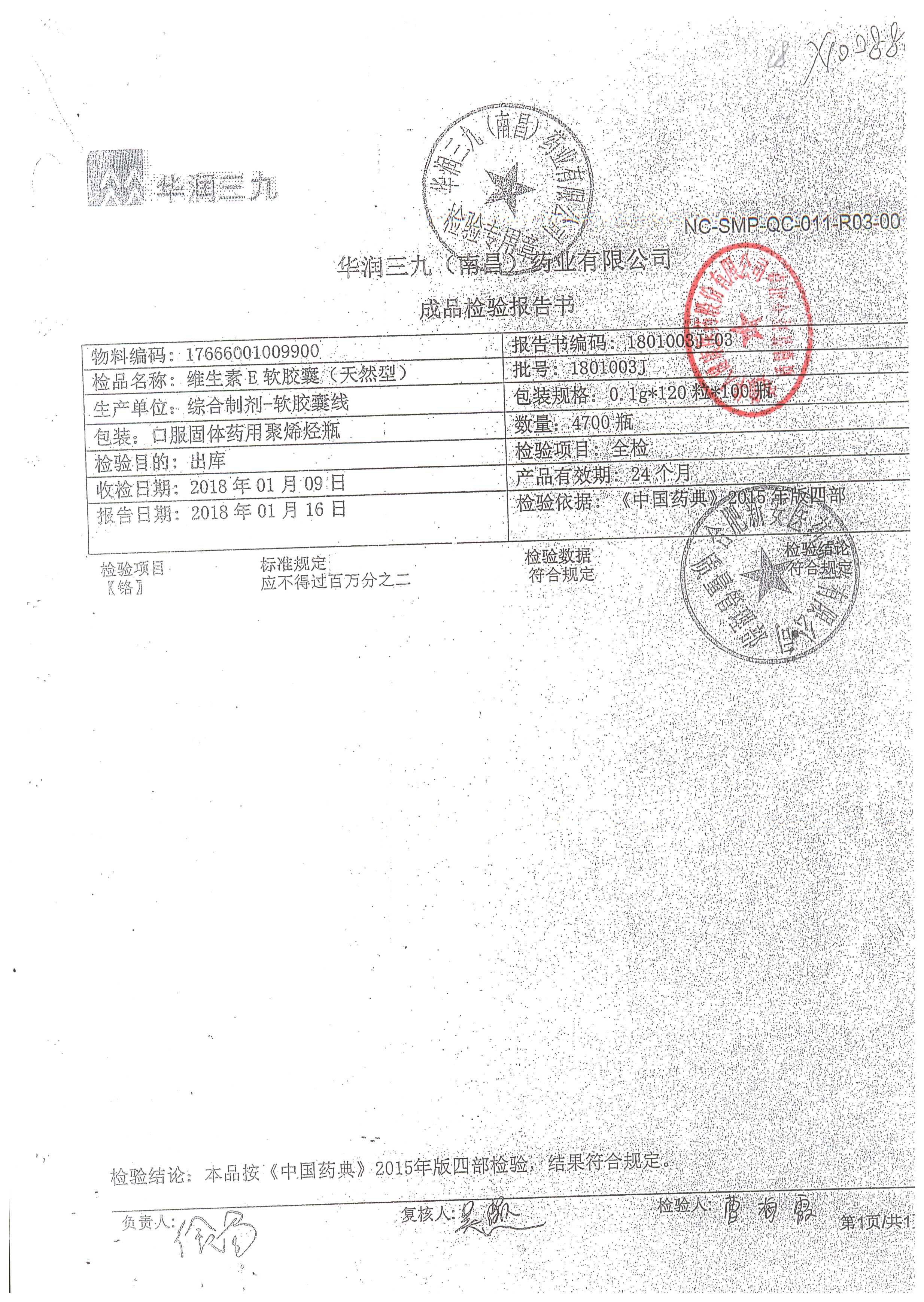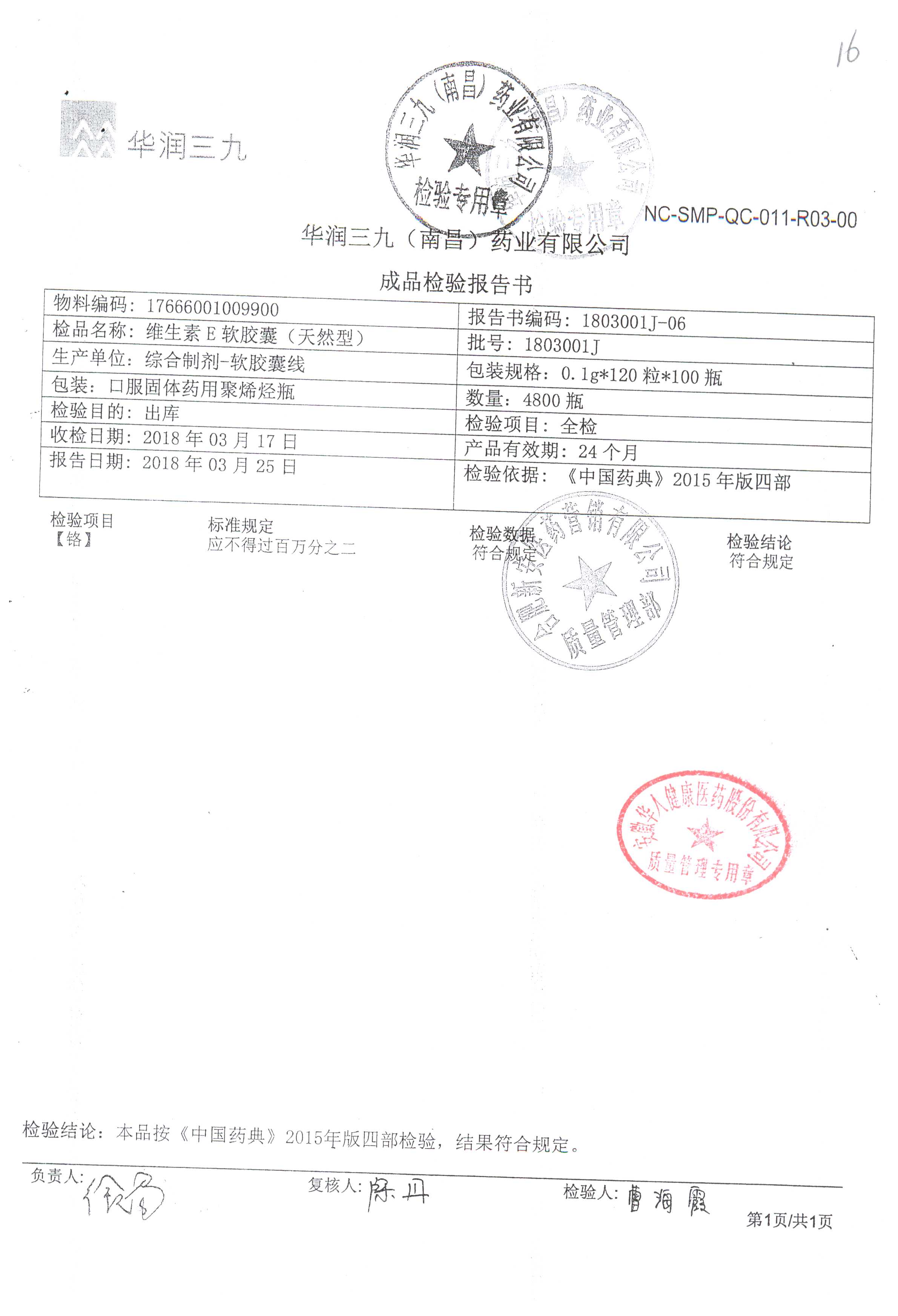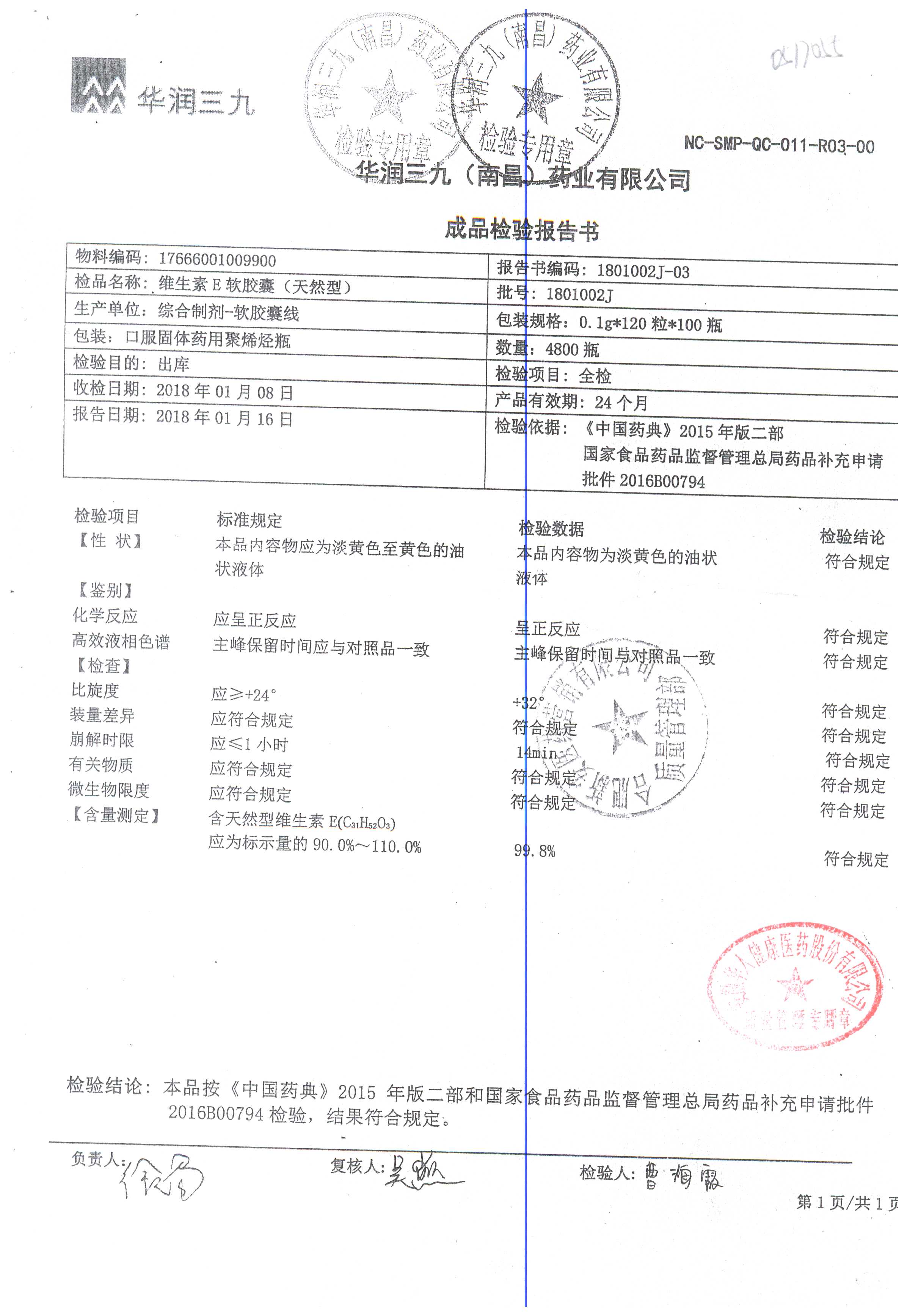 | 維生素E軟膠囊 | 0.1g*120粒 | 1803001J(2/2) | 查看詳情 |