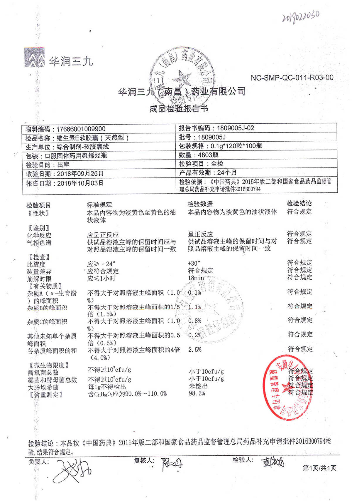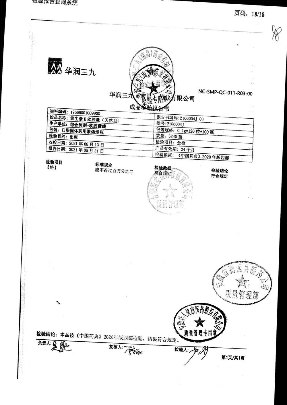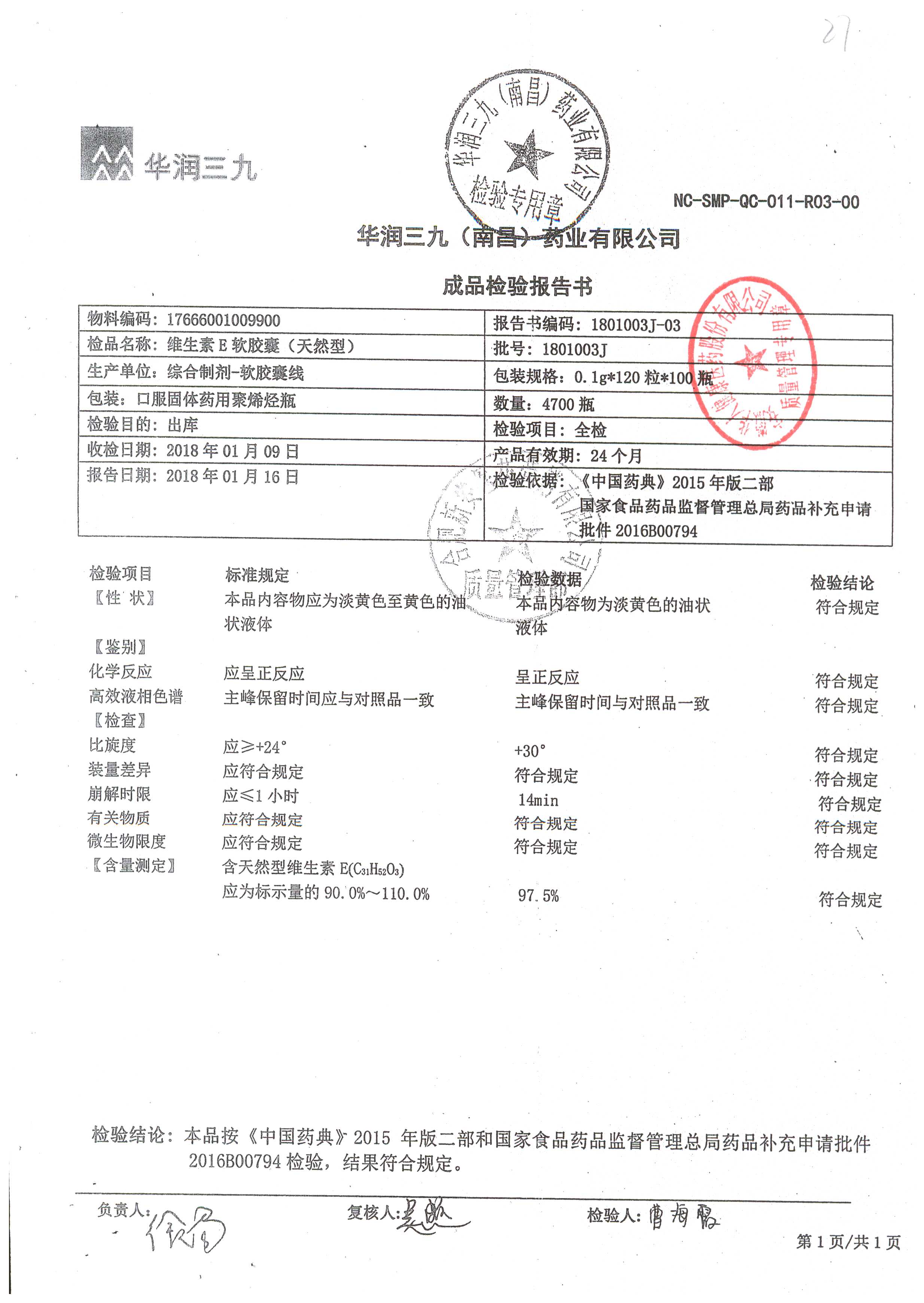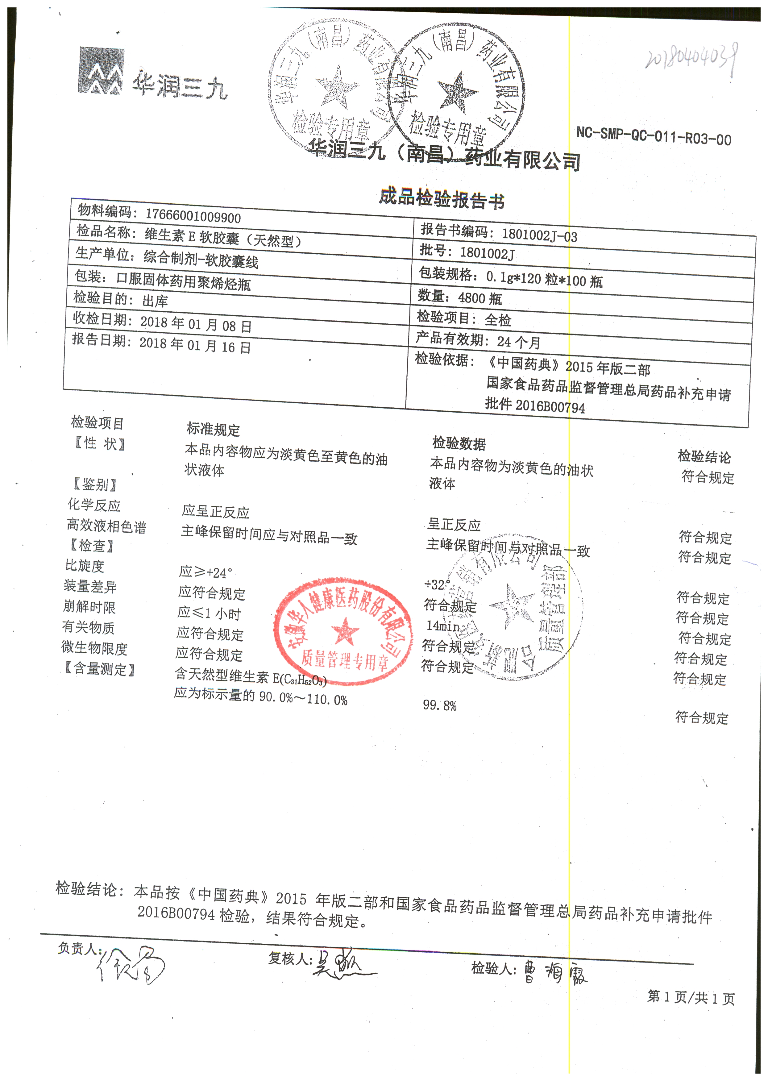 | 維生素E軟膠囊 | 0.1g*120粒 | 1803001J(2/2) | 查看詳情 |