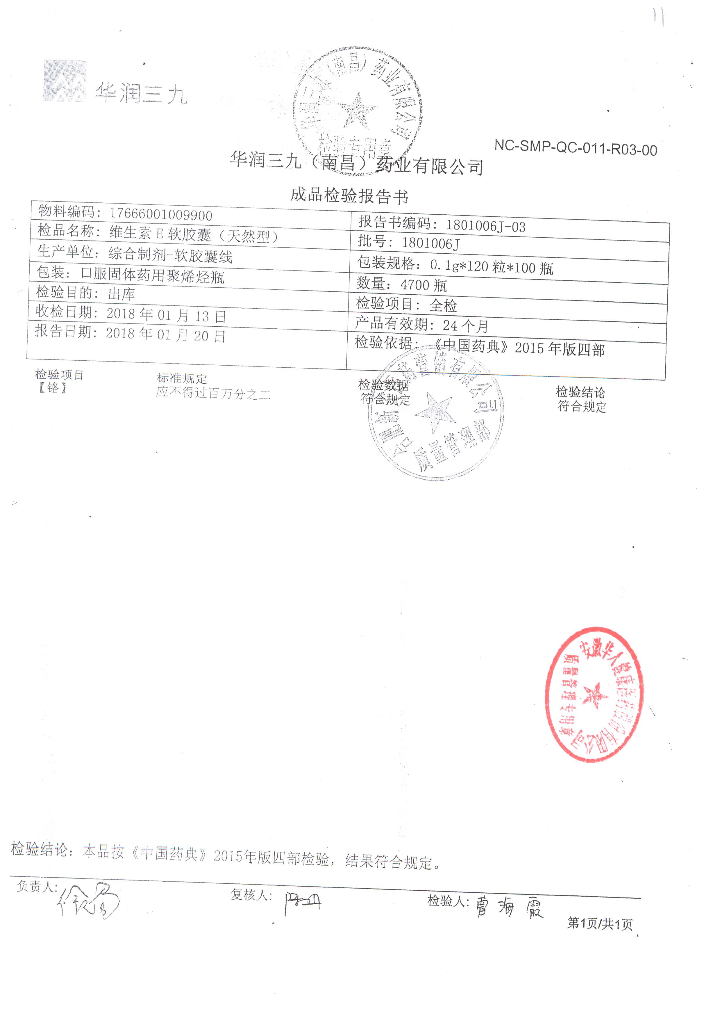 | 維生素E軟膠囊 | 0.1g*120粒 | 1801003J(2/2) | 查看詳情 |