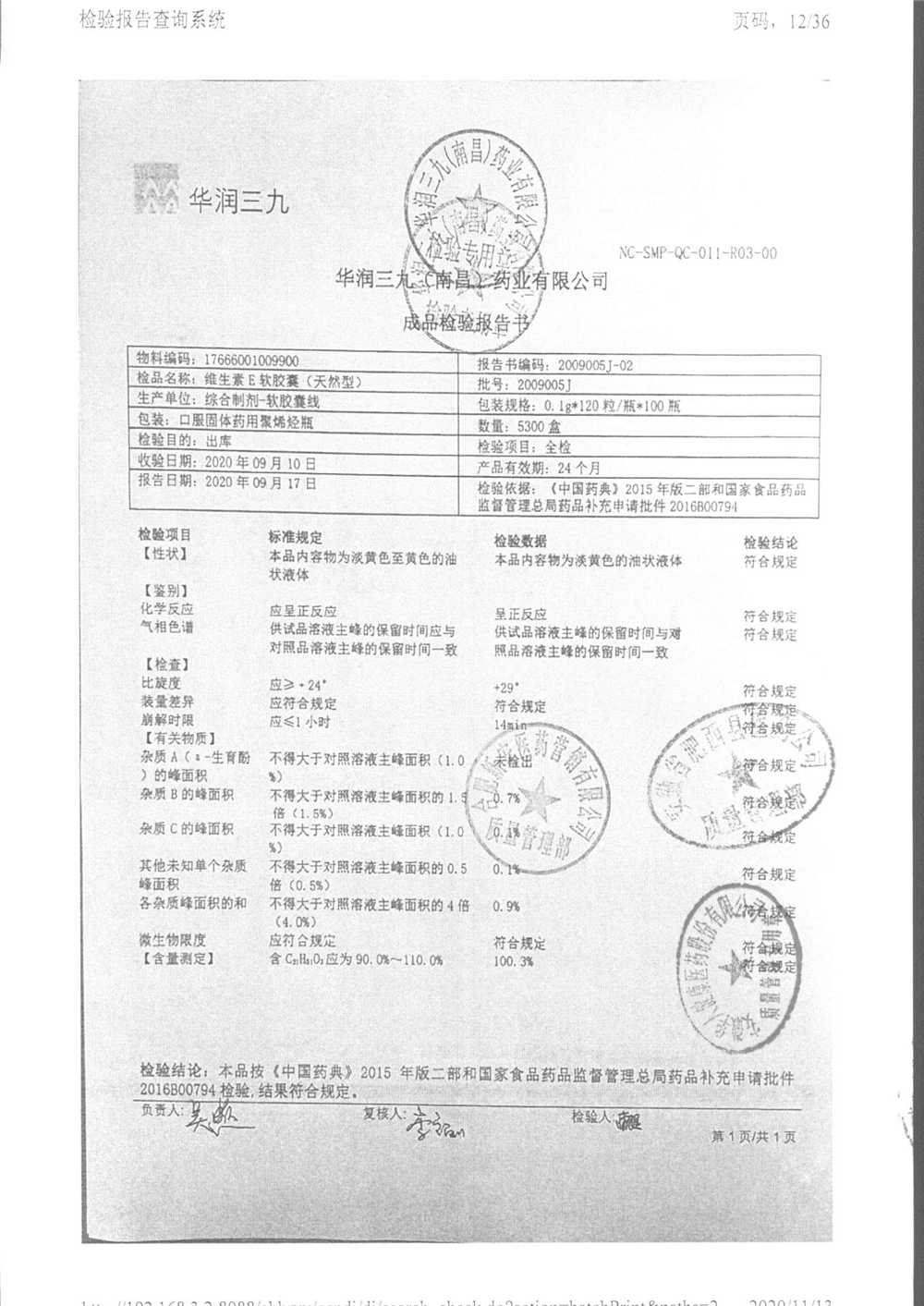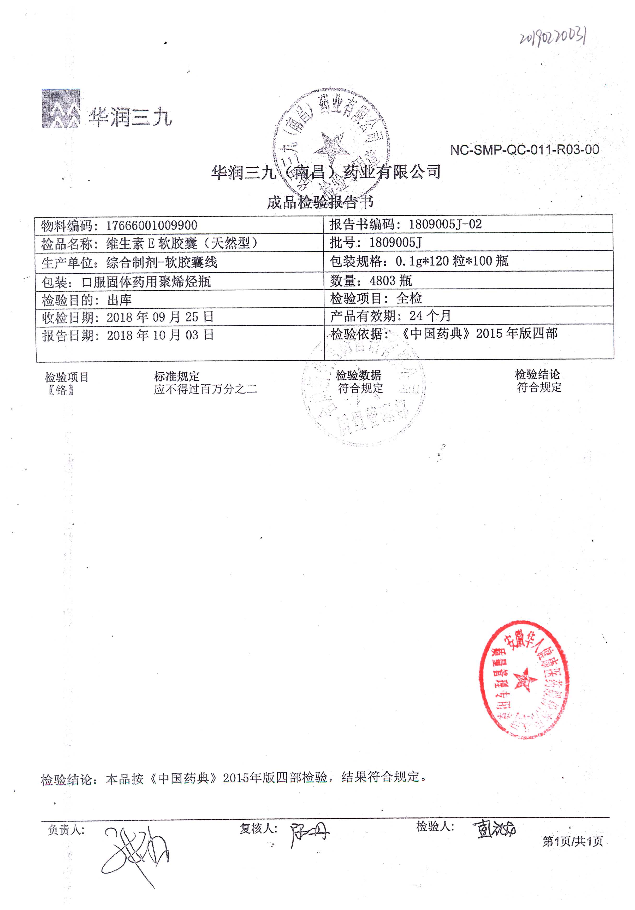 | 維生素E軟膠囊 | 0.1g*120粒 | 1809005J(1/2) | 查看詳情 |
