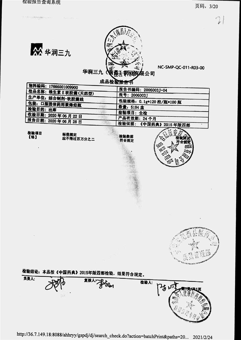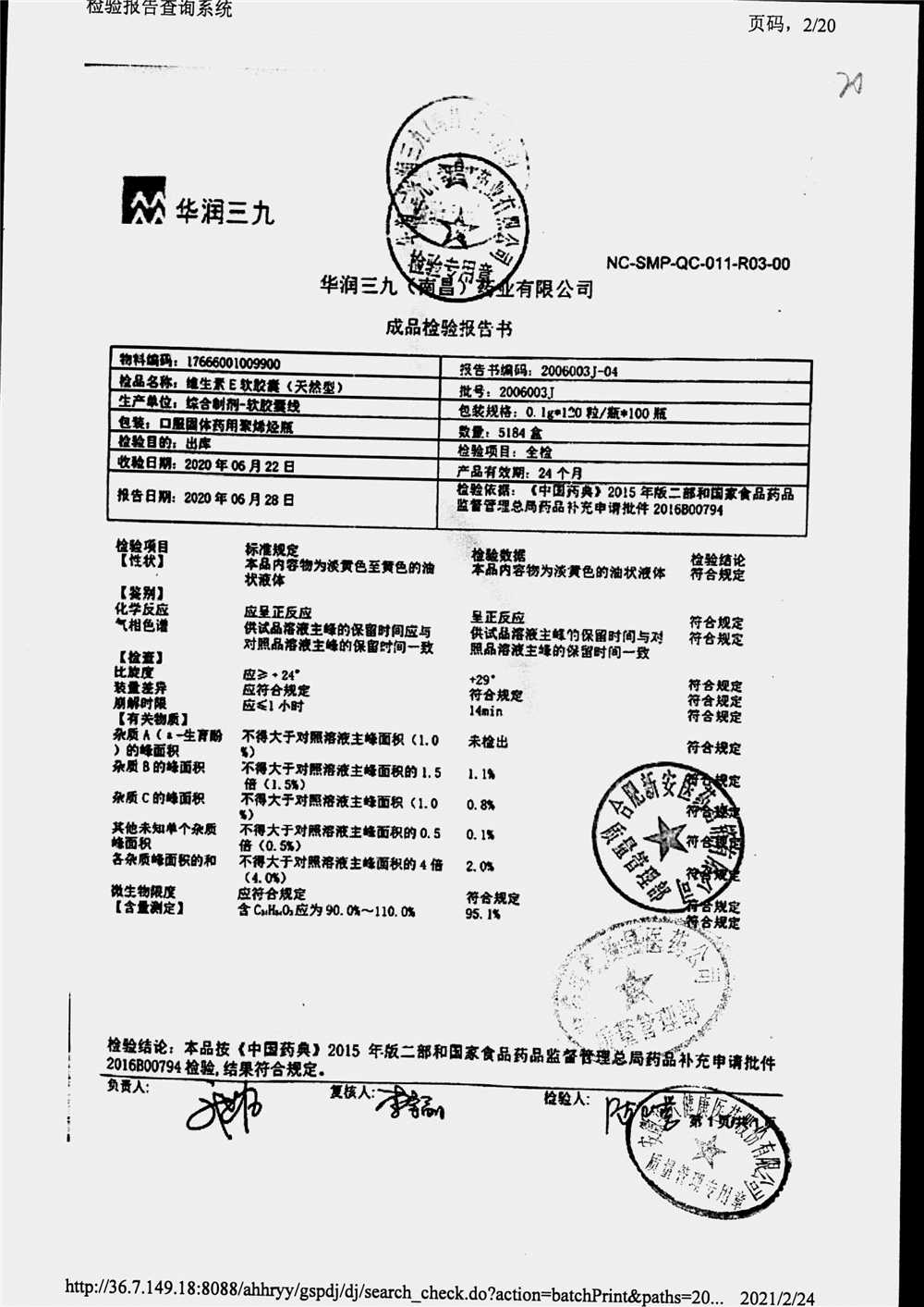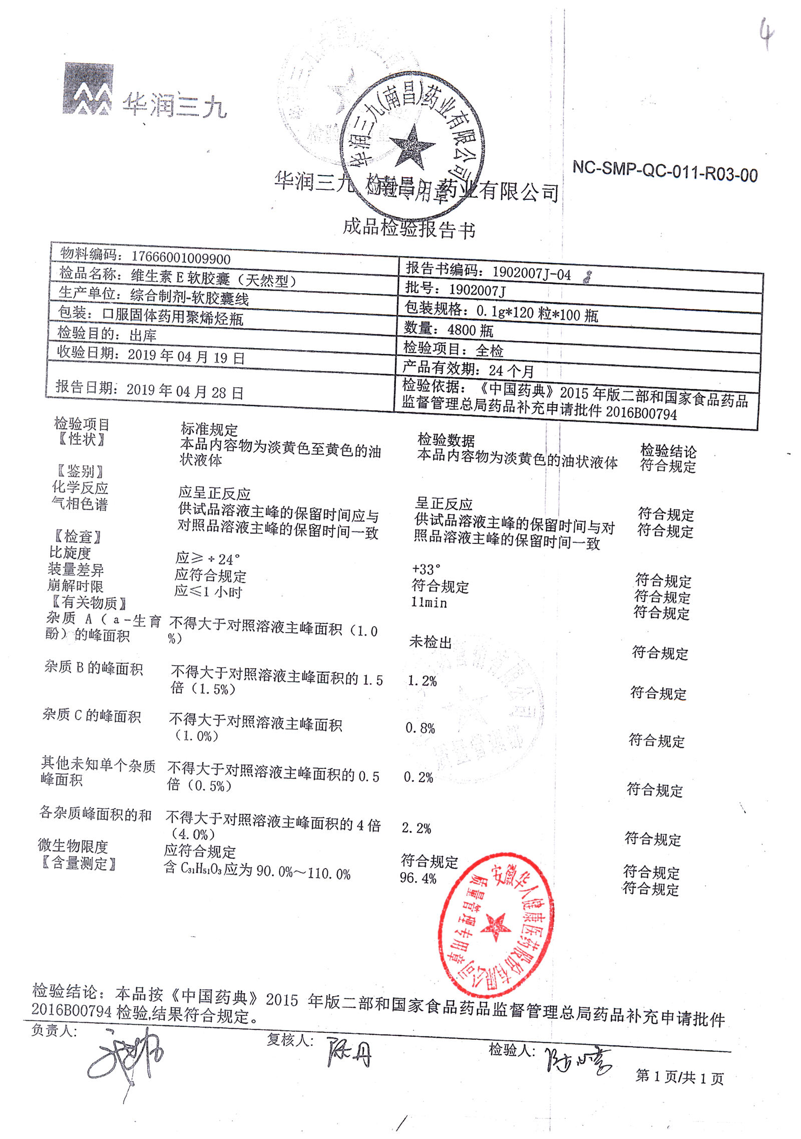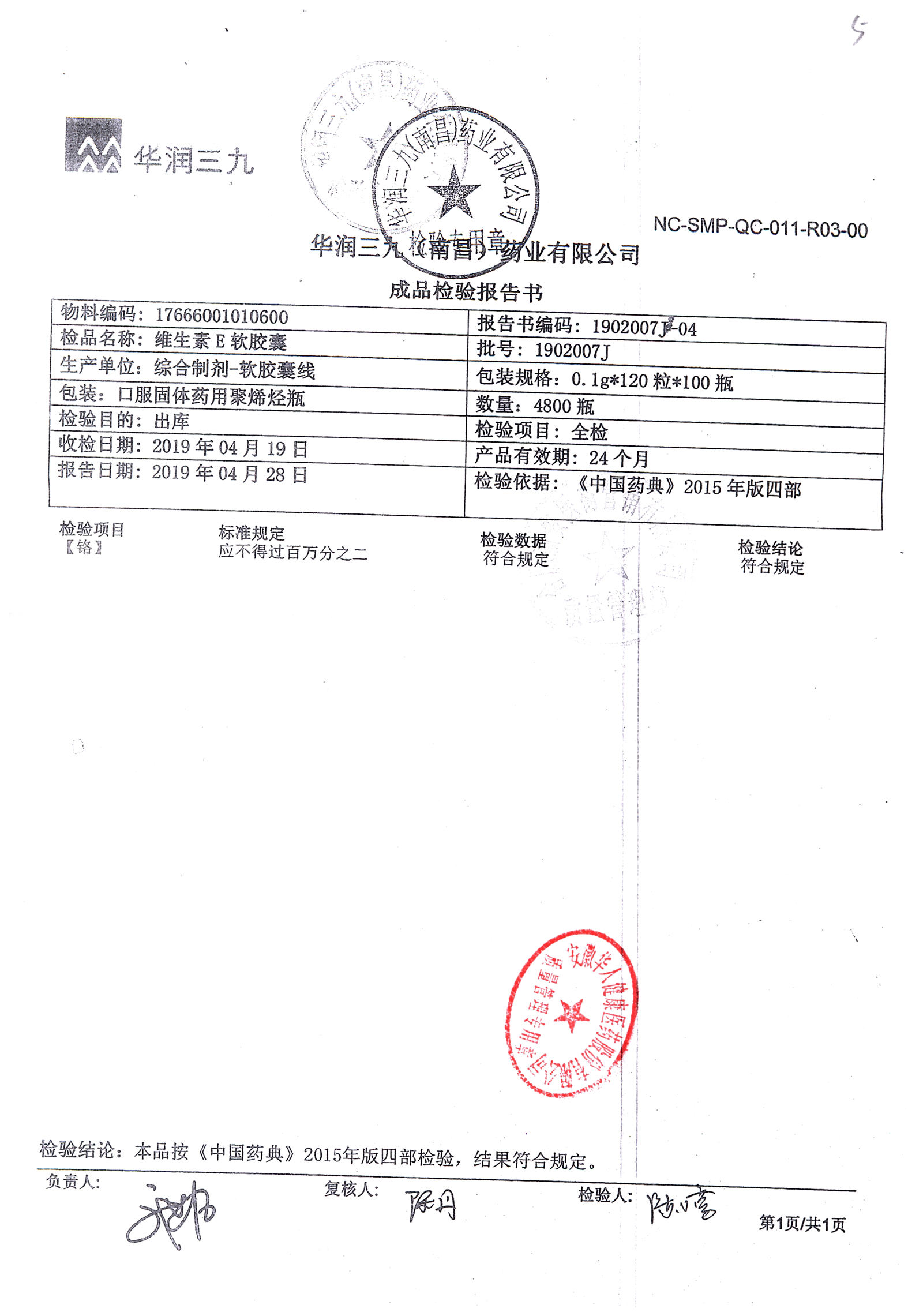 | 維生素E軟膠囊 | 0.1g*120粒 | 1902007J(2/2) | 查看詳情 |