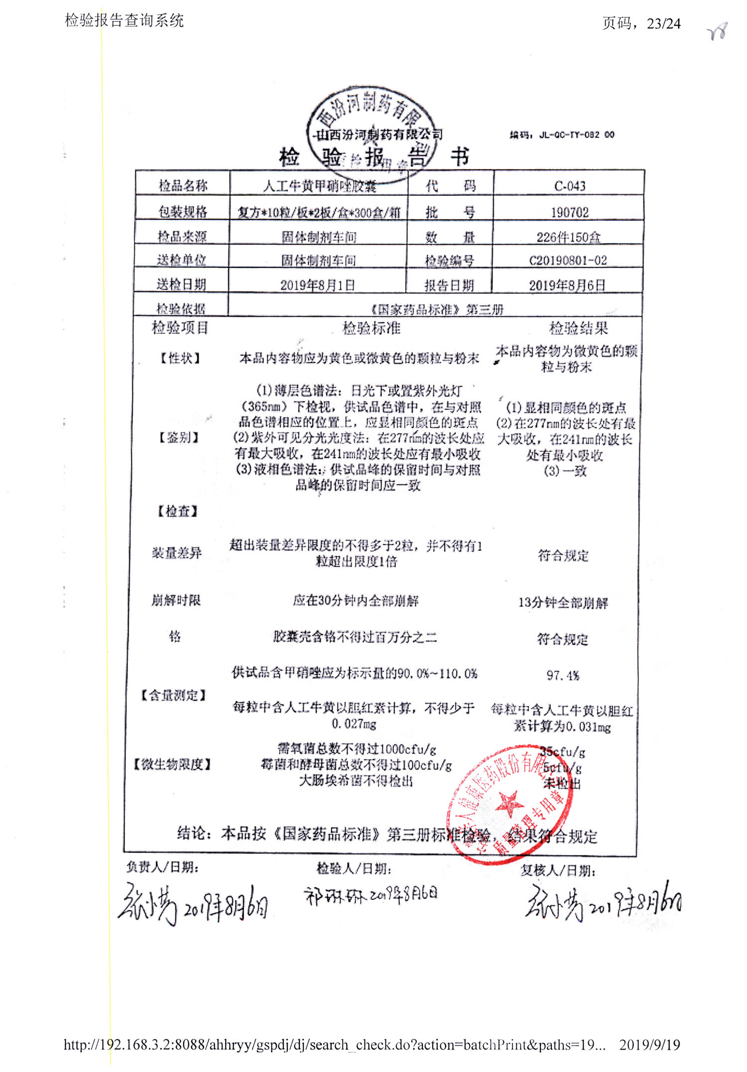 | 人工牛黃甲硝唑膠囊 | 復(fù)方*20粒 | 190702 | 查看詳情 |
