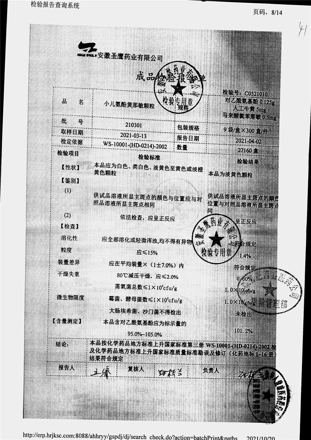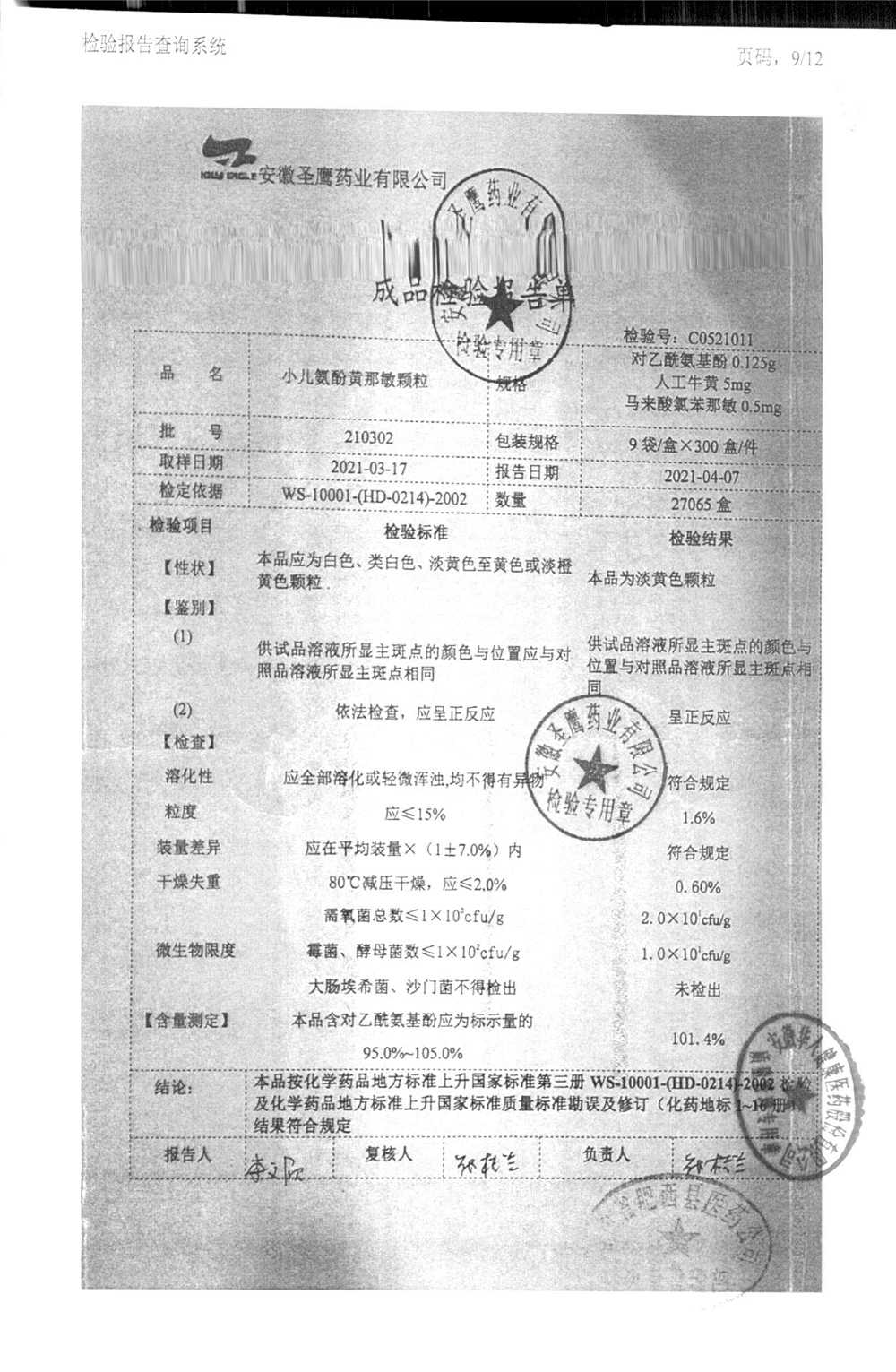 | 小兒氨酚黃那敏顆粒 | 9袋 | 210301 | 查看詳情 |