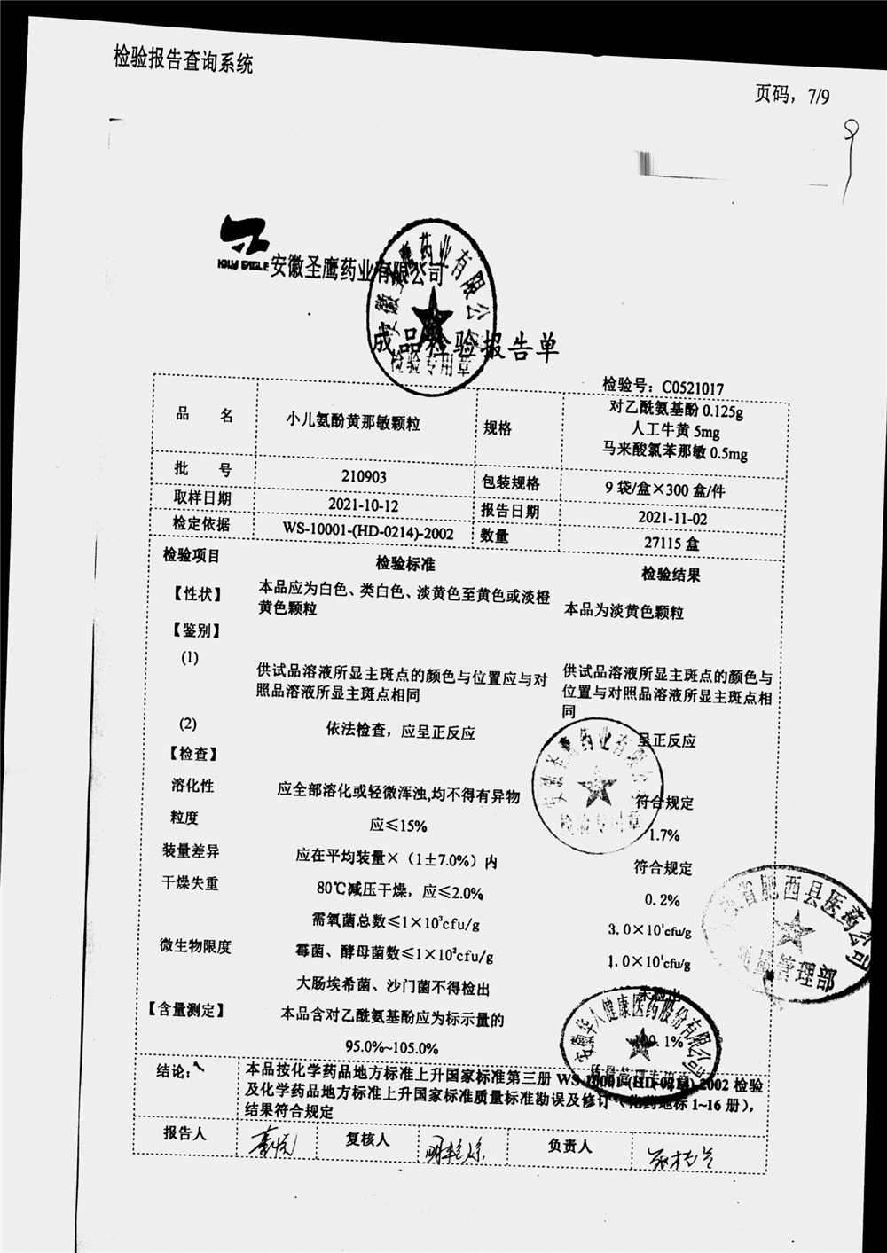 | 小兒氨酚黃那敏顆粒 | 9袋 | 210903 | 查看詳情 |