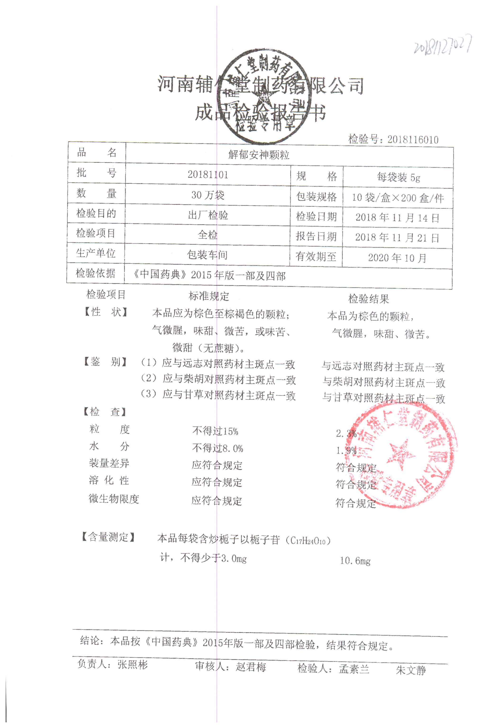 | 解郁安神顆粒 | 5g*10袋 | 20181101 | 查看詳情 |
