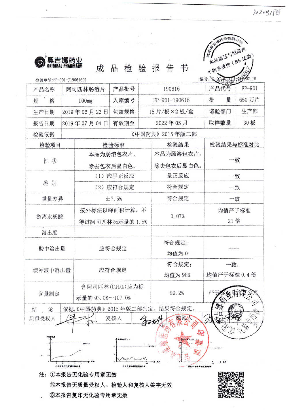 | 阿司匹林腸溶片 | 100mg*36片 | 190616 | 查看詳情 |