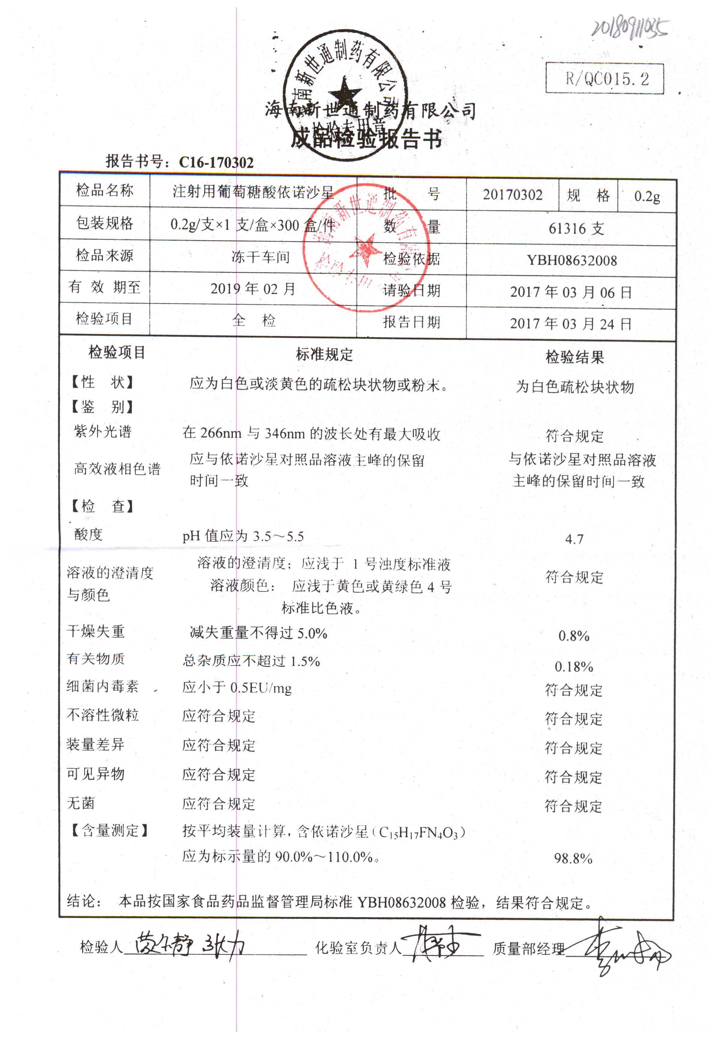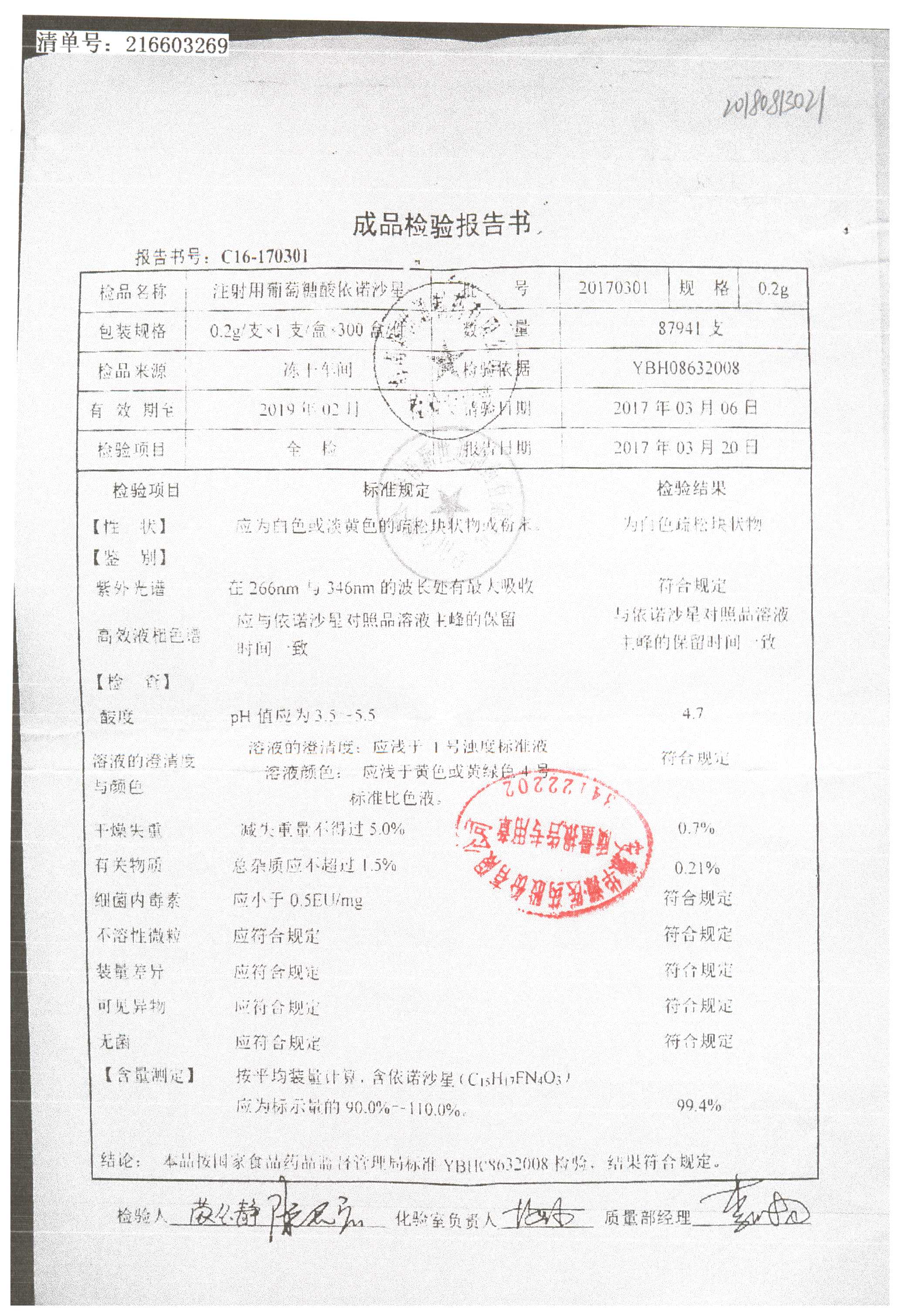 注射用葡萄糖酸依諾沙星 0.2g 20170301 查看詳情