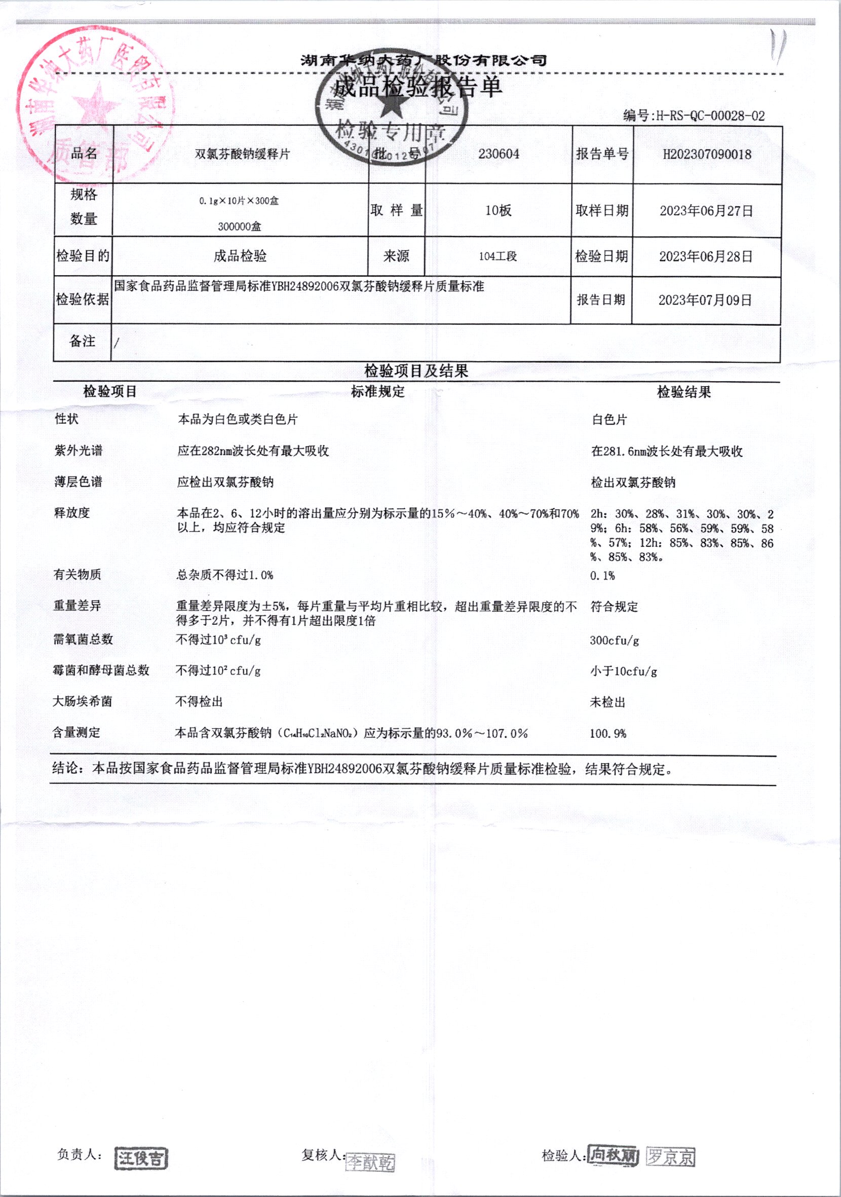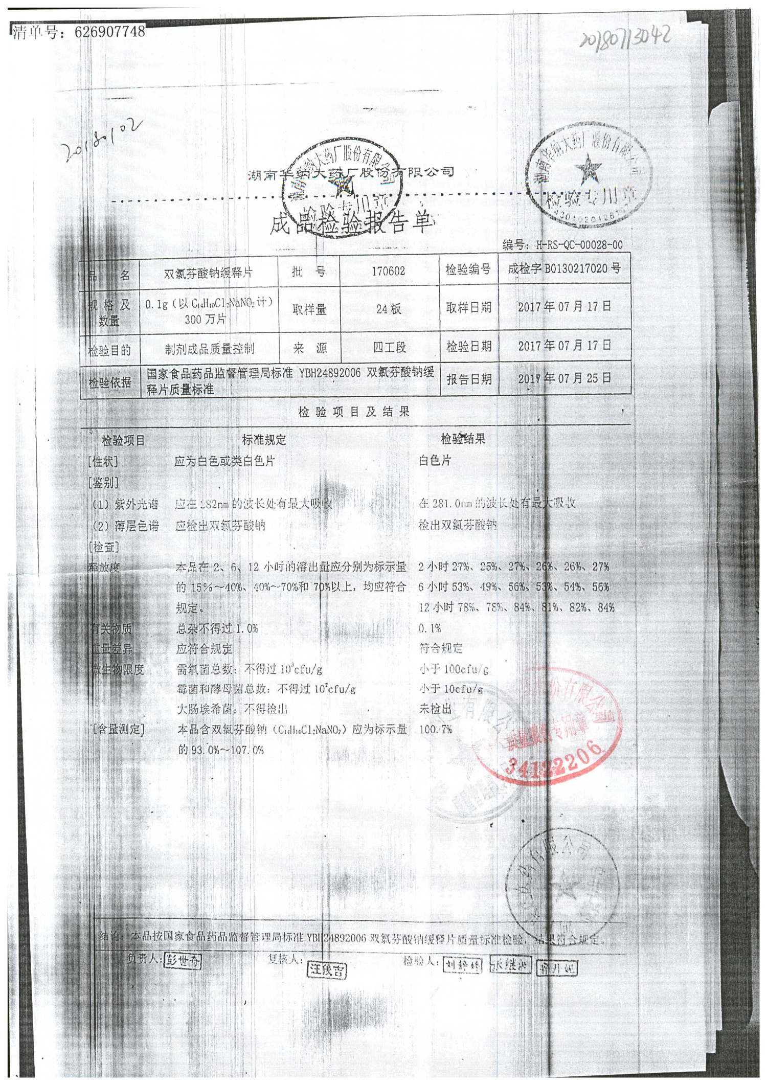 | 雙氯芬酸鈉緩釋片 | 0.1g | 170602 | 查看詳情 |