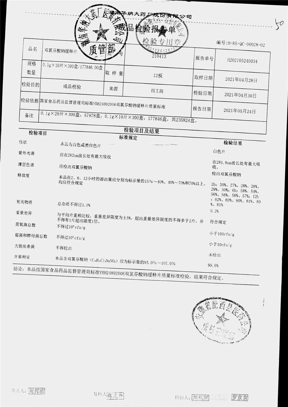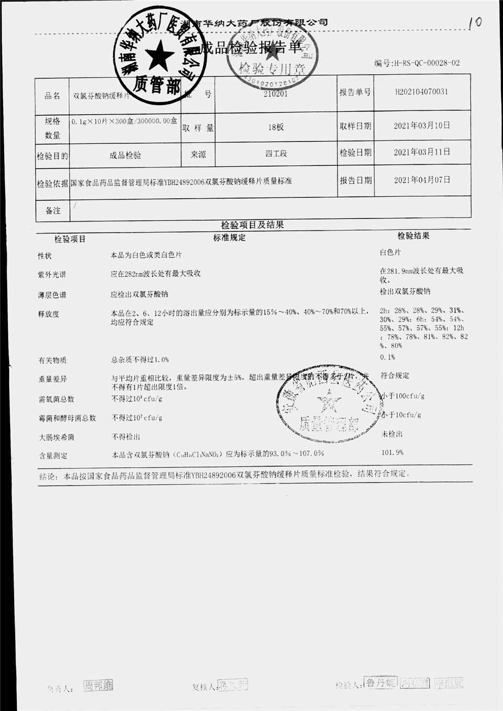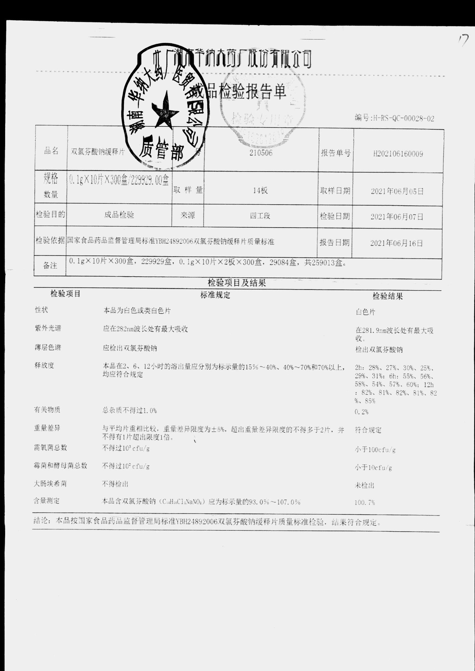 | 雙氯芬酸鈉緩釋片 | 0.1g | 210506 | 查看詳情 |