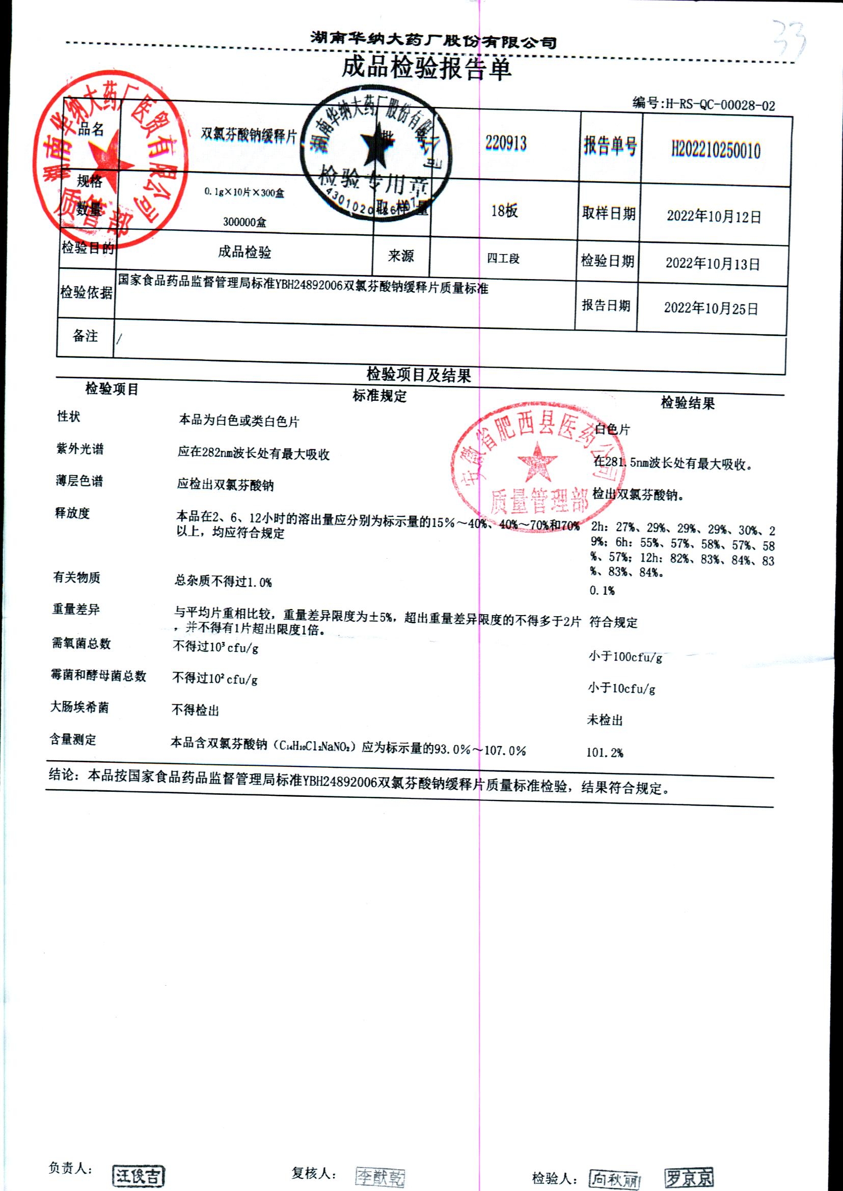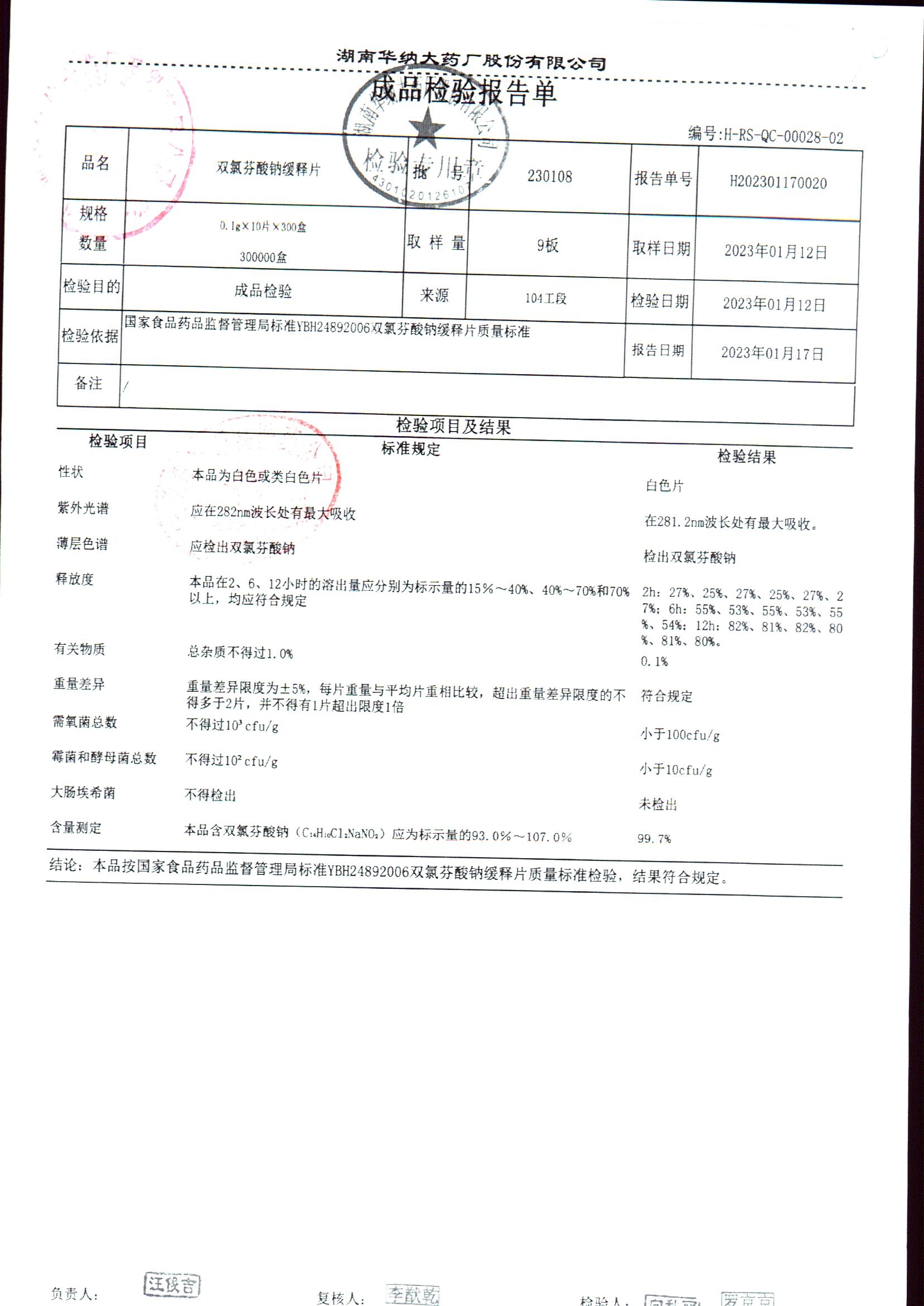 | 雙氯芬酸鈉緩釋片 | 0.1g | 220913 | 查看詳情 |