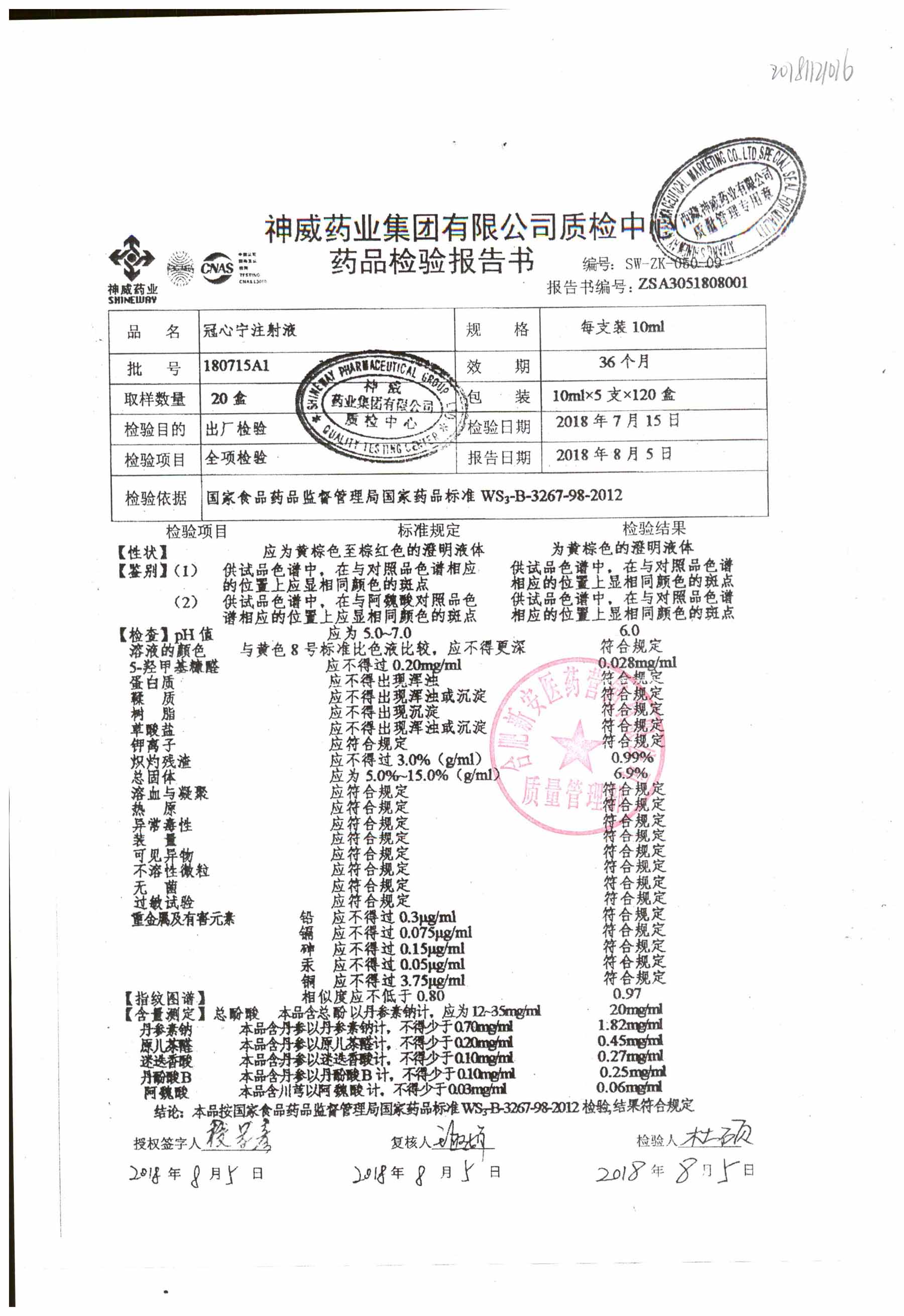 | 冠心寧注射液 | 10ml*5支 | 180715A1 | 查看詳情 |