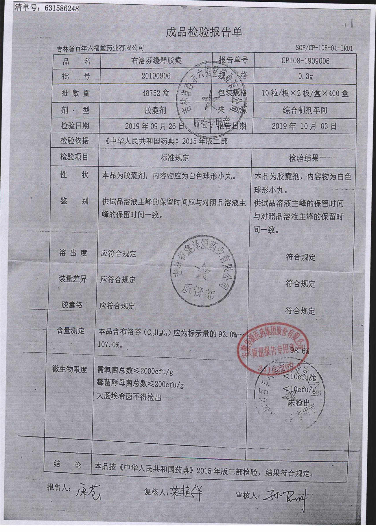 | 布洛芬緩釋膠囊 | 0.3g*12s | 20200607 | 查看詳情 |