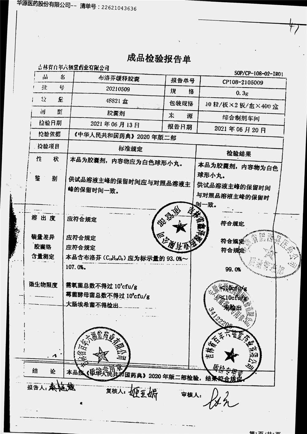 | 布洛芬緩釋膠囊 | 0.3g*12s | 20210509 | 查看詳情 |