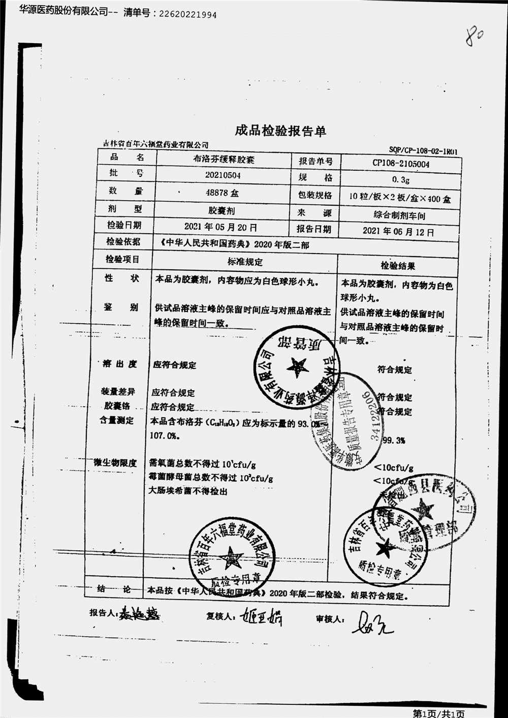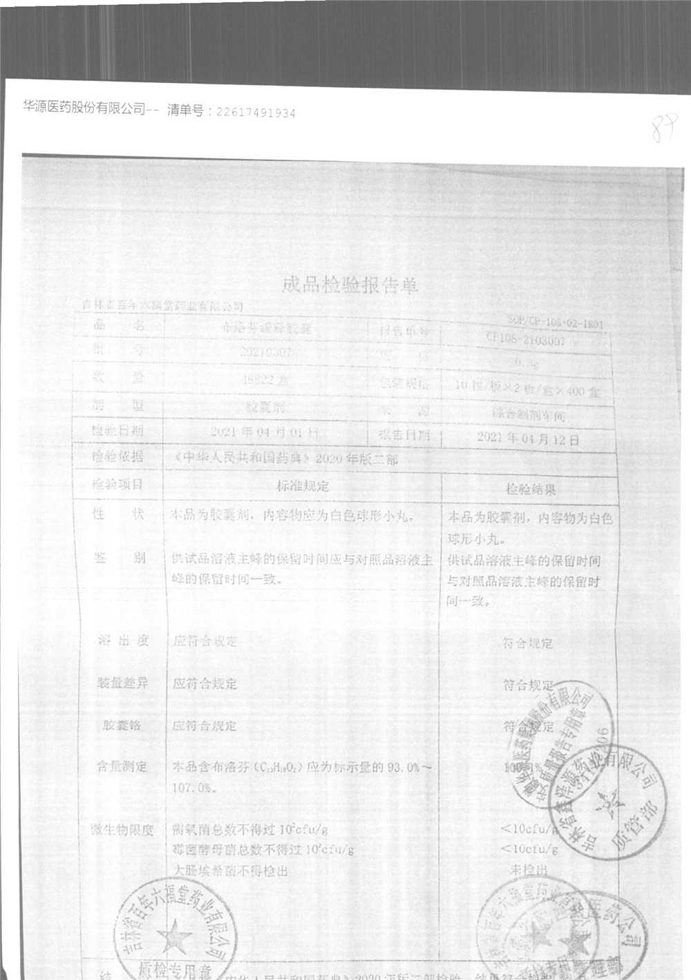 | 布洛芬緩釋膠囊 | 0.3g*12s | 20210504 | 查看詳情 |