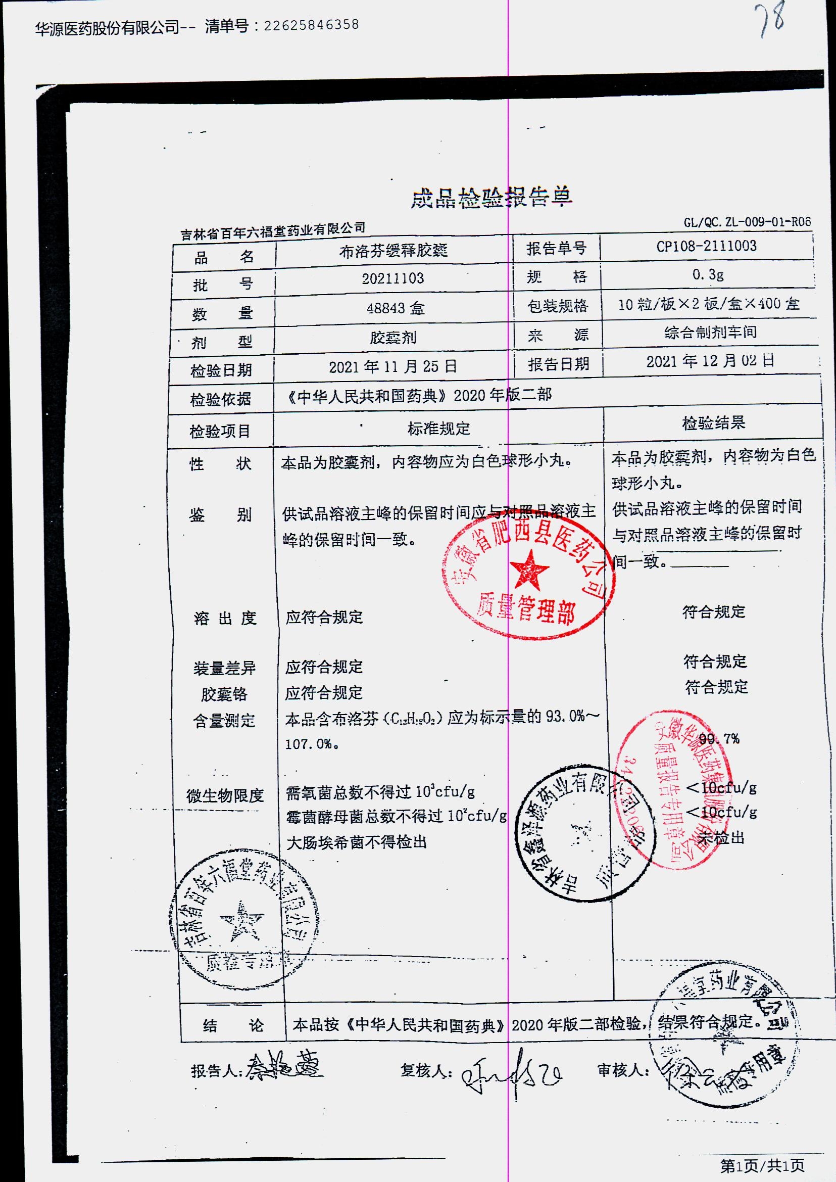| 布洛芬緩釋膠囊 | 0.3g*12s | 20211103 | 查看詳情 |