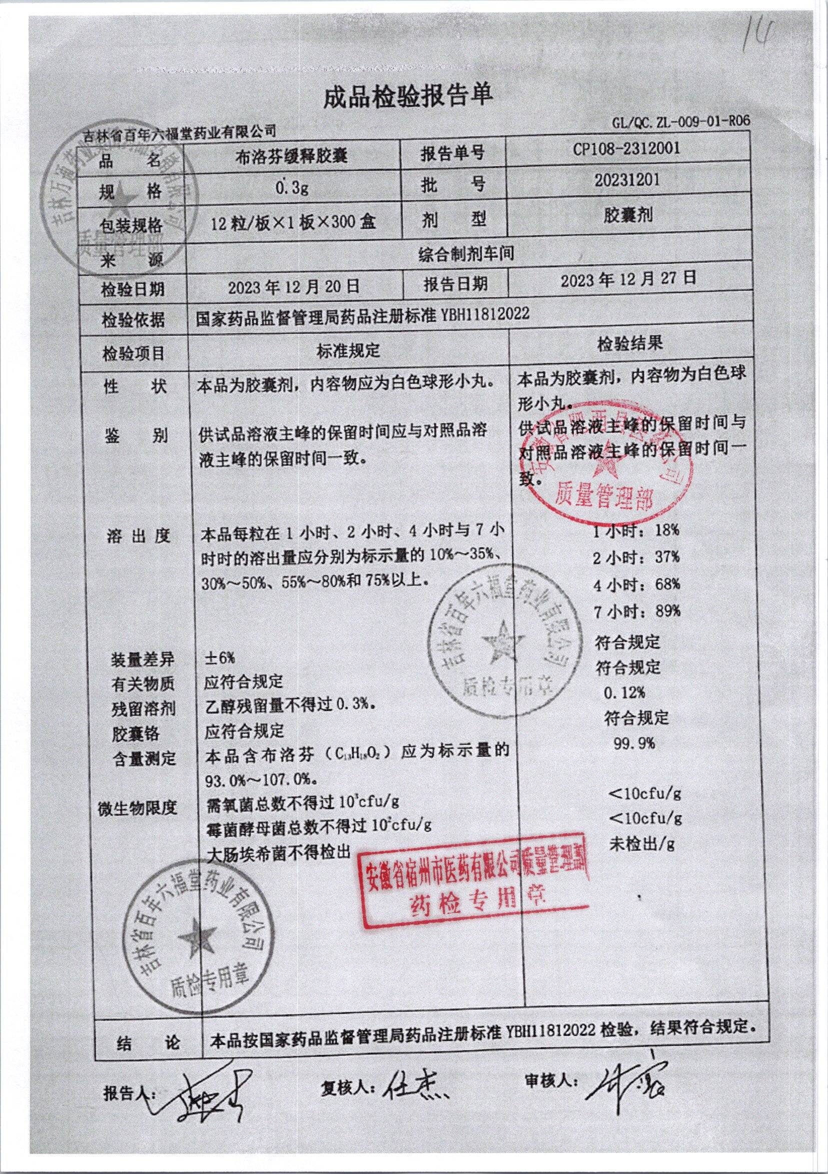 | 布洛芬緩釋膠囊 | 0.3g*12s | 20231201 | 查看詳情 |