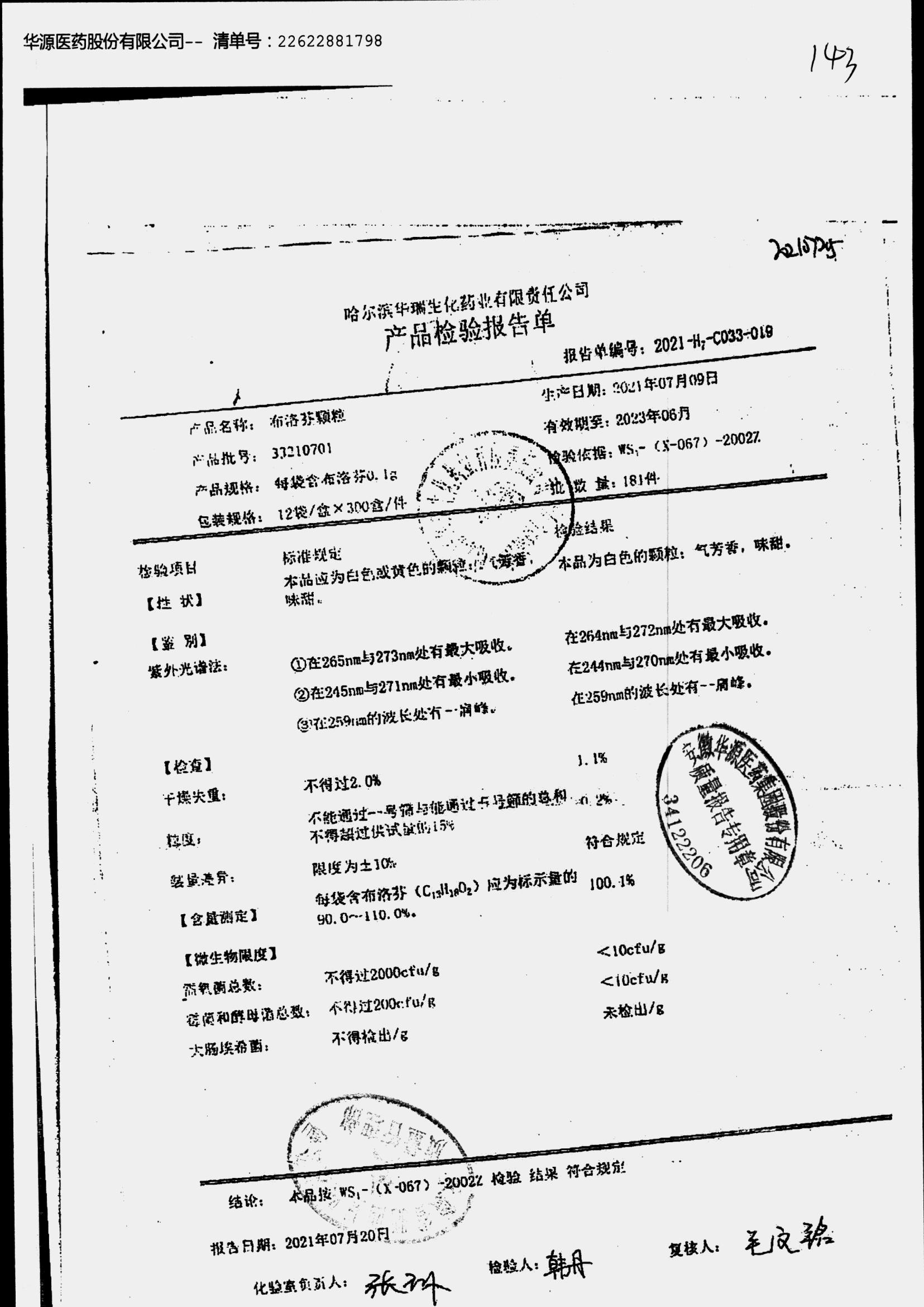 | 布洛芬顆粒 | 0.1g*12袋 | 29210708 | 查看詳情 |
