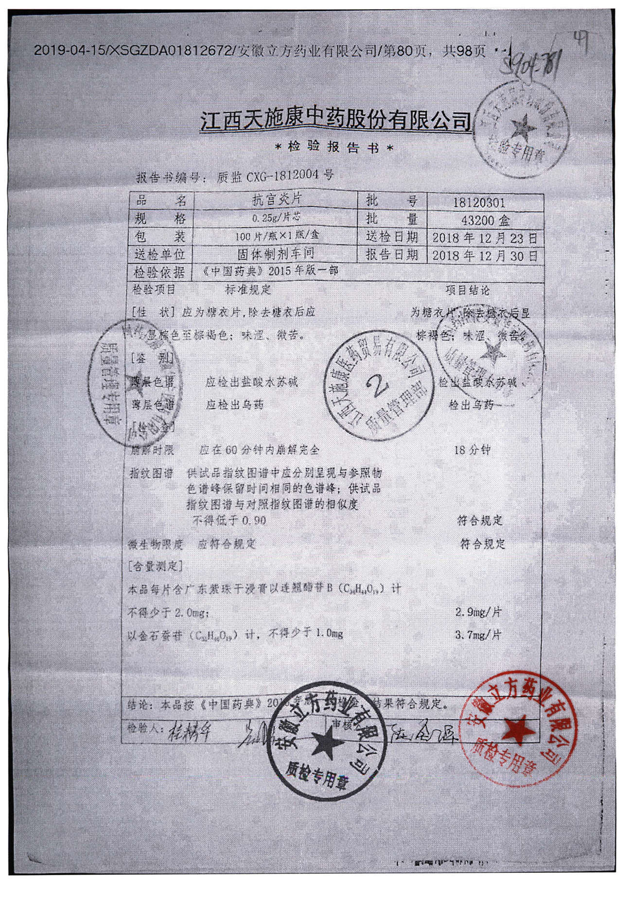 名稱 規(guī)格 批號(hào) 藥檢報(bào)告