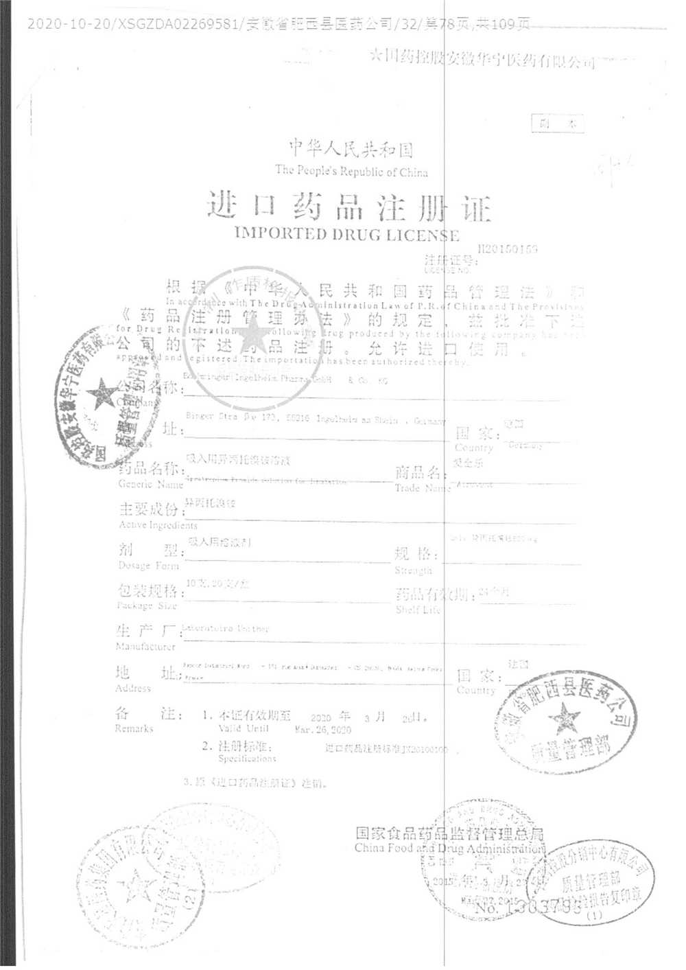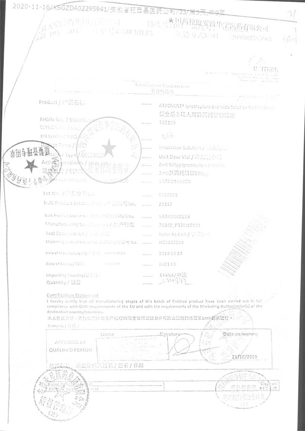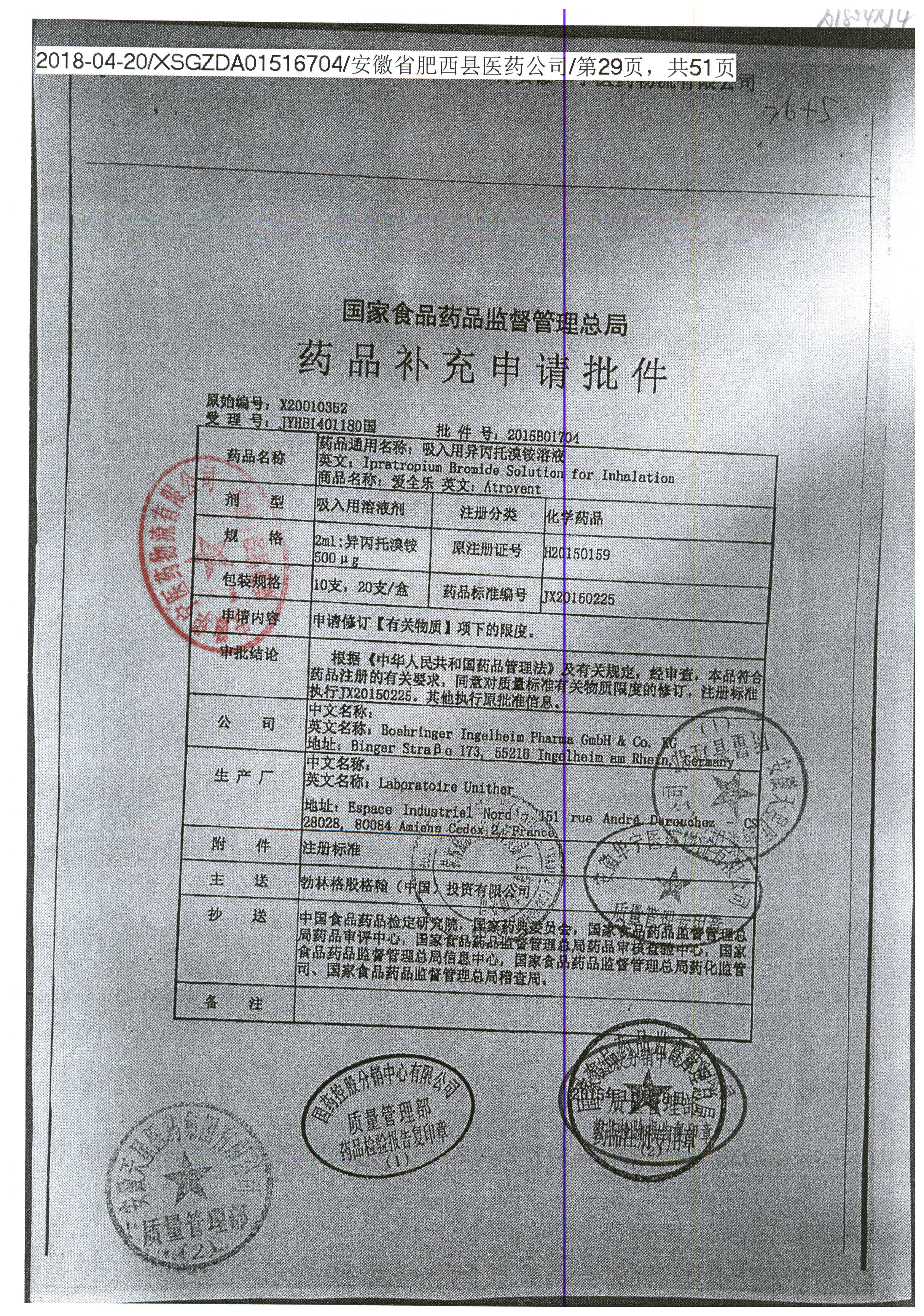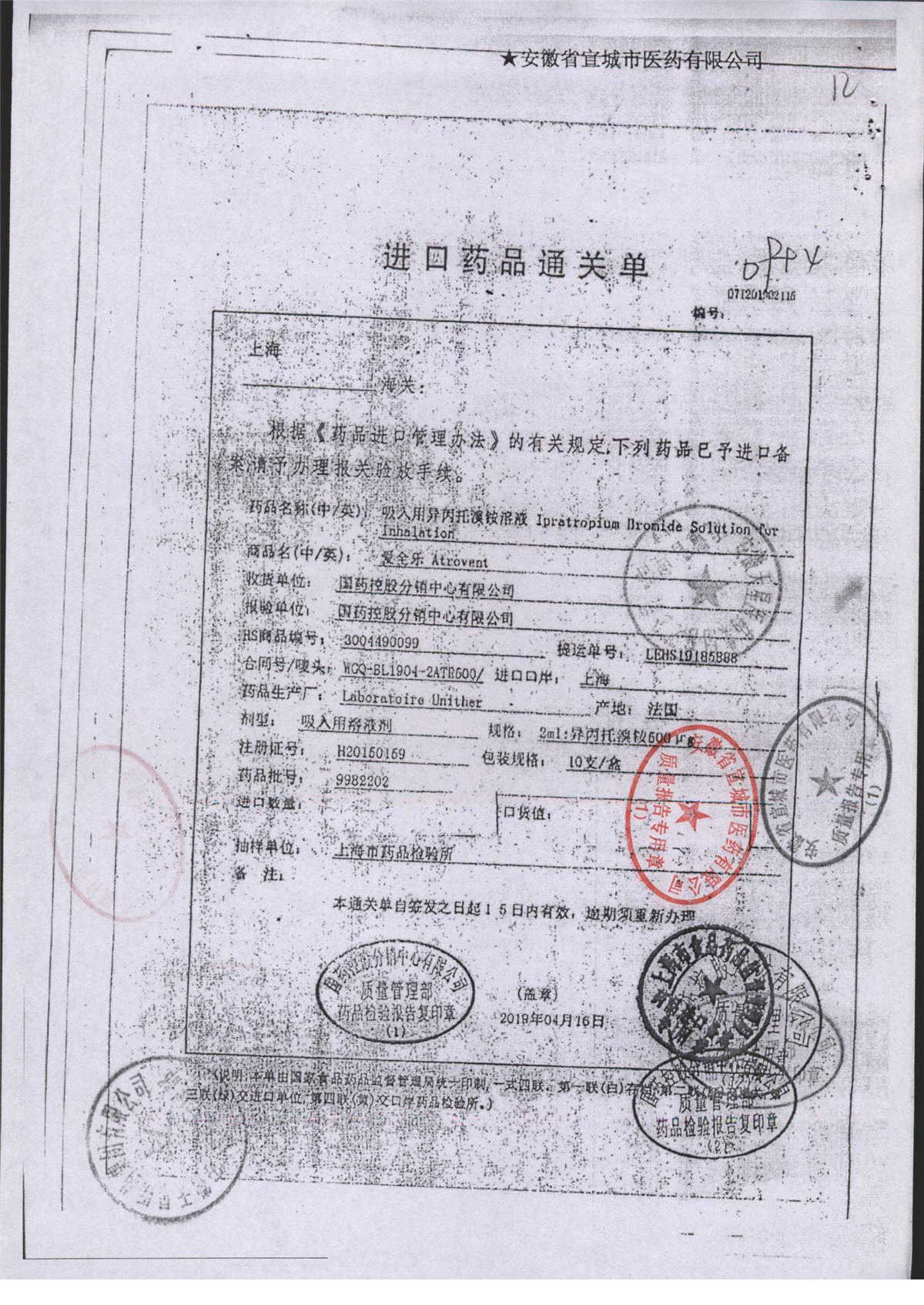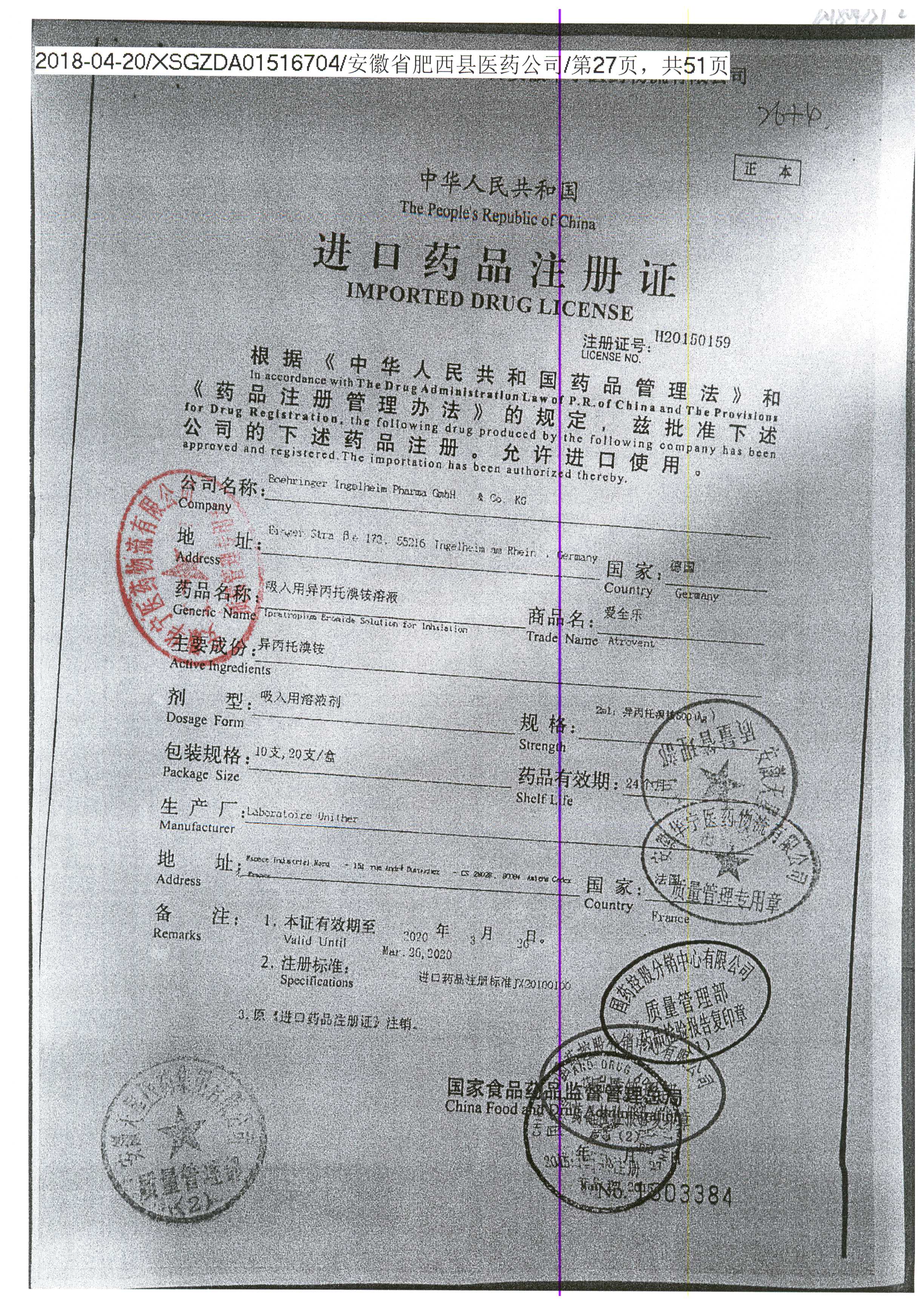 | 吸入用異丙托溴銨溶液 | 2ml*10支 | 7982044(注冊(cè)證) | 查看詳情 |