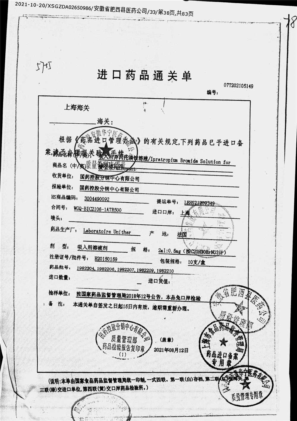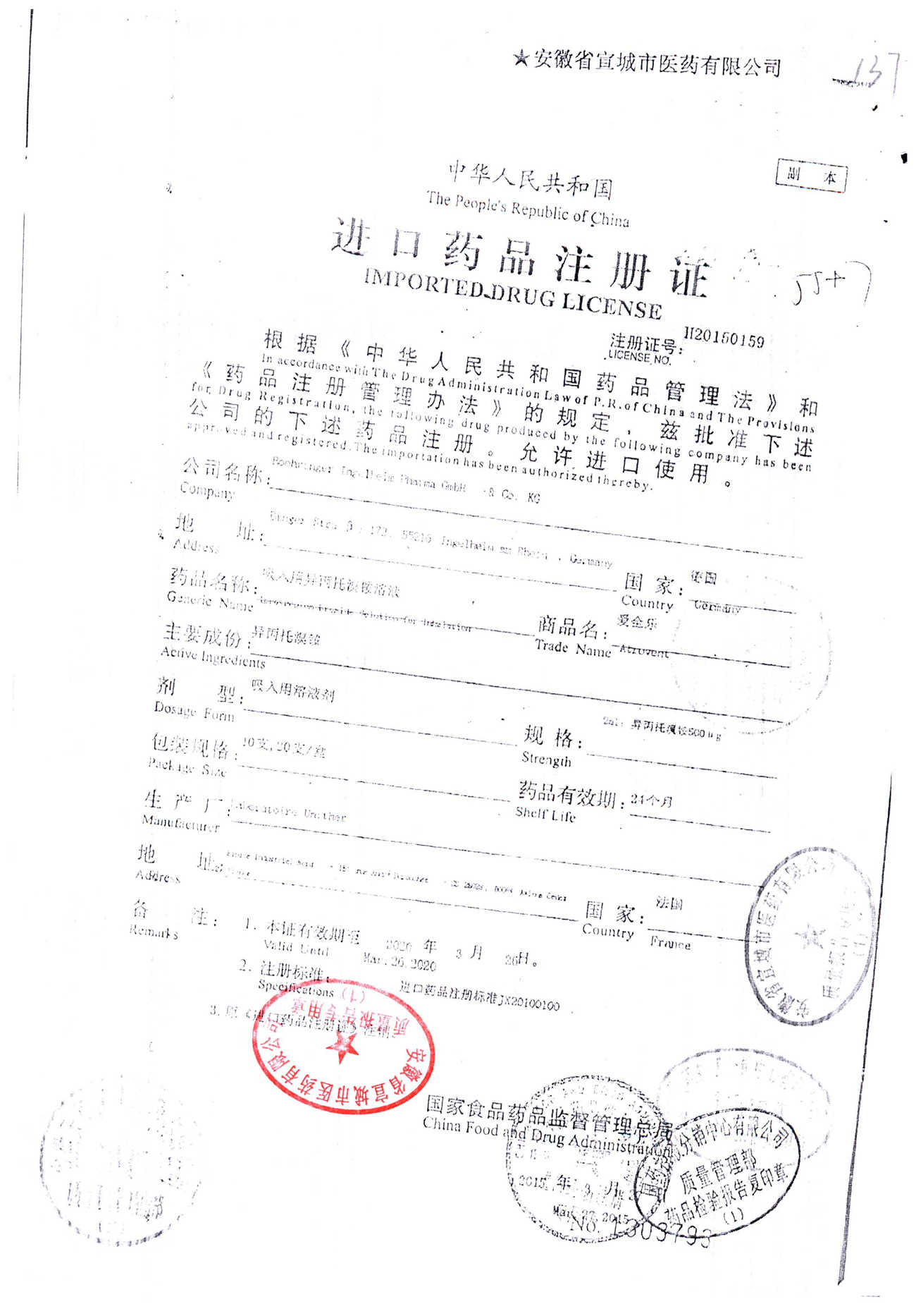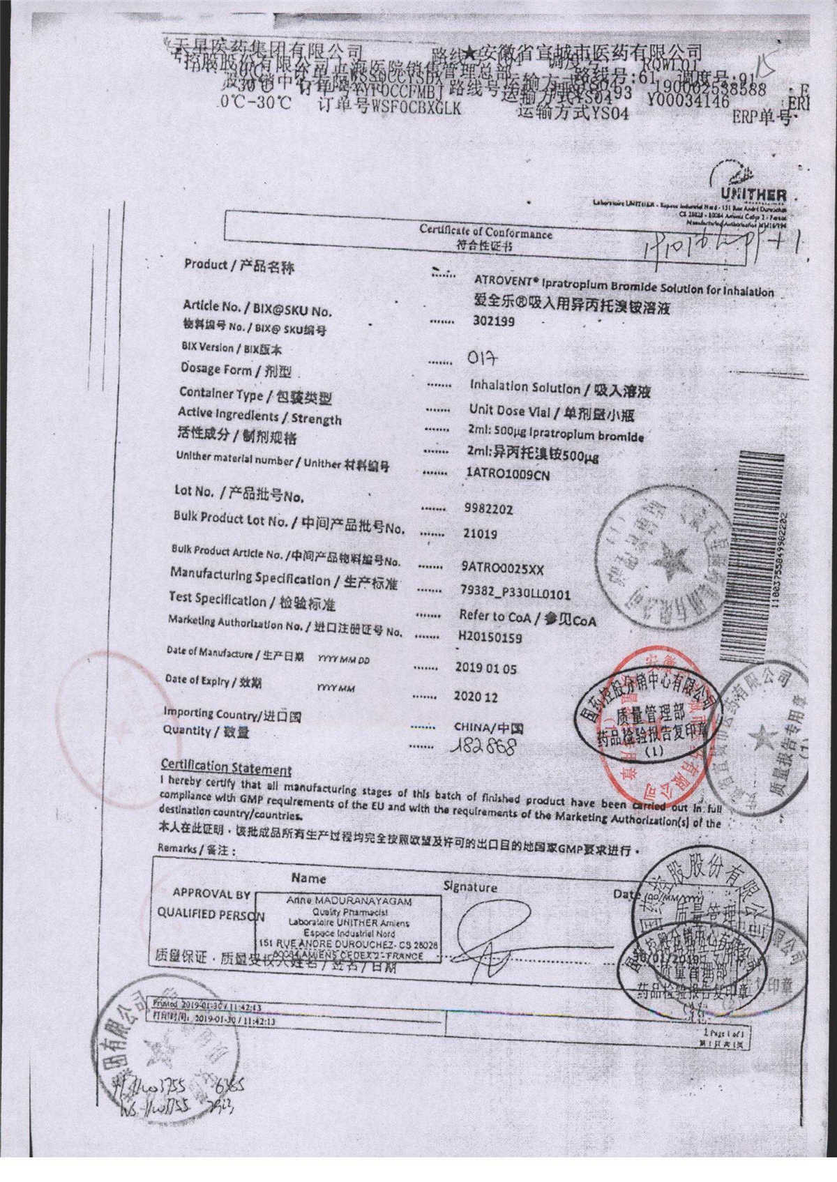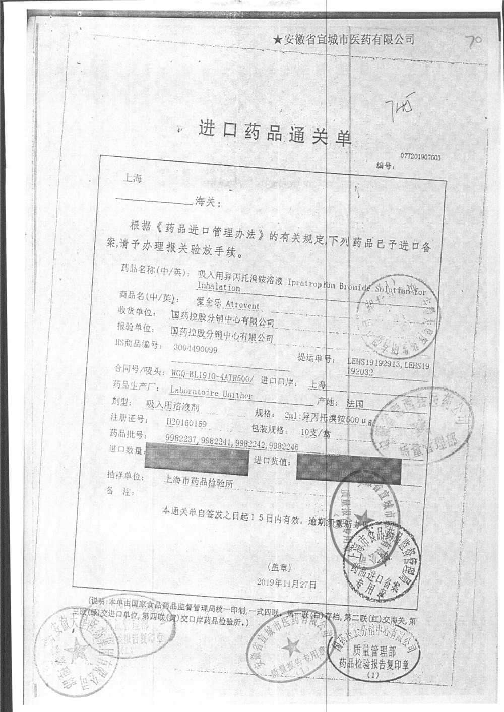 | 吸入用異丙托溴銨溶液 | 2ml*10支 | 7982044(注冊(cè)證) | 查看詳情 |