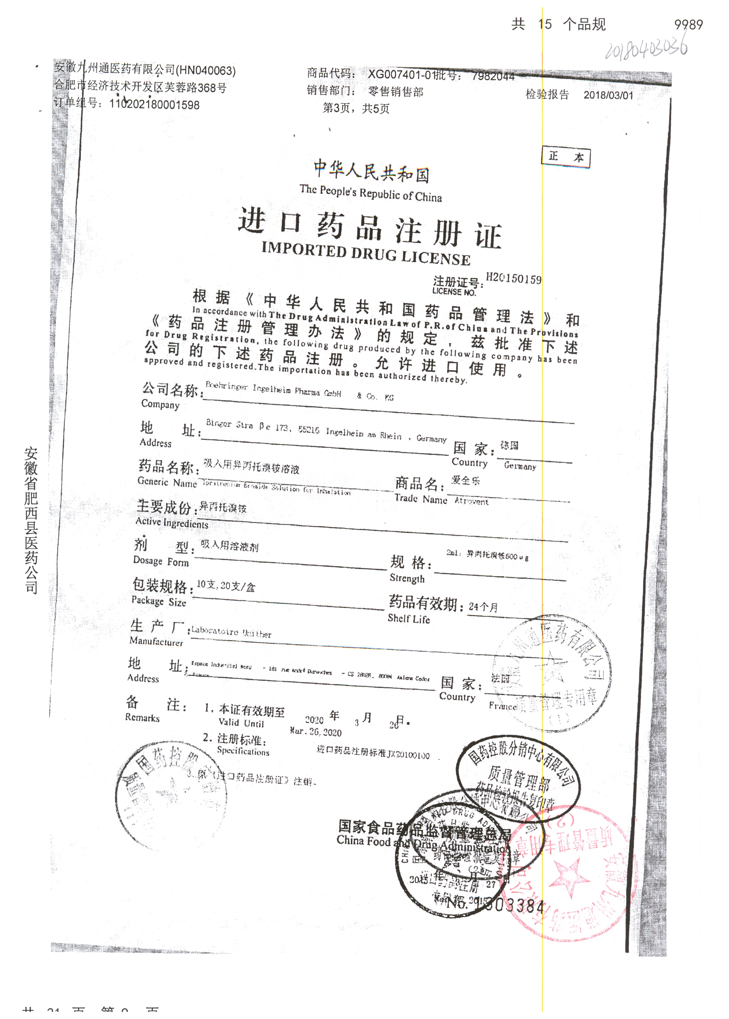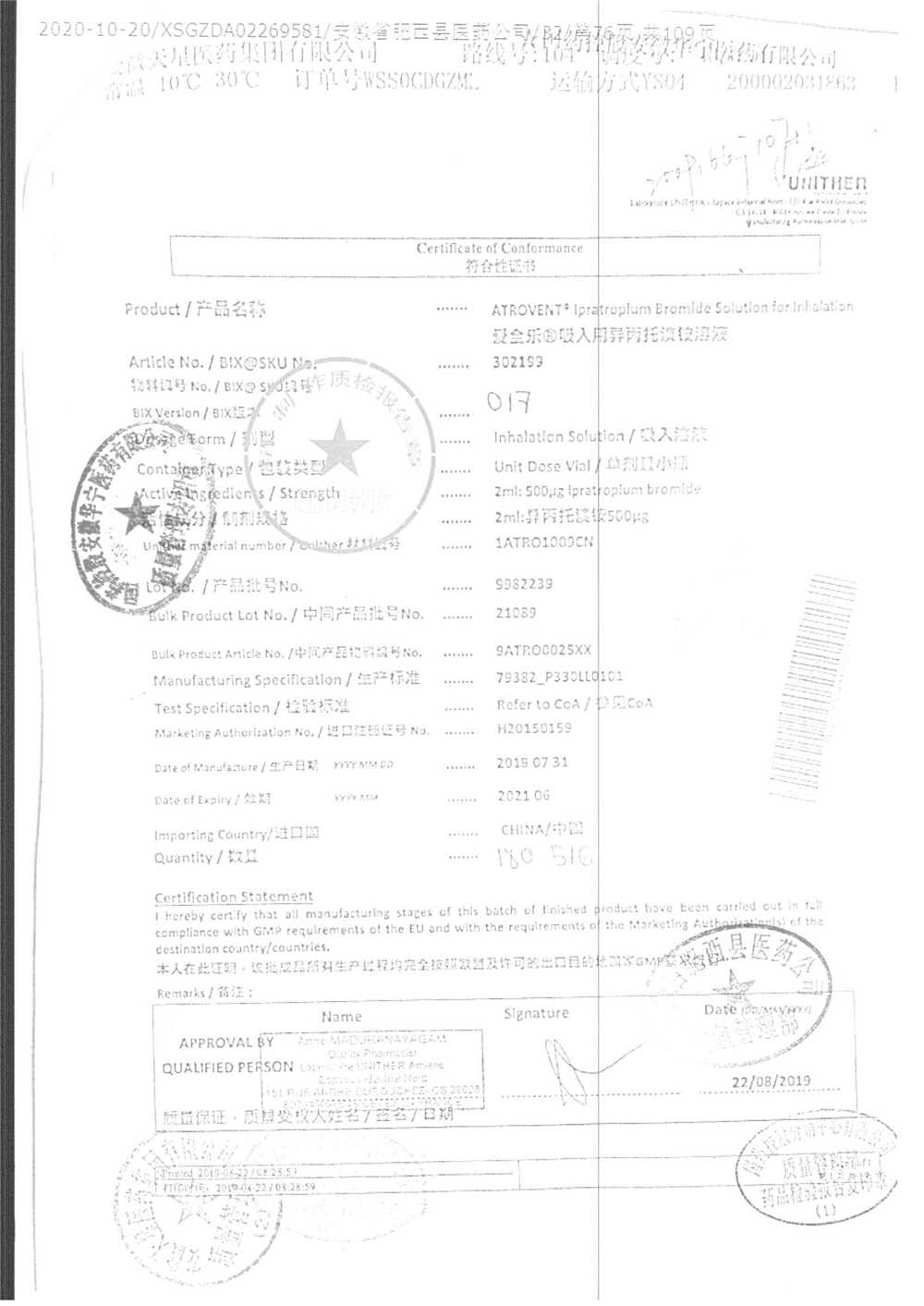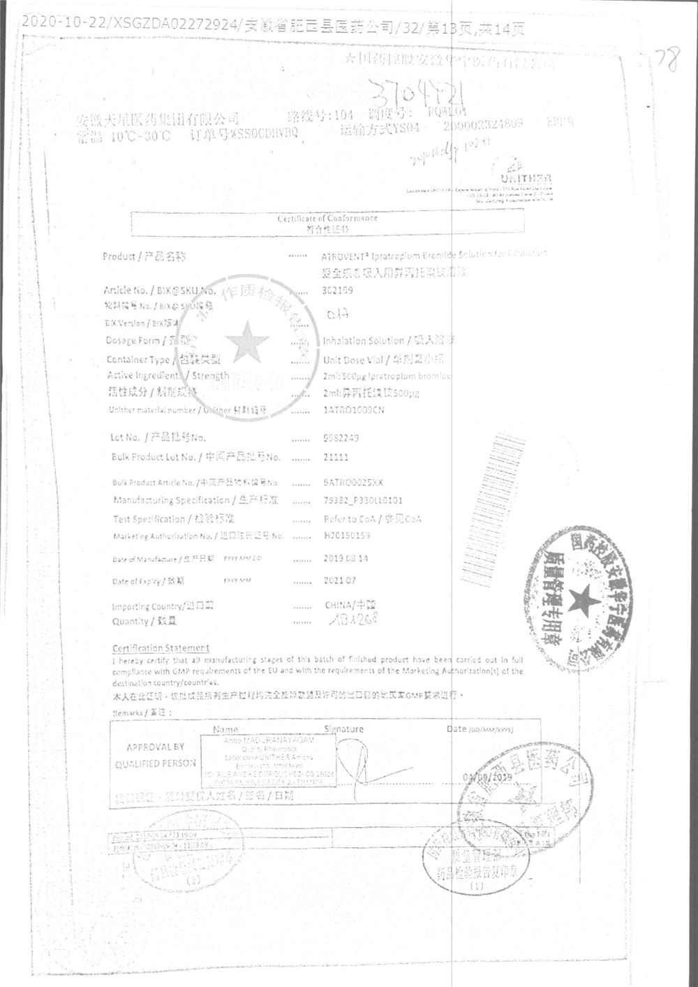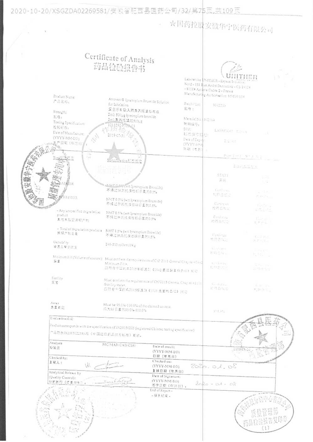 | 吸入用異丙托溴銨溶液 | 2ml*10支 | 7982044(注冊(cè)證) | 查看詳情 |