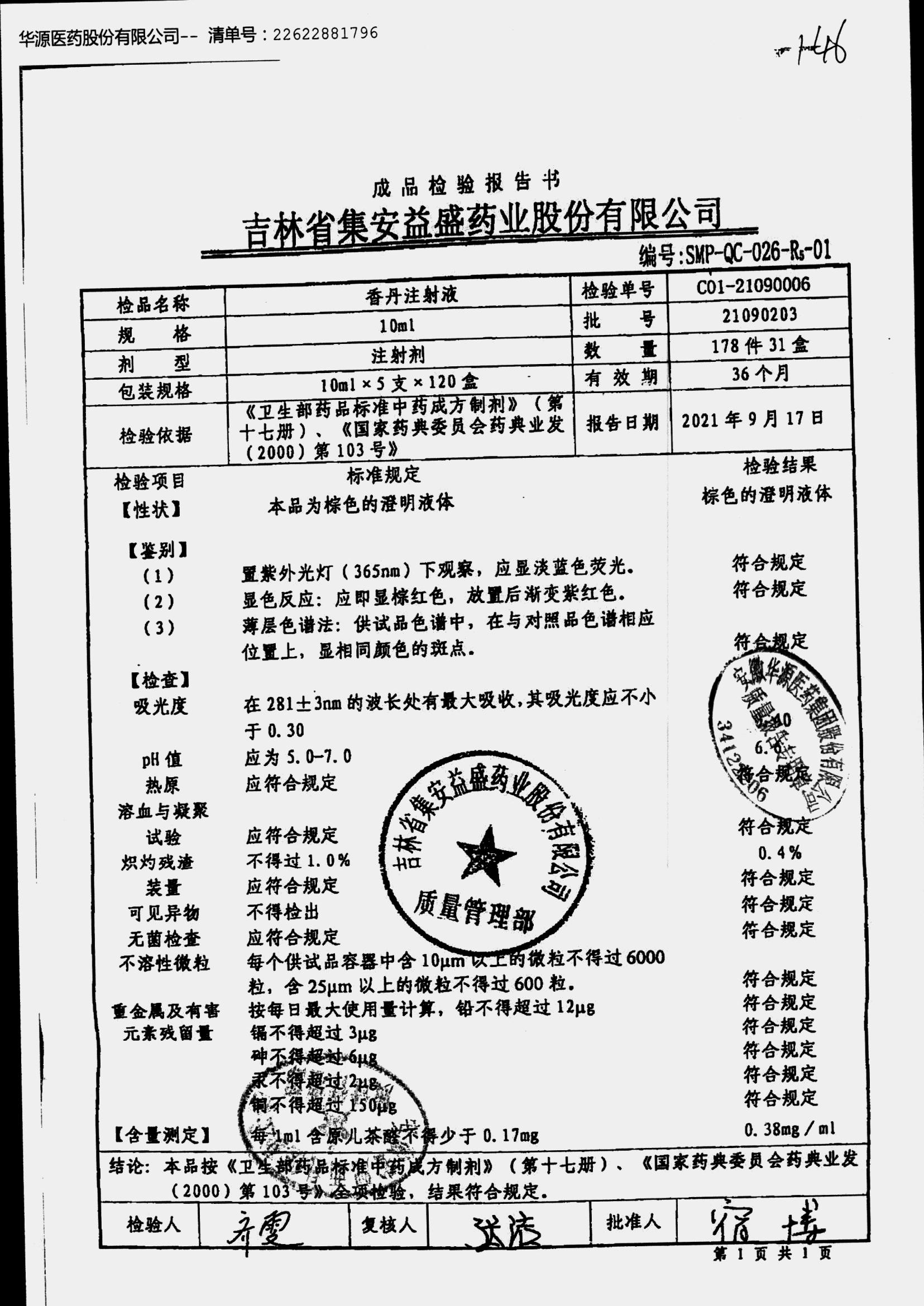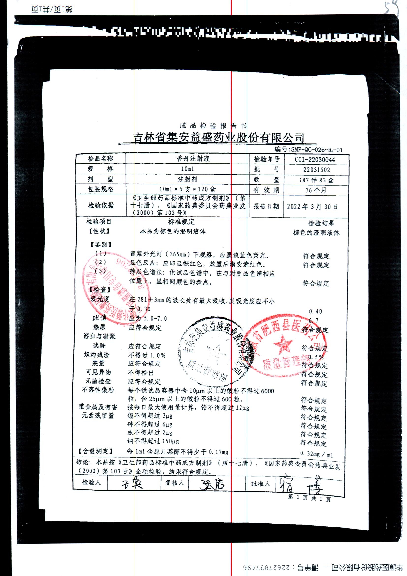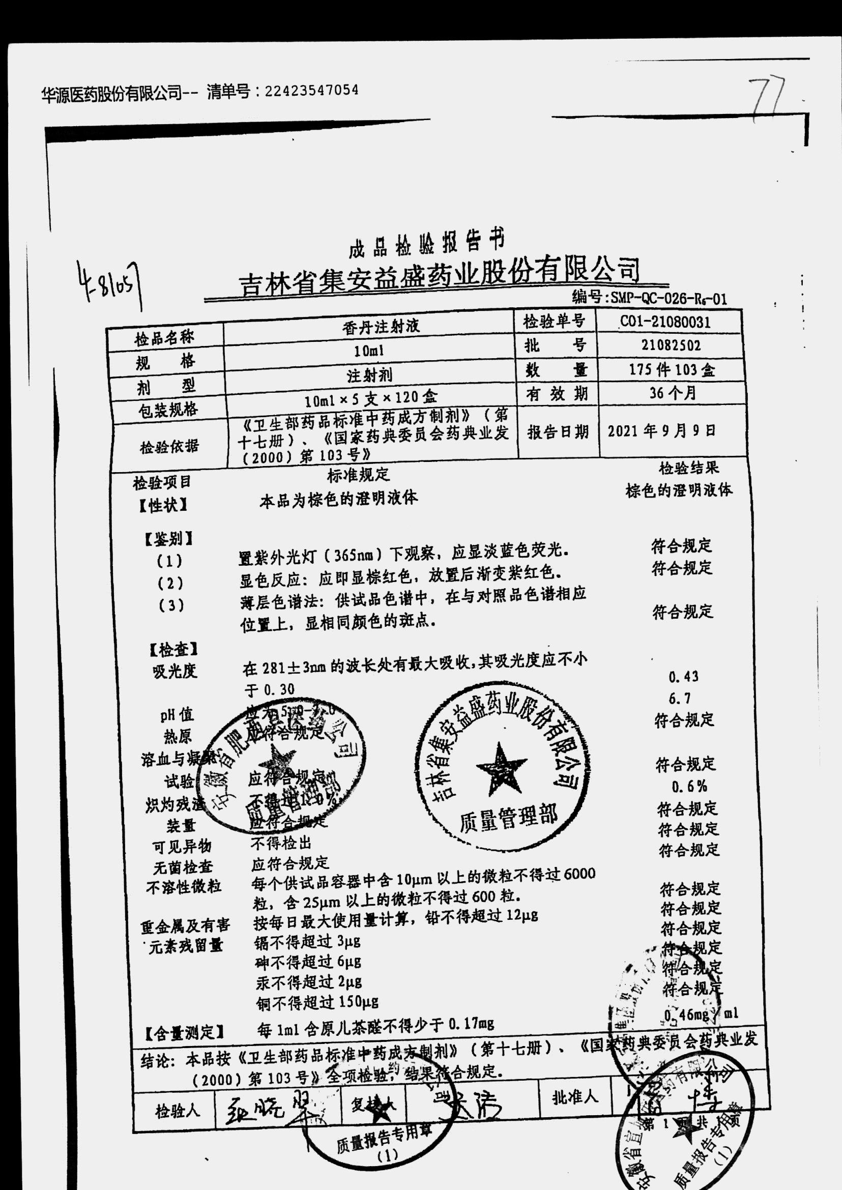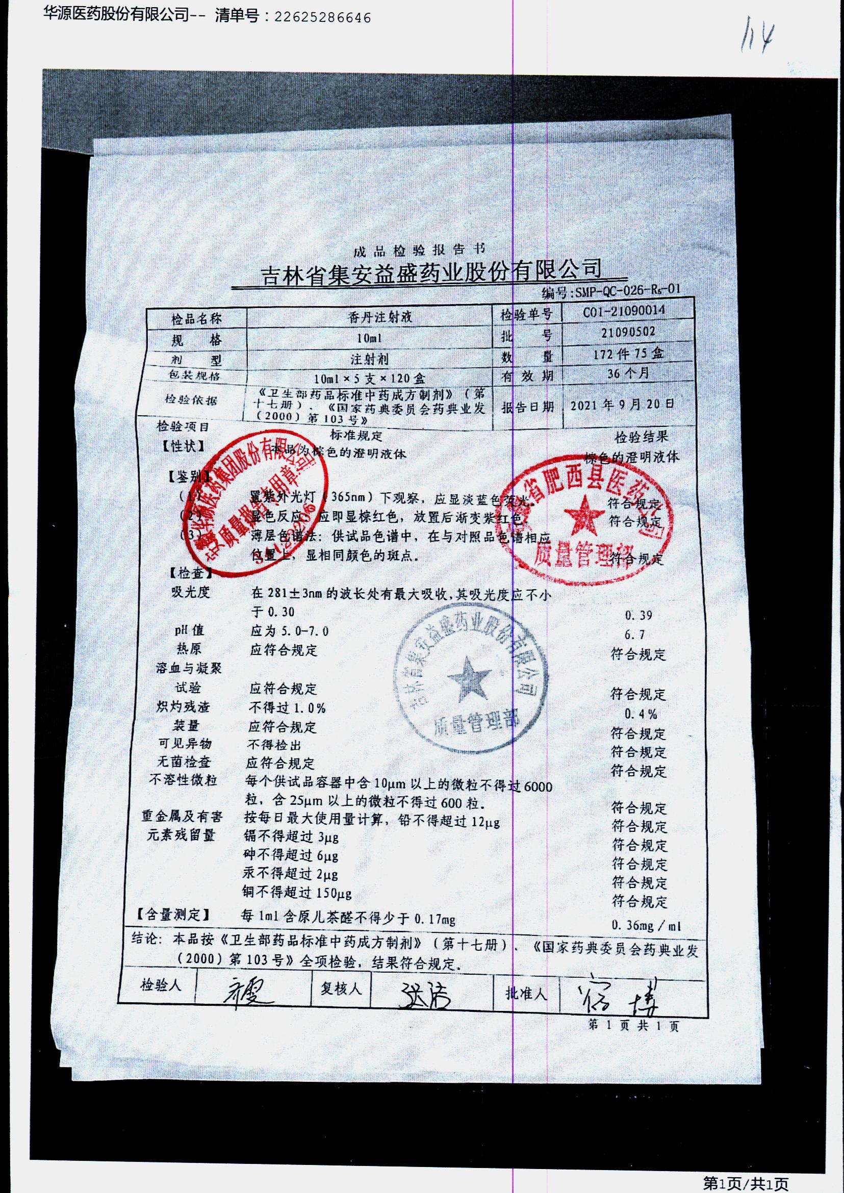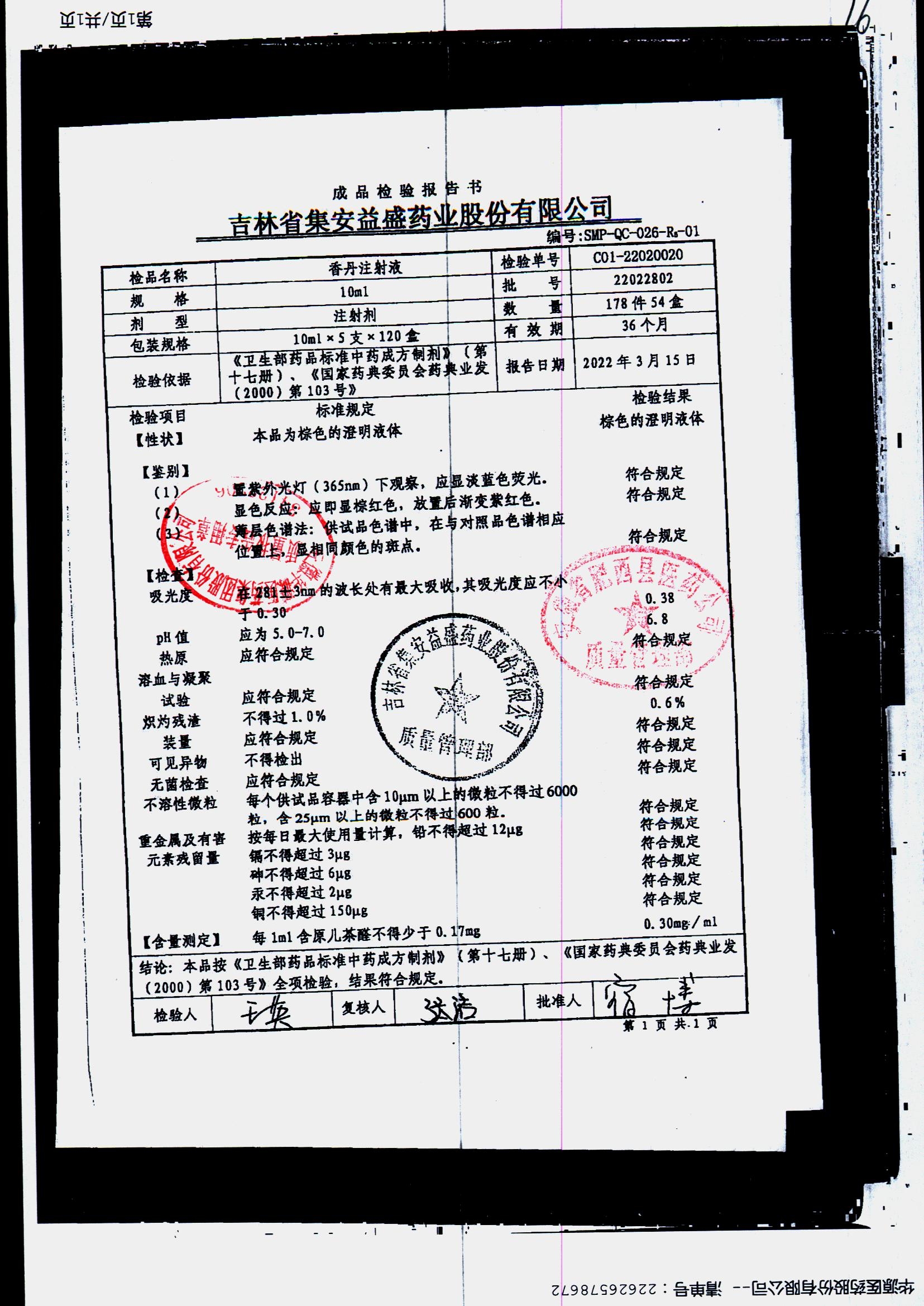 | 香丹注射液 | 10ml*5支 | 21090601 | 查看詳情 |