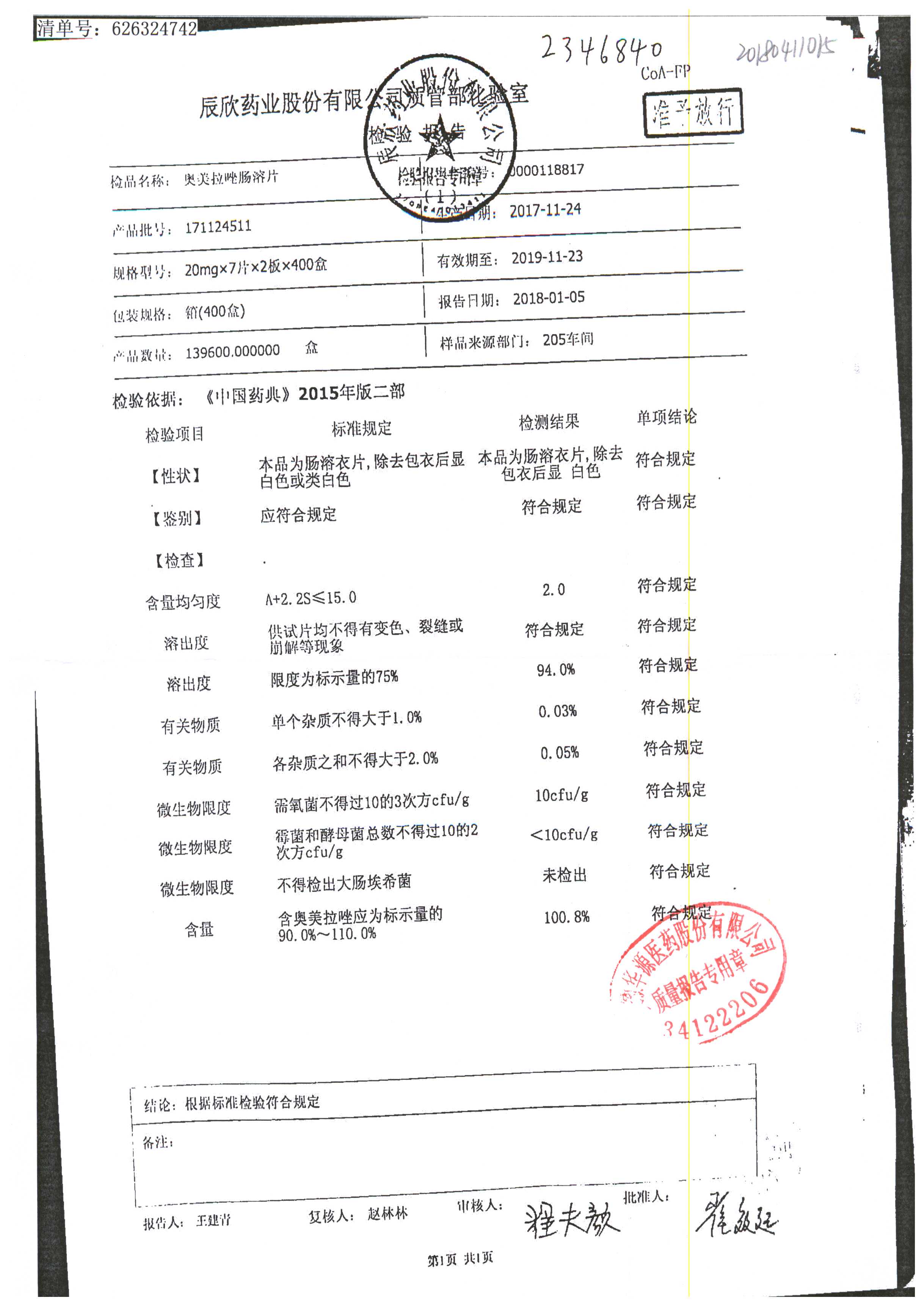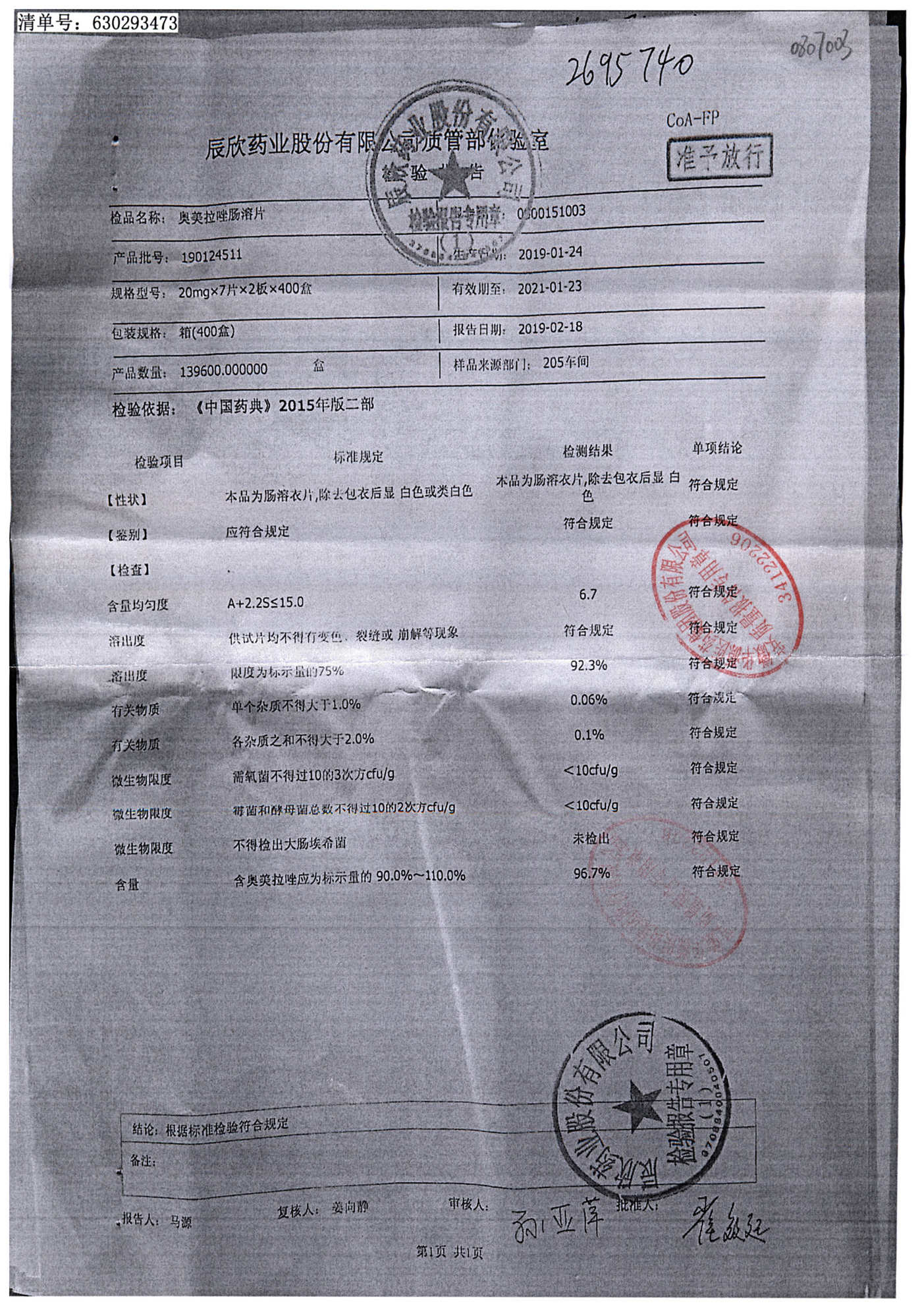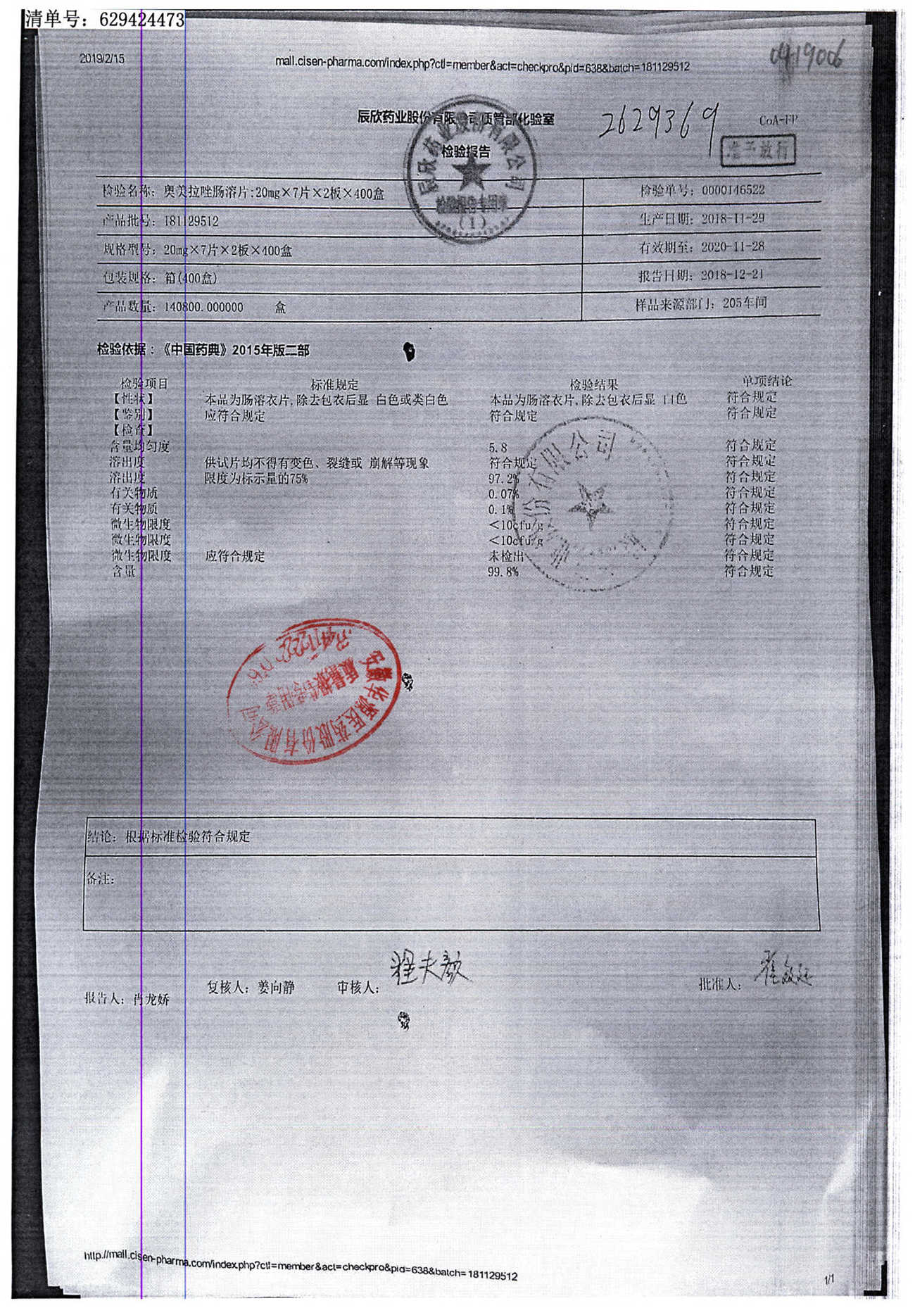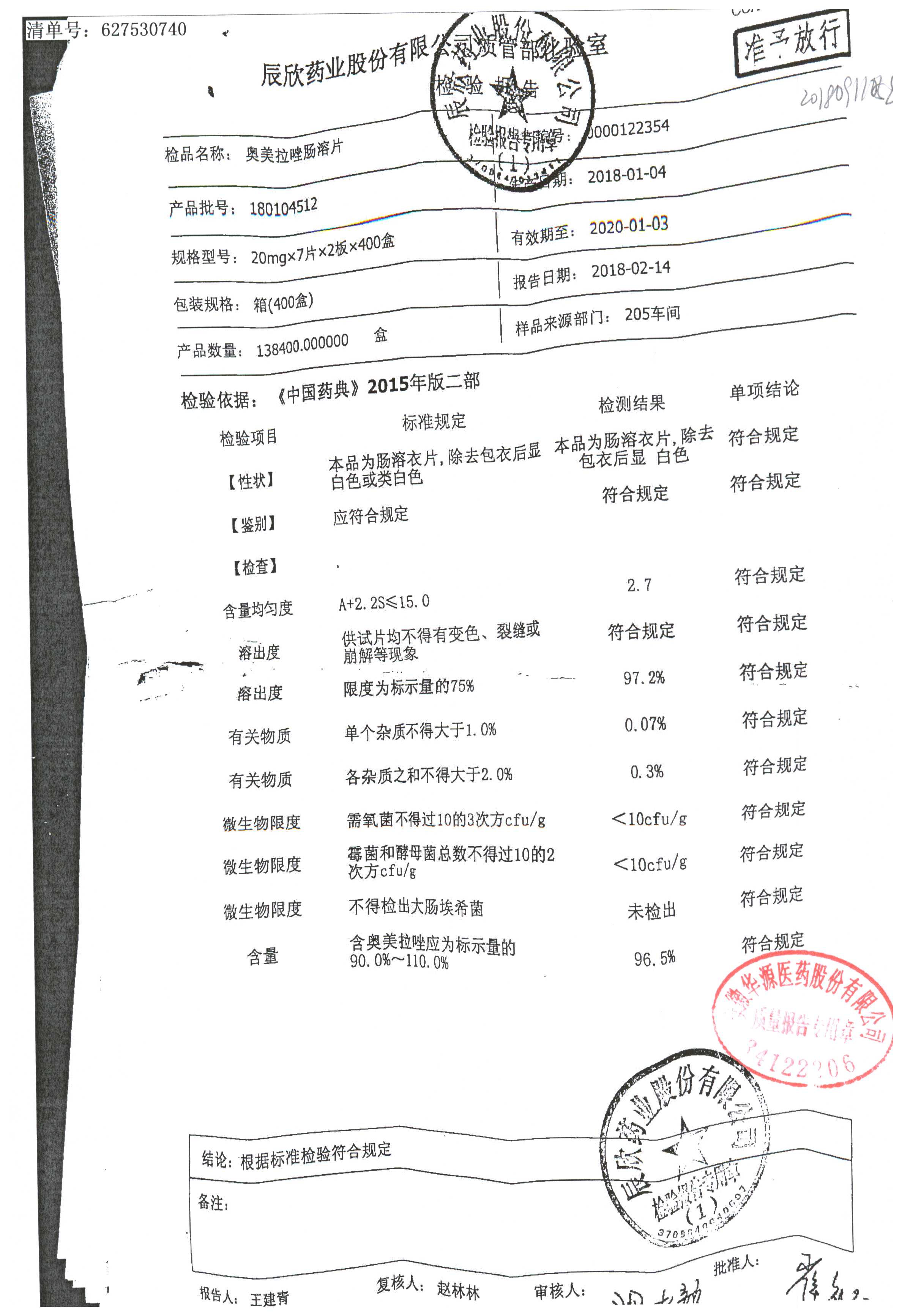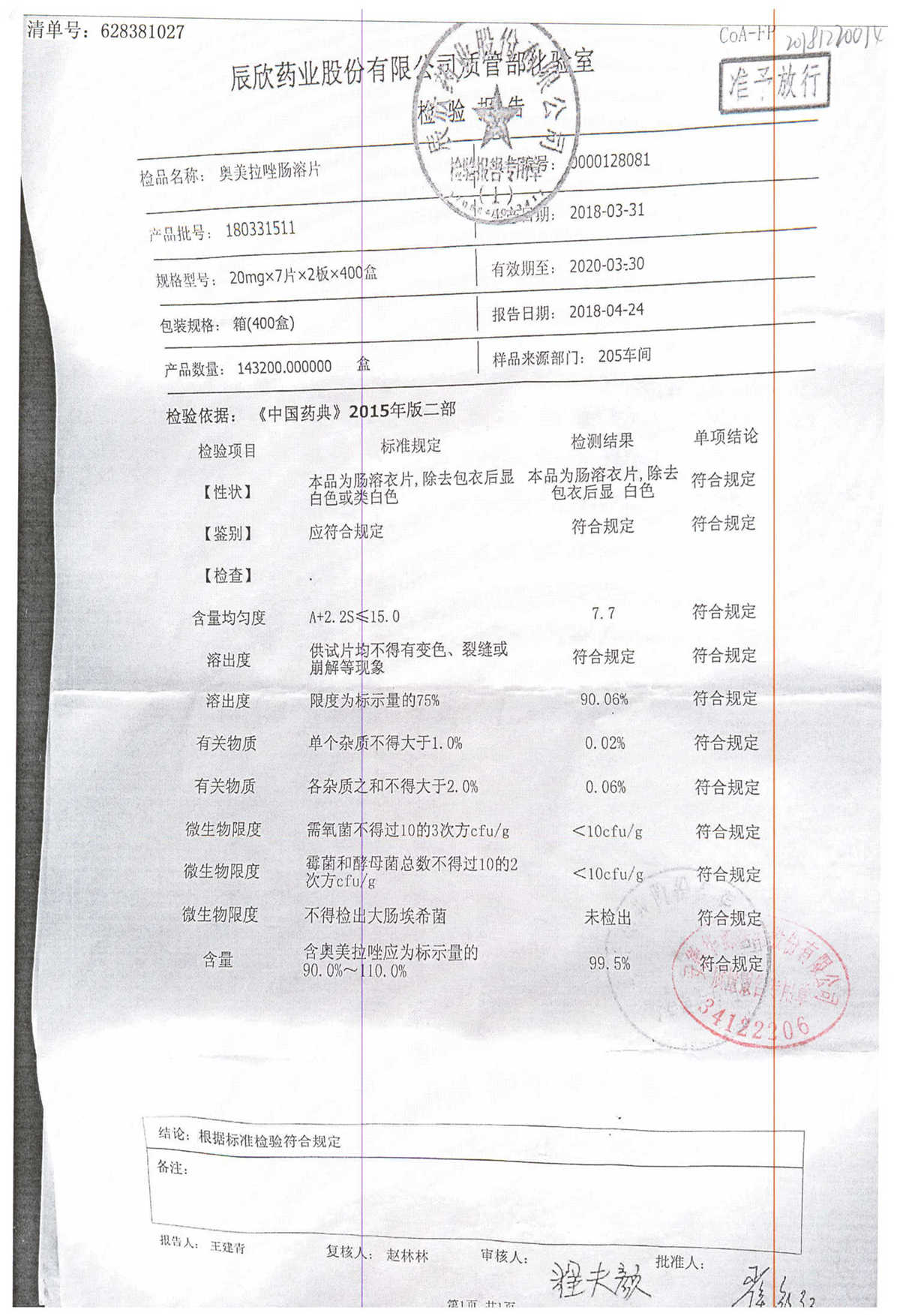 | 奧美拉唑腸溶片 | 20mg | 180331511 | 查看詳情 |