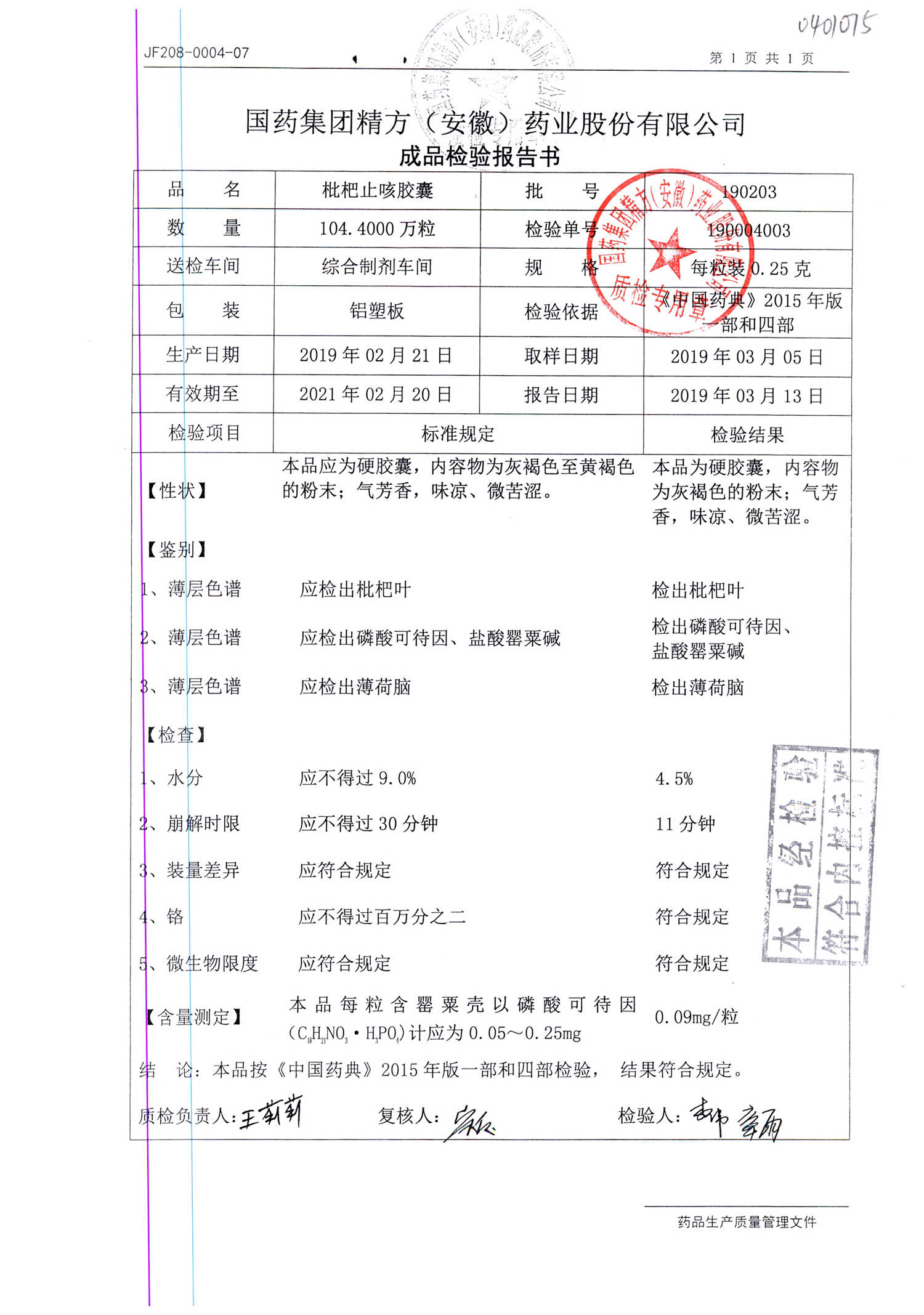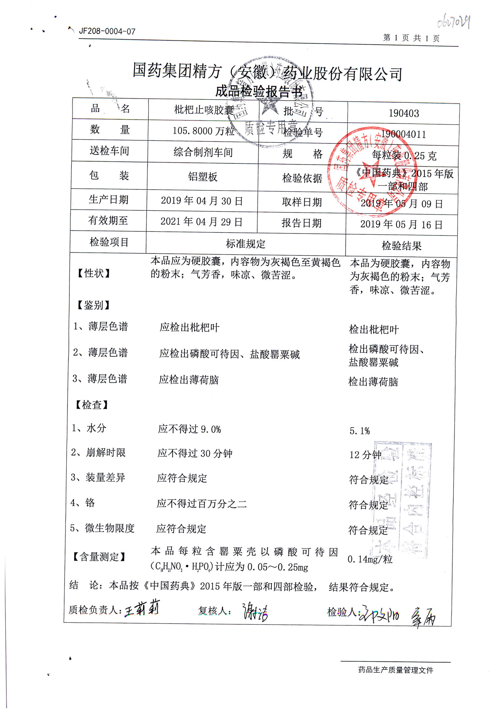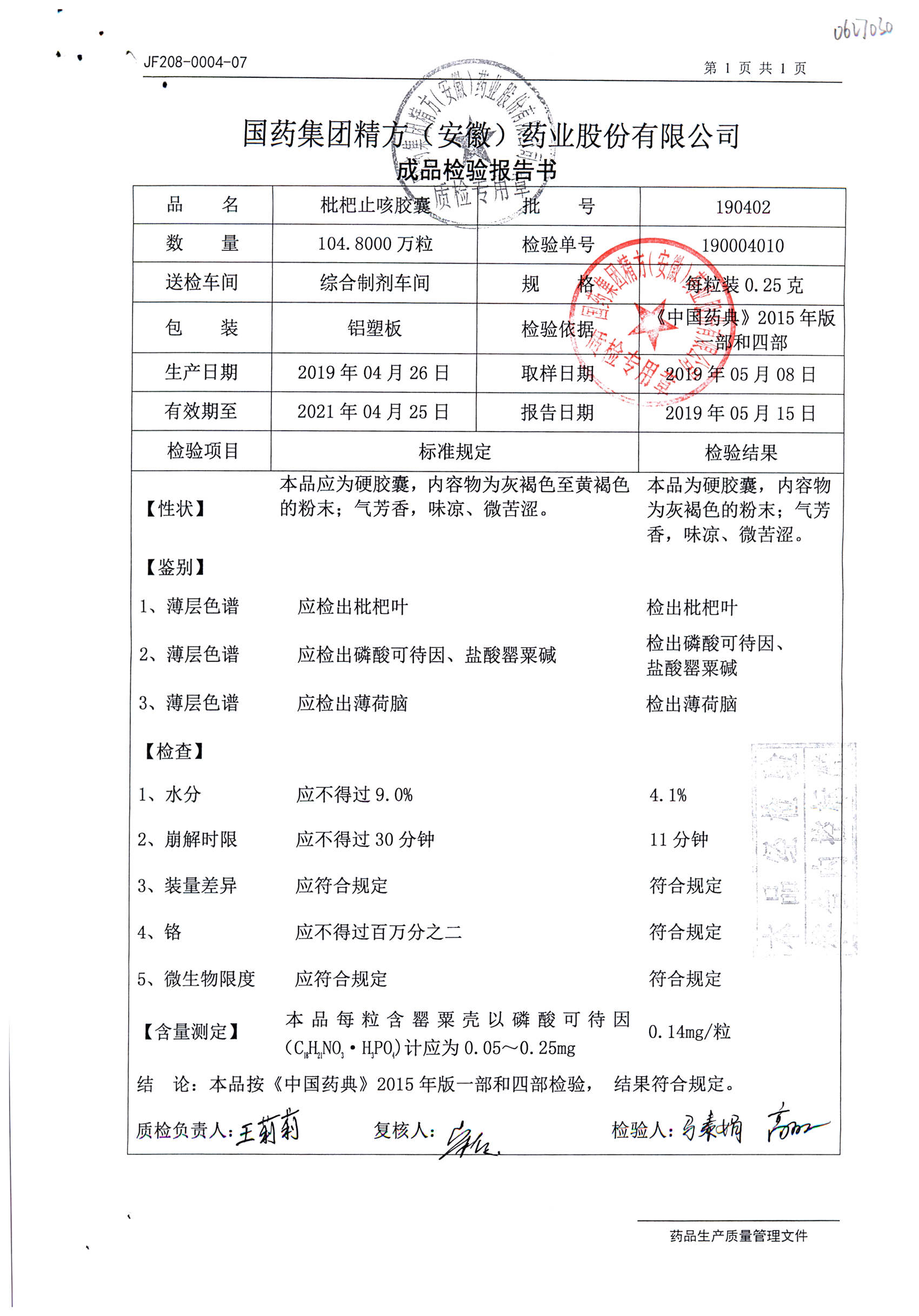 | 枇杷止咳膠囊 | 0.25g | 190405 | 查看詳情 |