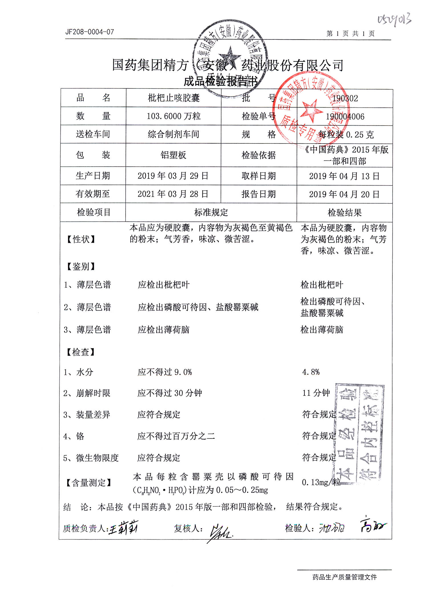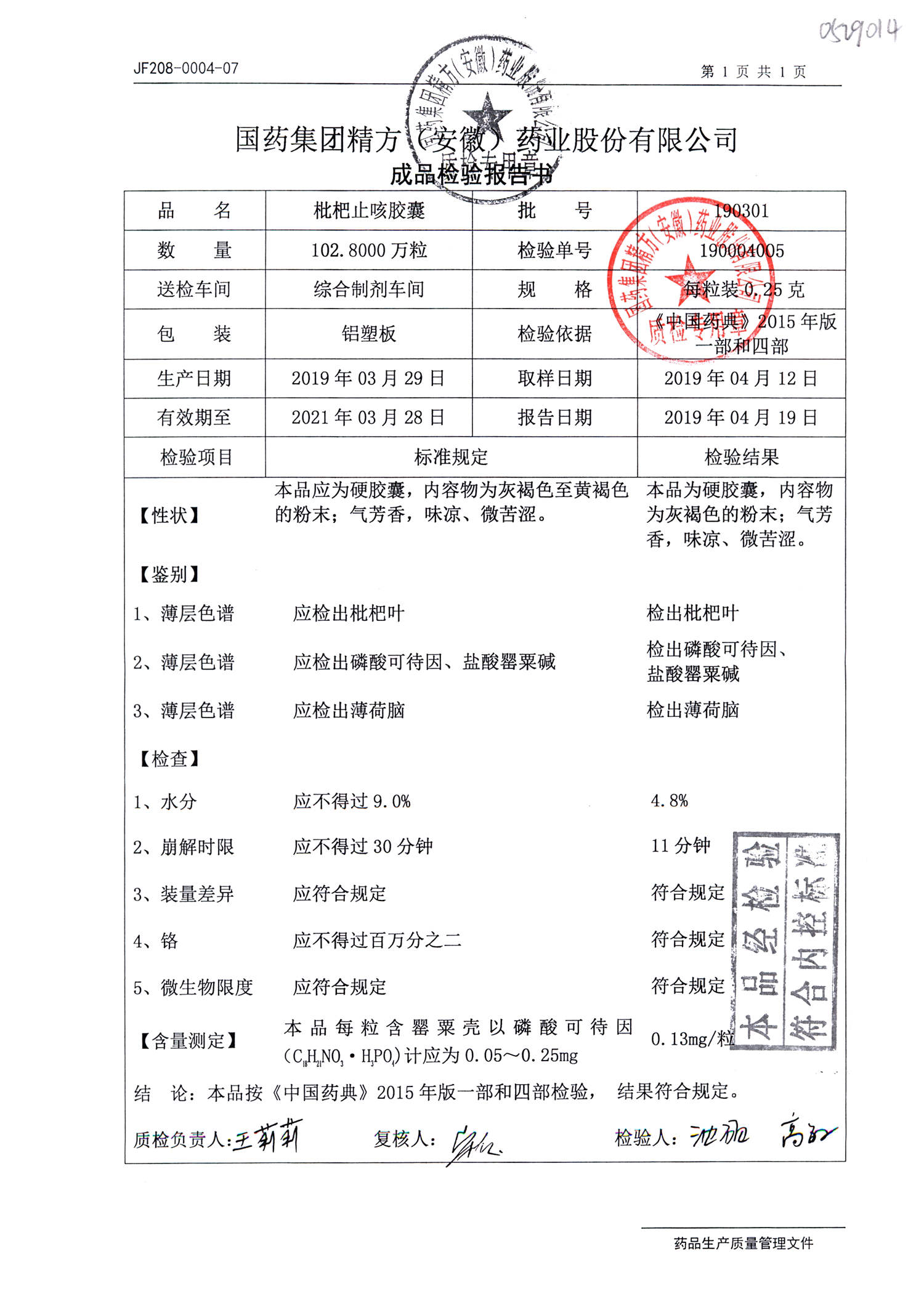 | 枇杷止咳膠囊 | 0.25g | 190403 | 查看詳情 |